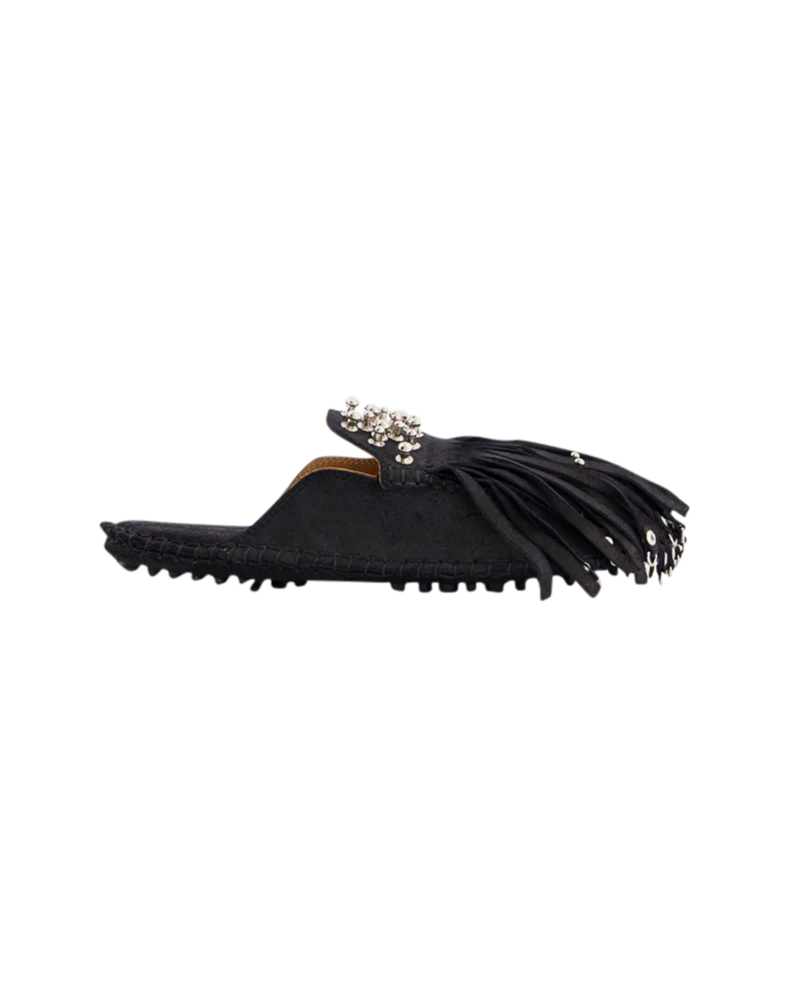 The Puli Pin Mule features metal nail and screw perforations, a quilted leather insole, and a flexible leather outsole with rubber studs. The insole is embossed with the 13 09 SR logo. Each pair is hand-decorated, making each piece unique, with slight colour variations due to the artisanal process.