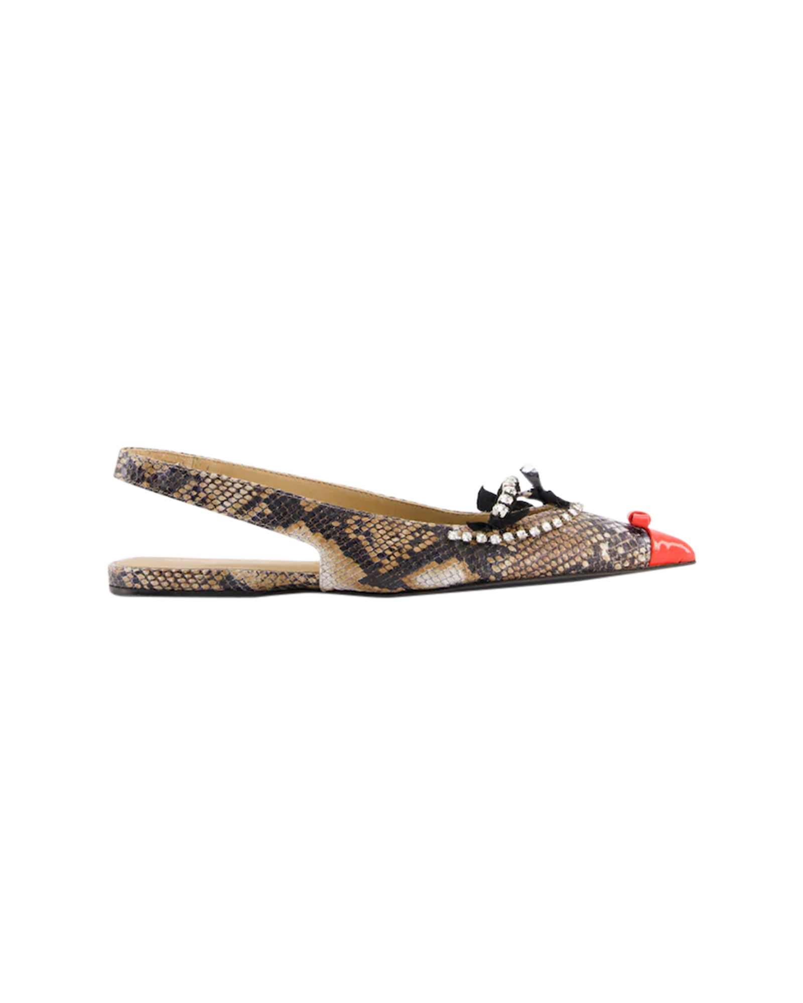 • The Miky Slingbacks made in Italy, is a pointed ballerina with an open heel. The Slingbacks are hand-embellished with recycled ribbons, Italian fabric scraps and crystals. The Miky Slingbacks are knotted and decorated by hand using an artisanal process. Each piece is unique. Made in Italy.
