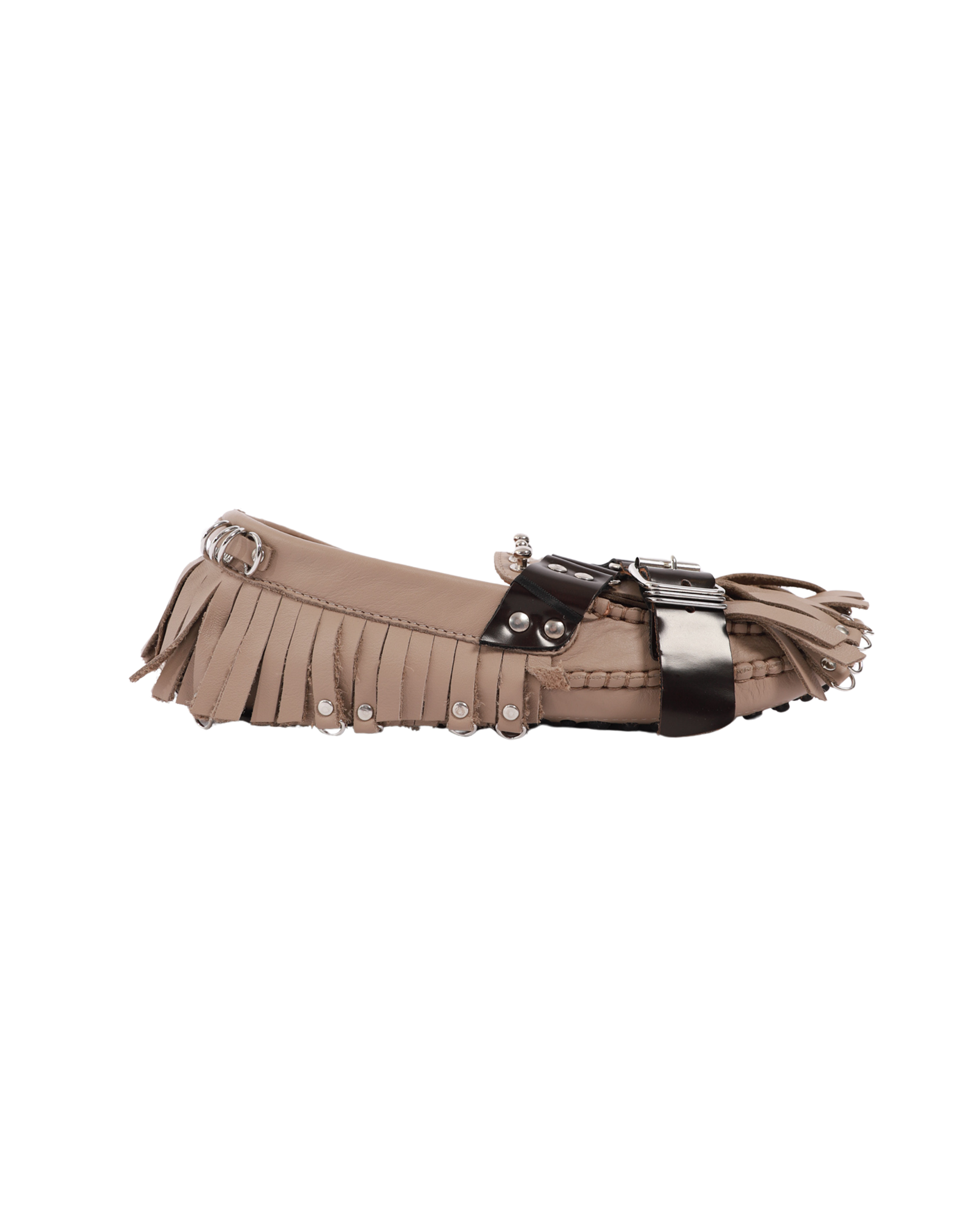 The Puli Strap Moccasin is a slip-on style featuring perforated metal detailing and a handmade puli strap, making each pair unique. The insole is embossed with the logo, and the shoes are crafted in Romania.