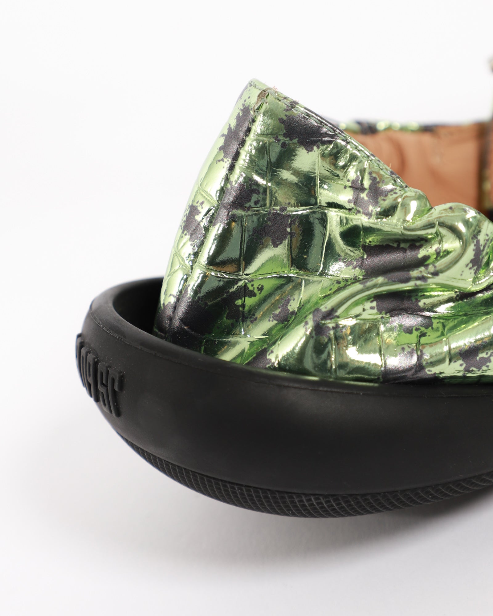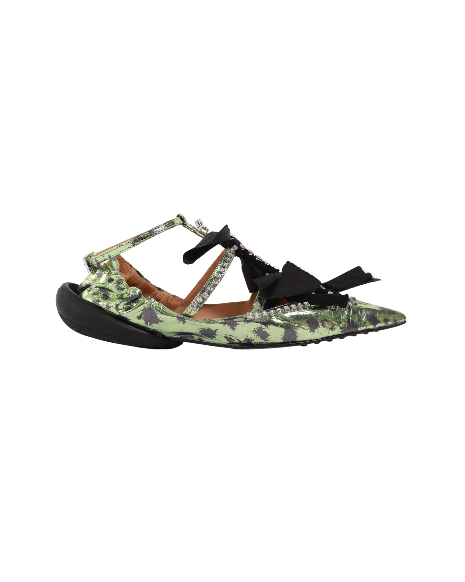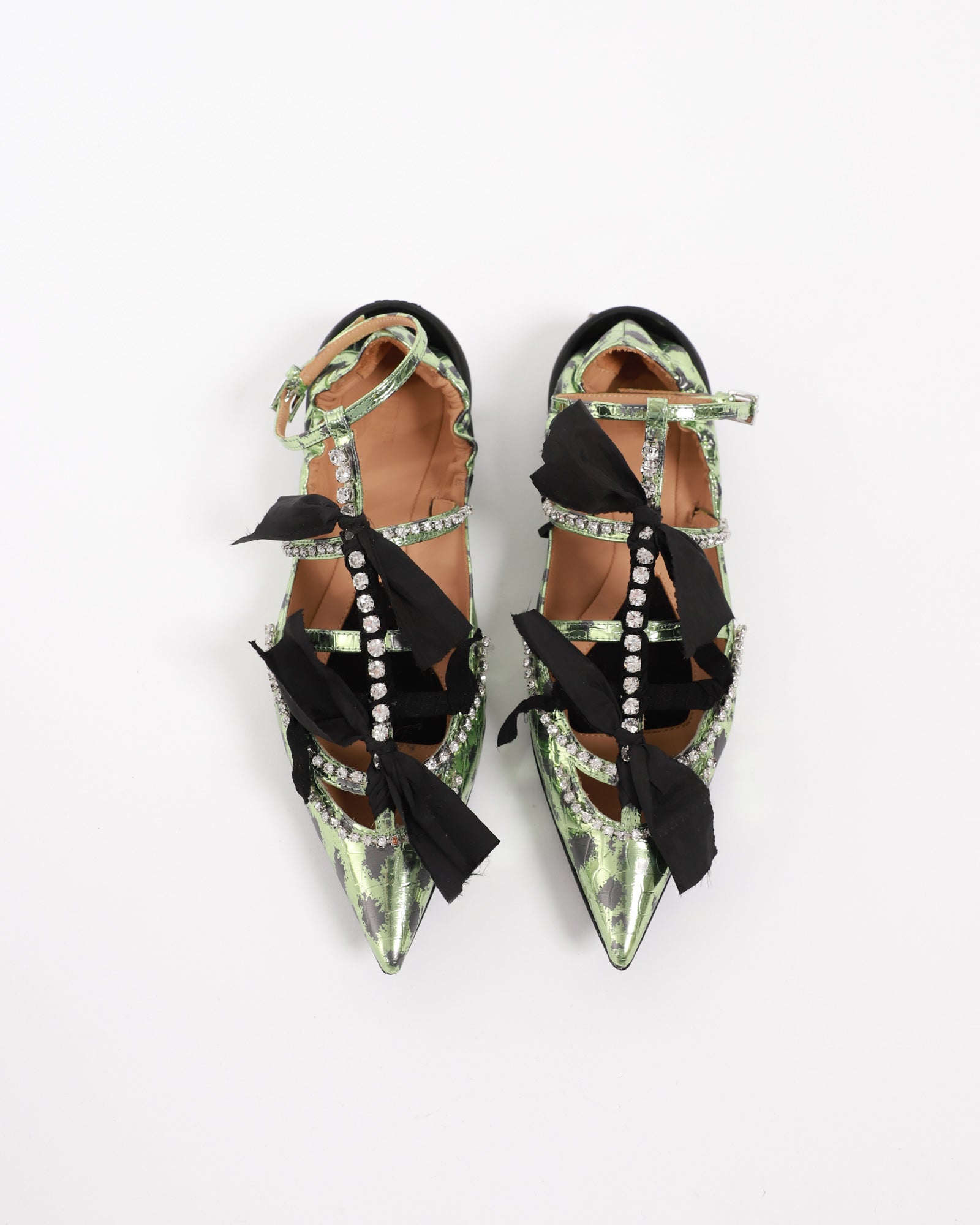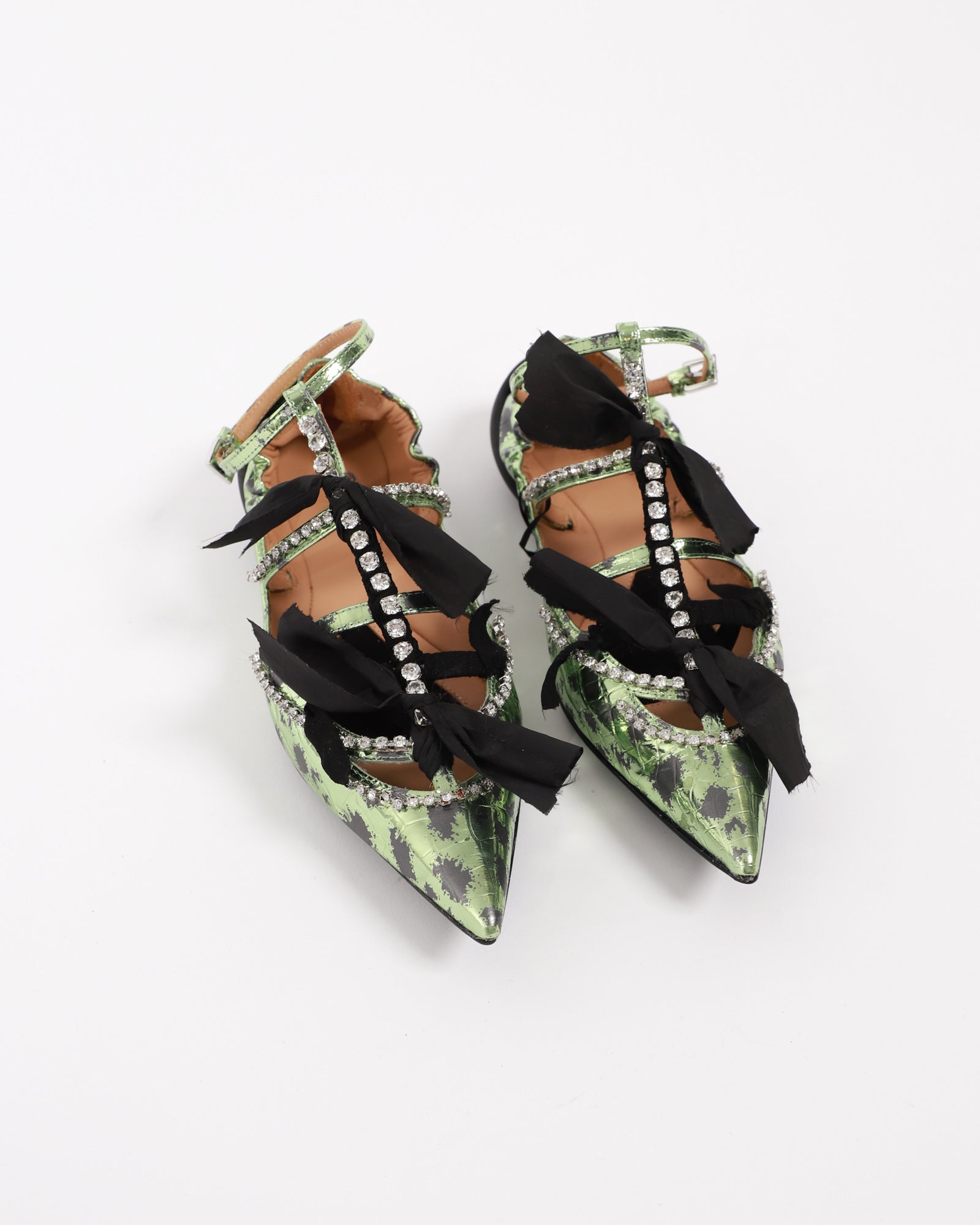 The Tootsy Ballet Flat is meticulously hand-decorated with recycled ribbons, Italian fabric scraps, and sparkling crystals. Designed with a pointed toe, buckle accents, and a thermo-moulded rubber heel embossed with the 13 09 SR logo.