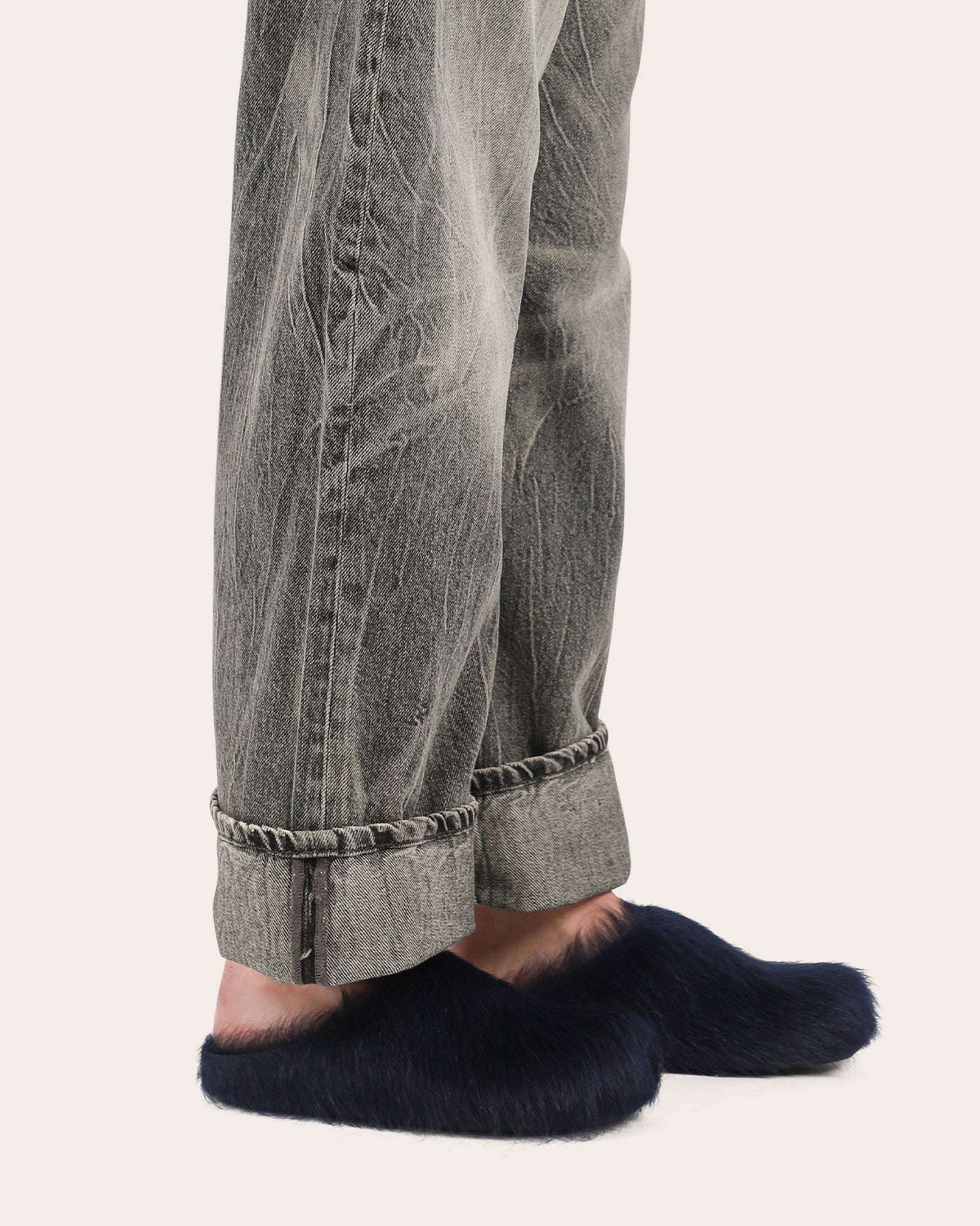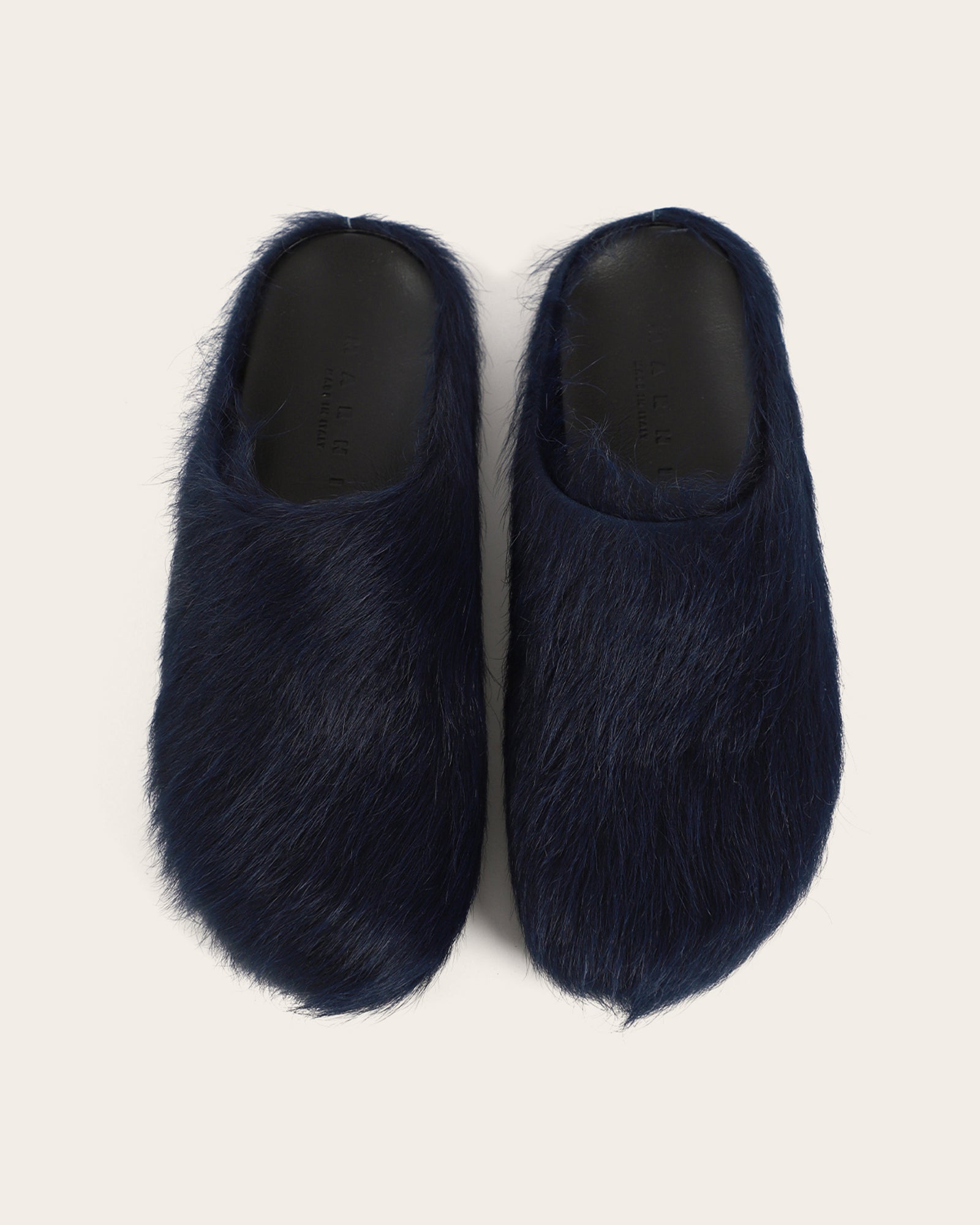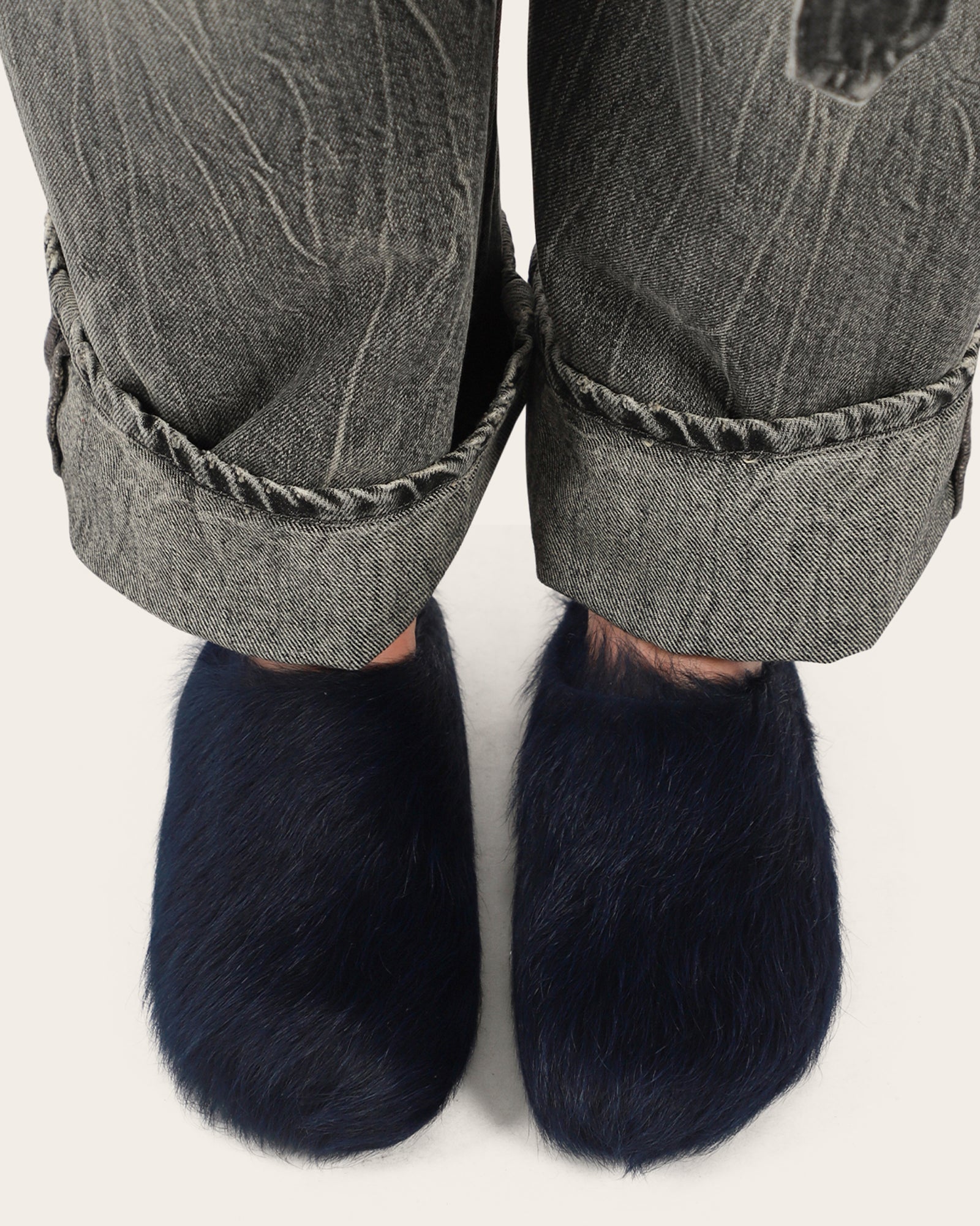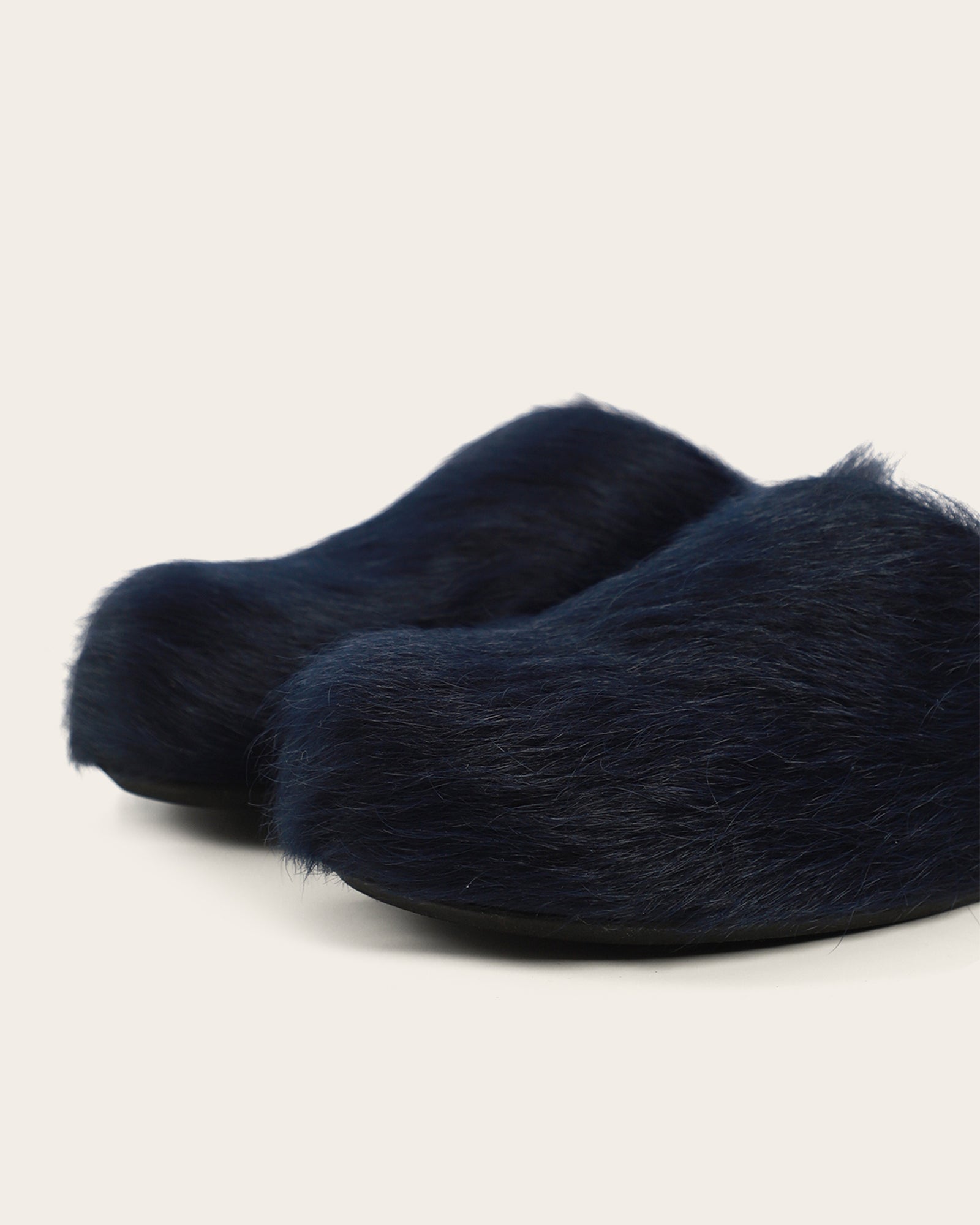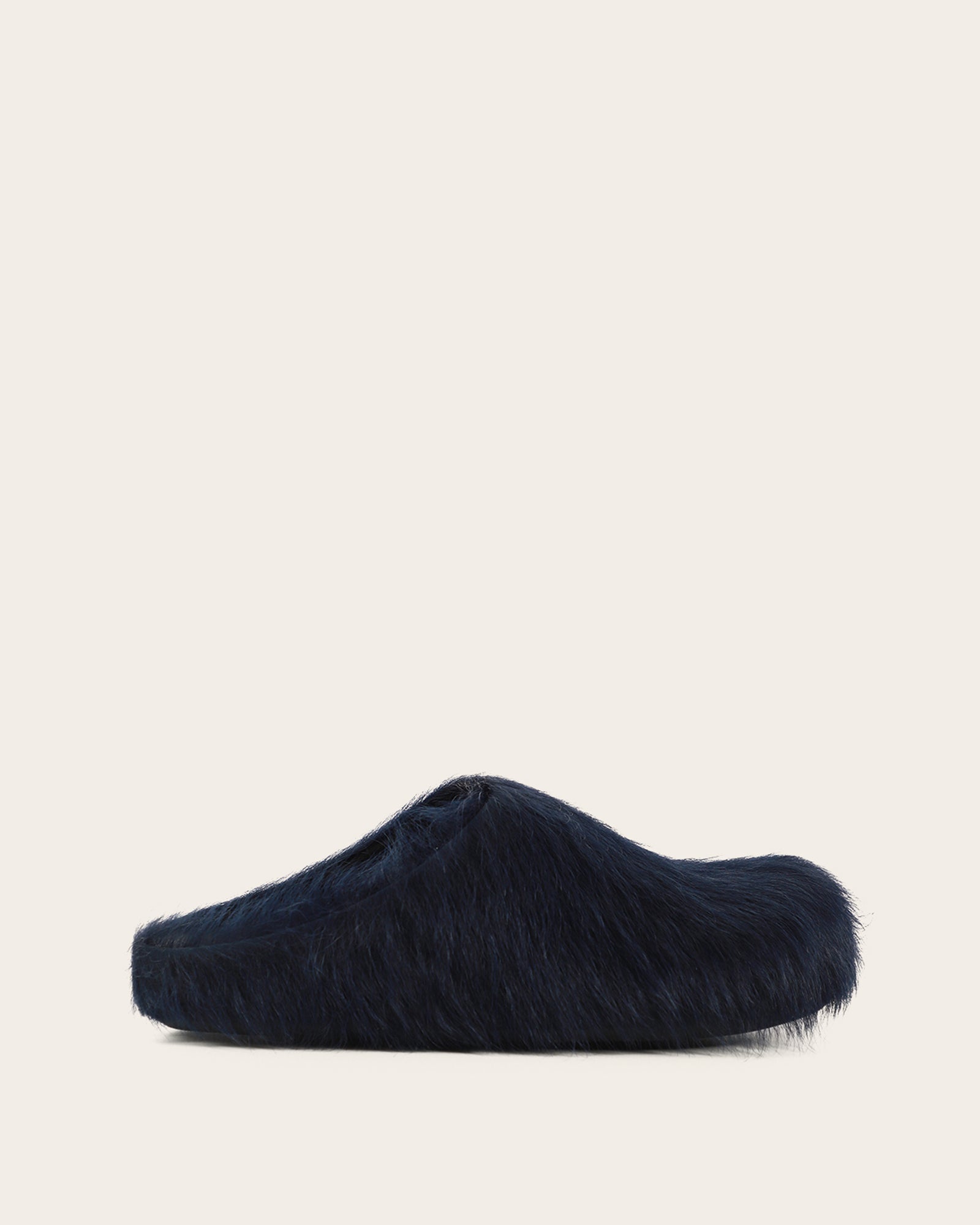 Fussbett Sabot crafted from long-hair leather, designed to evoke a natural, barefoot sensation. Features a leather Fussbett insole for comfort and a ribbed rubber outsole for traction. Made in Italy.