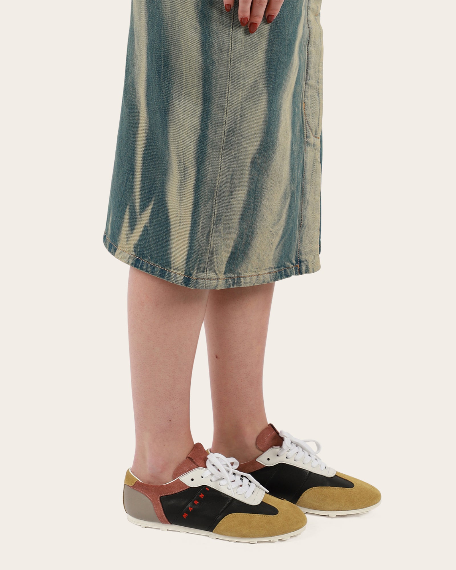 These comfortable sneakers, feature different cuts of leather and colours, brand name in red on the side, bright white laces and a round toe.