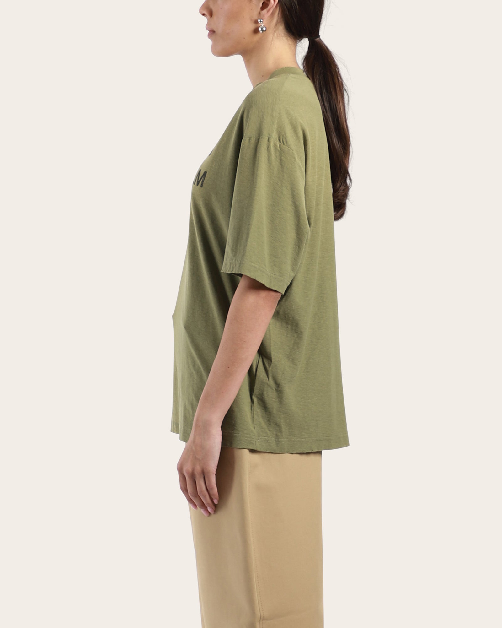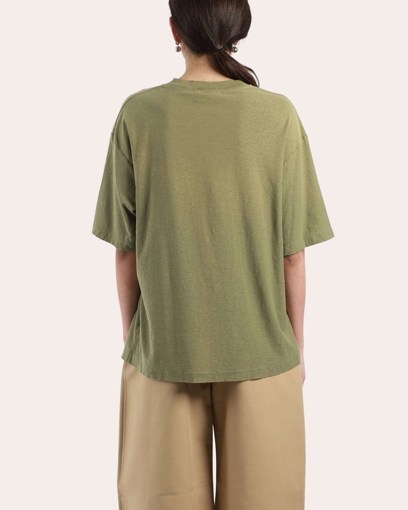 A crew neck t-shirt cut to a relaxed, unisex fit. It is detailed with a stamped logo at the chest, a distressed neckline, cuffs and bottom hem, and is made from organically grown cotton with a sprayed vintage finish. Made in Portugal.
