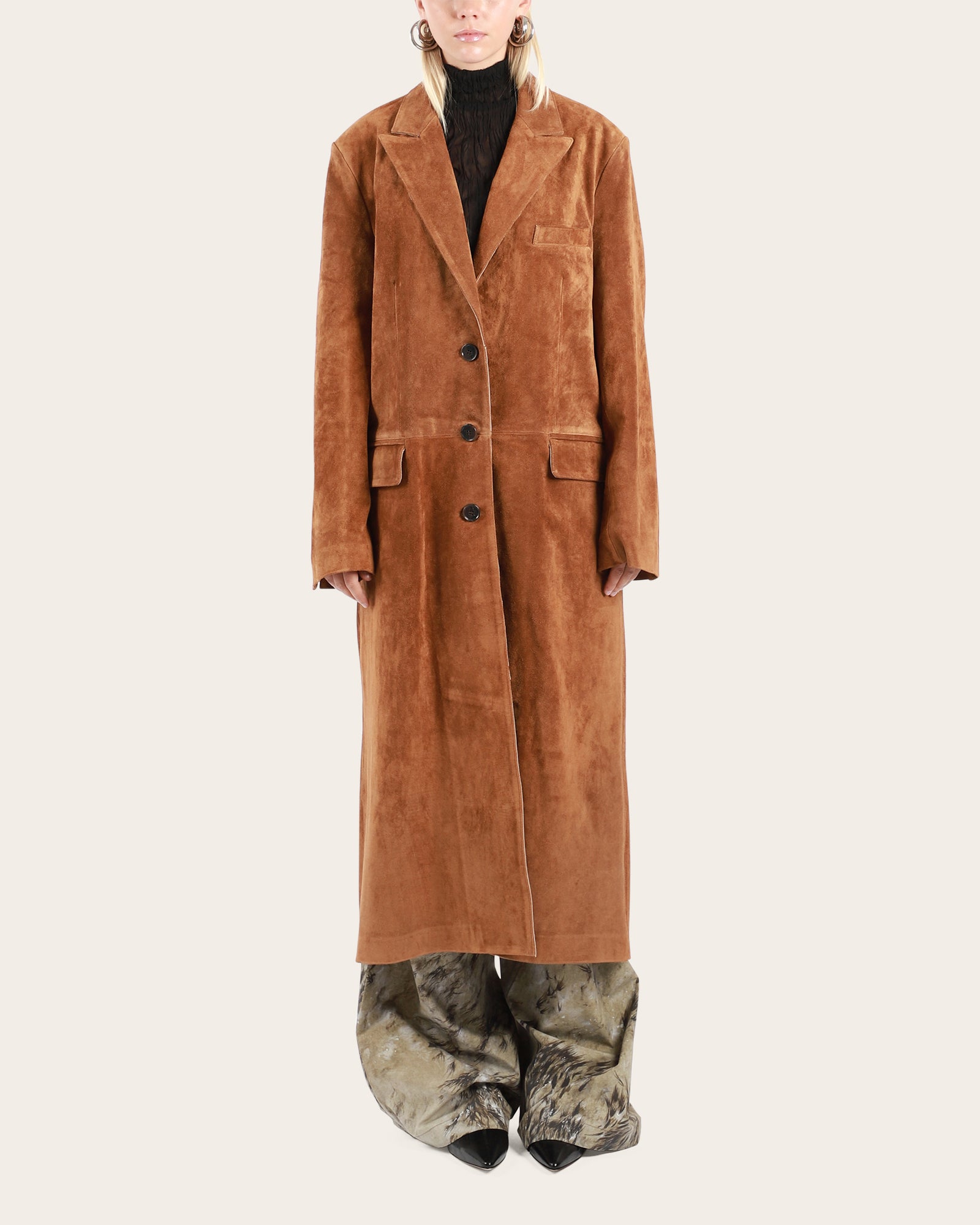 A long coat like the ALISA Gritty Suede Long Coat is a wardrobe staple. Tailored with lancia rever shoulder pads, it offers a structured, elegant shape. The single-breasted design is completed with classic front pockets for a refined finish.