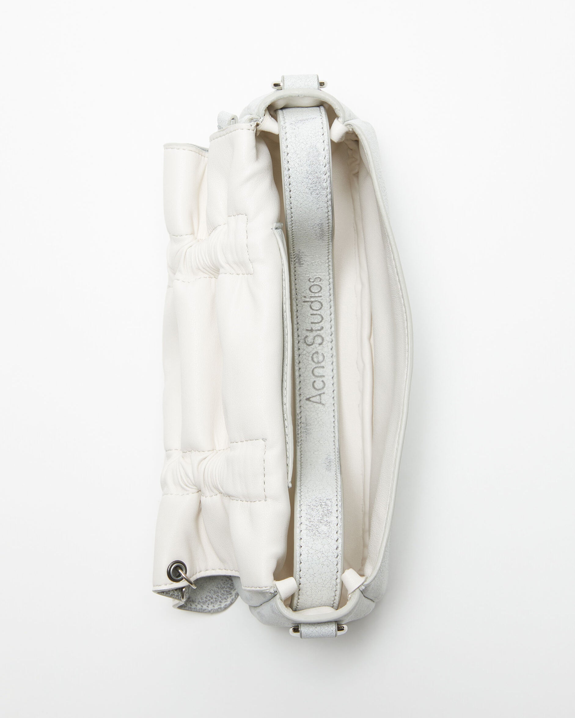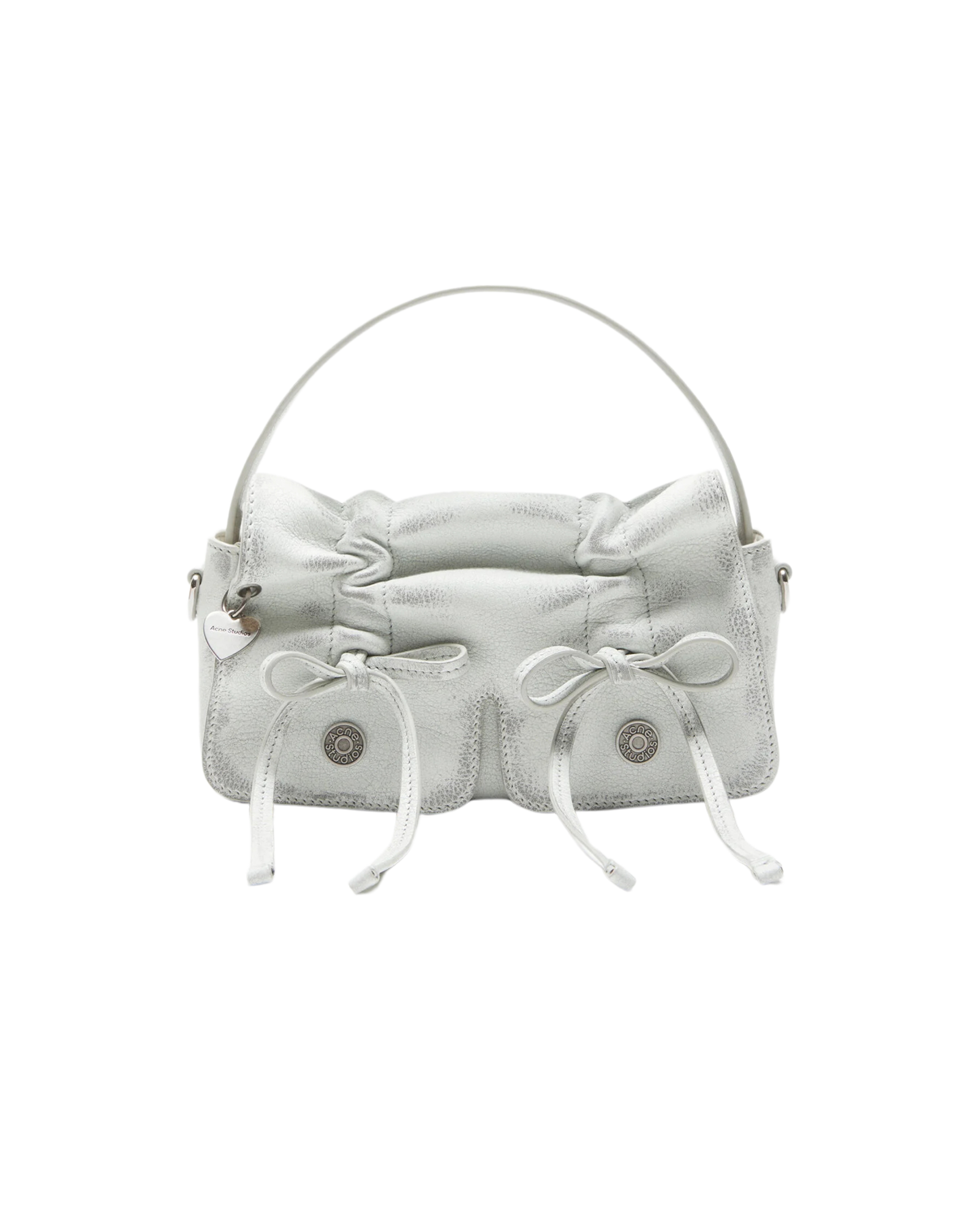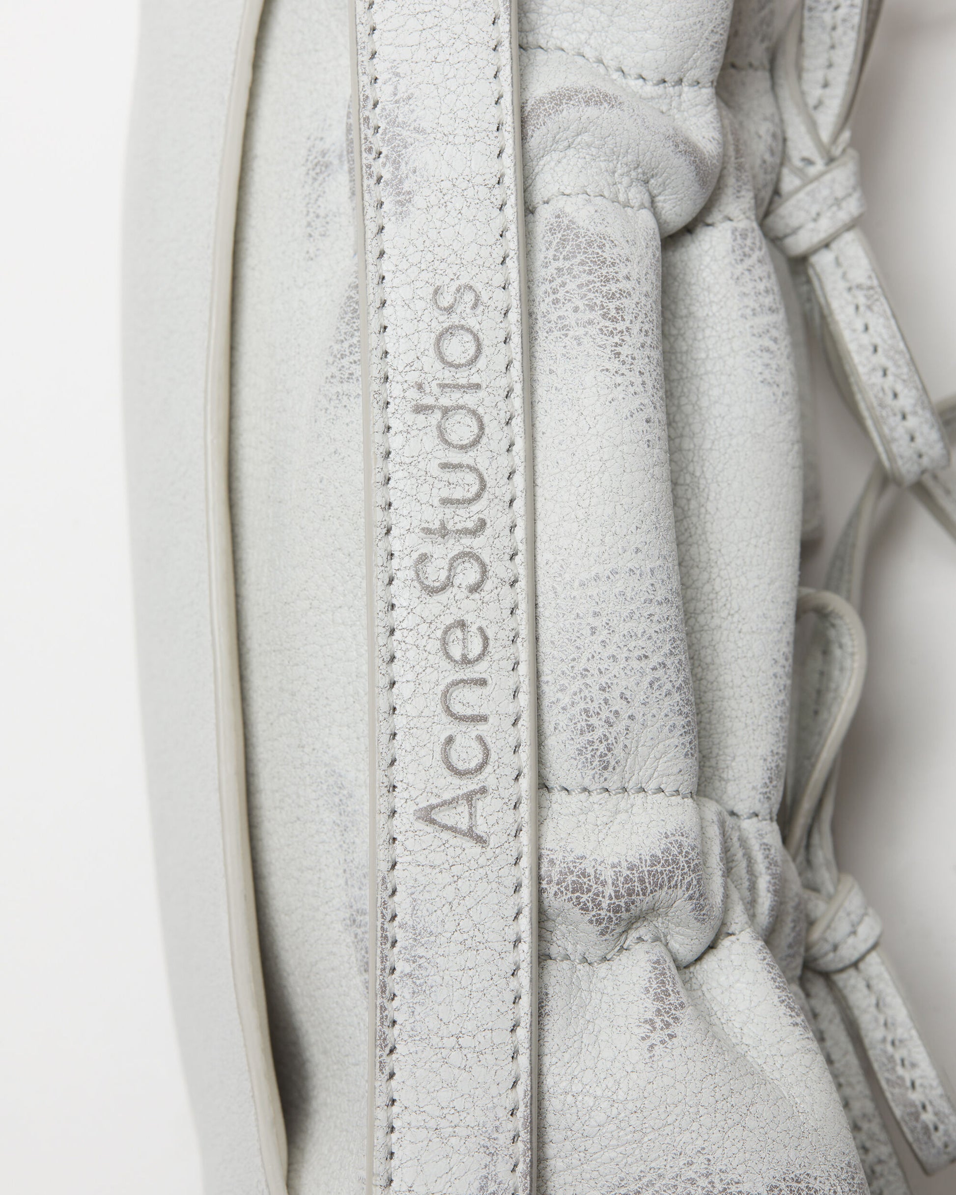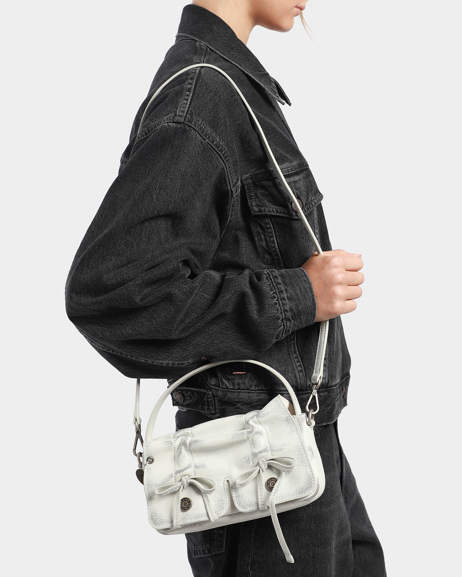 The crafted leather multipocket micro bag has a washed finish which gives a vintage and unique look. It features two laced knots details at front, side flap pocket with hidden magnetic closure finished with a top handle and long strap.