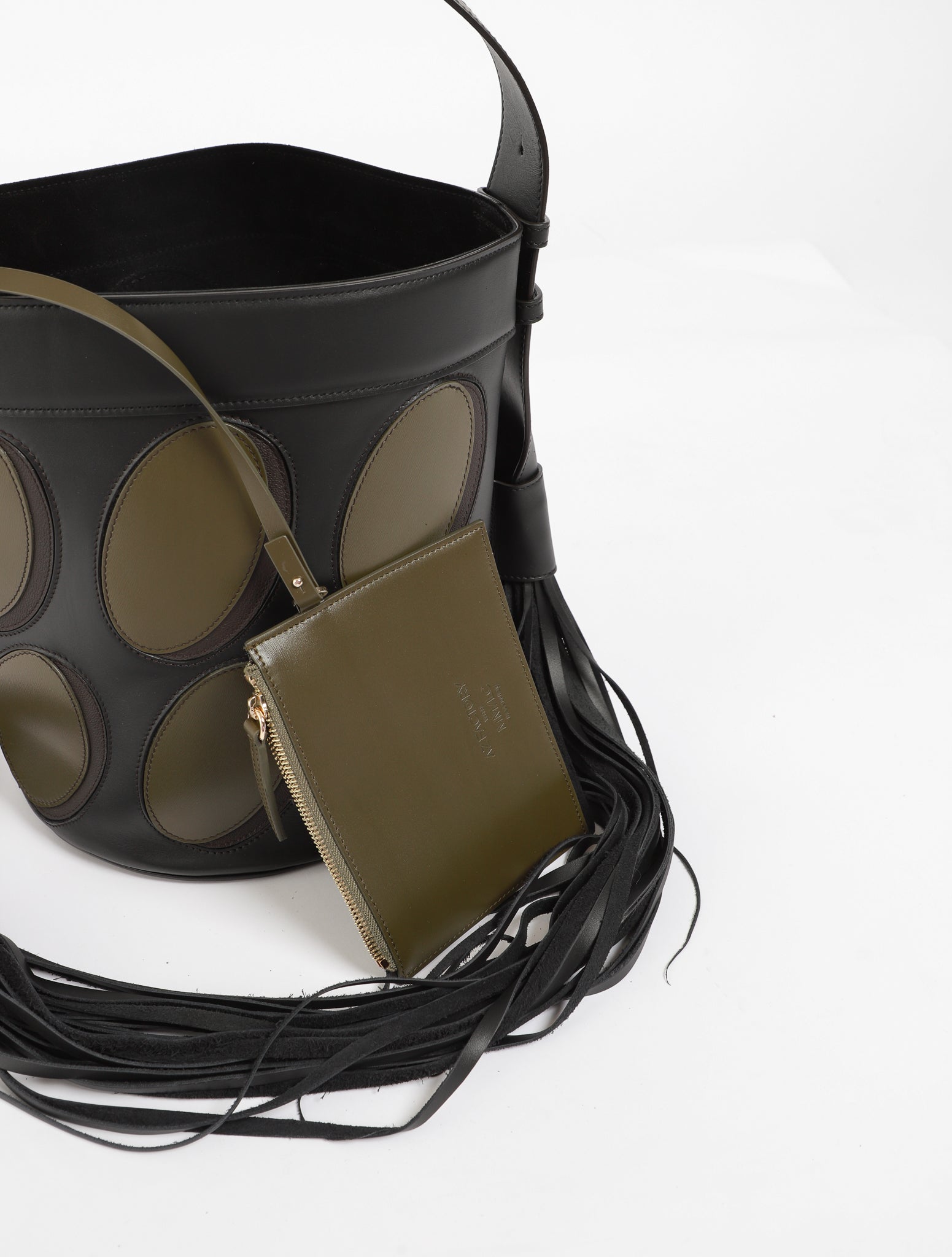 - Detachable leather zip pouch inside in green colour
