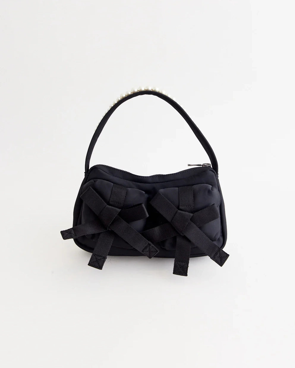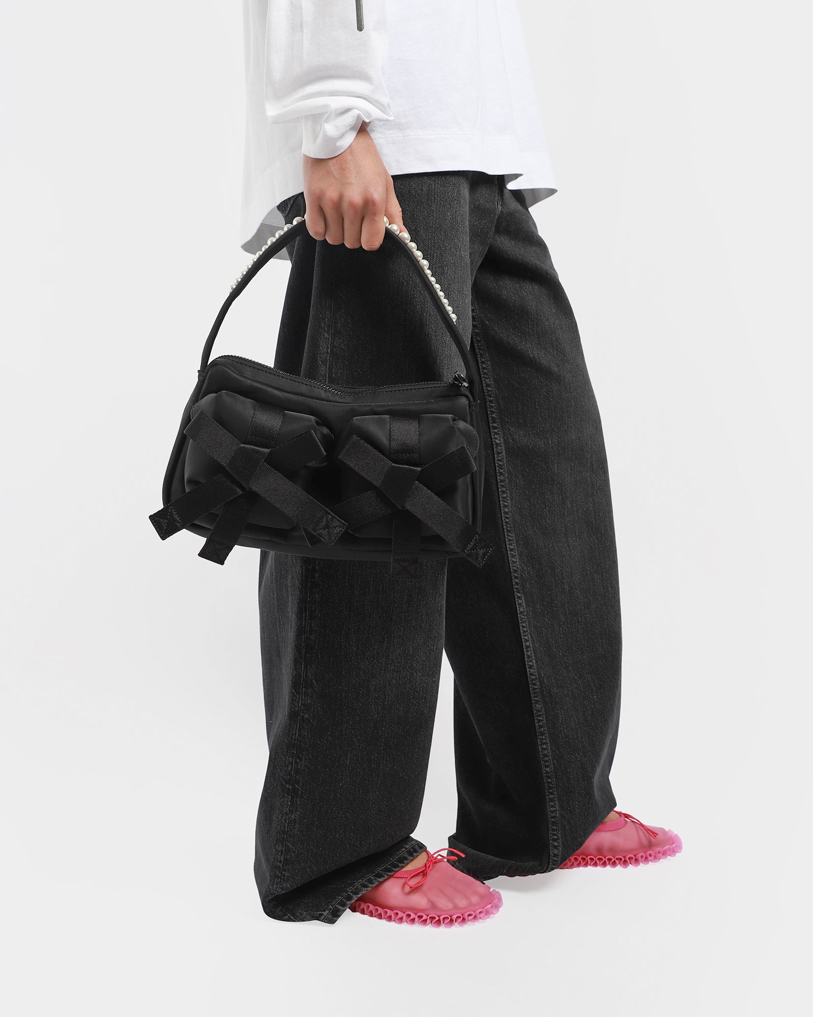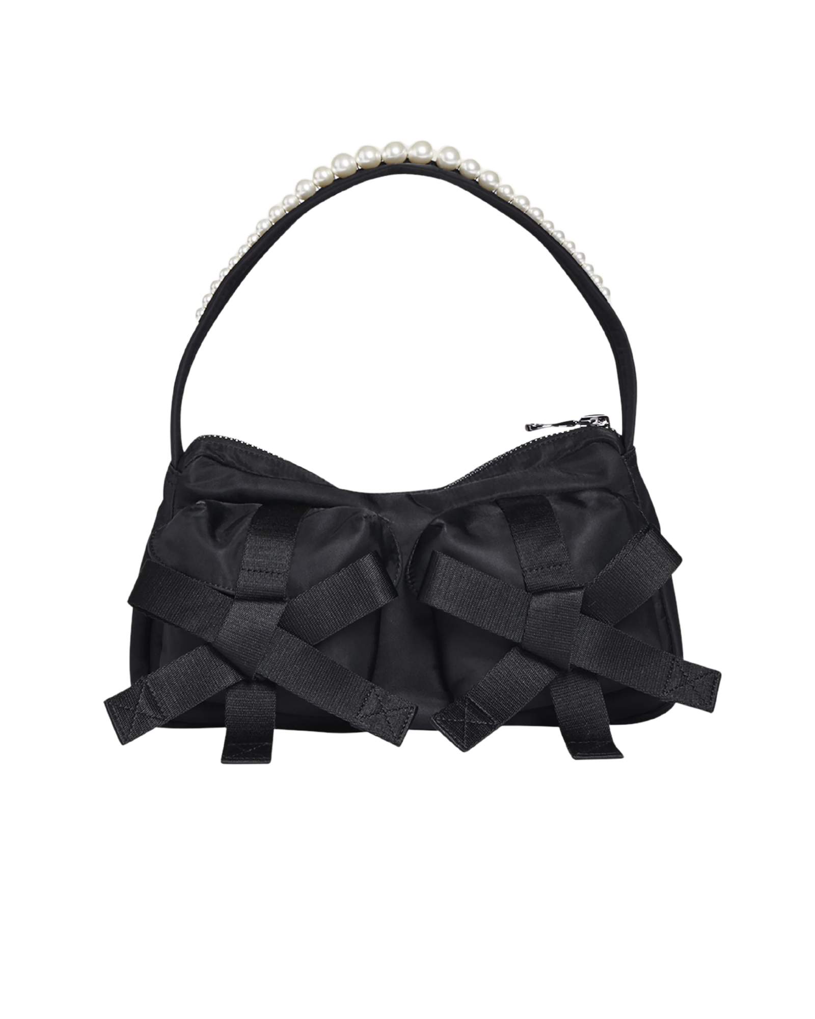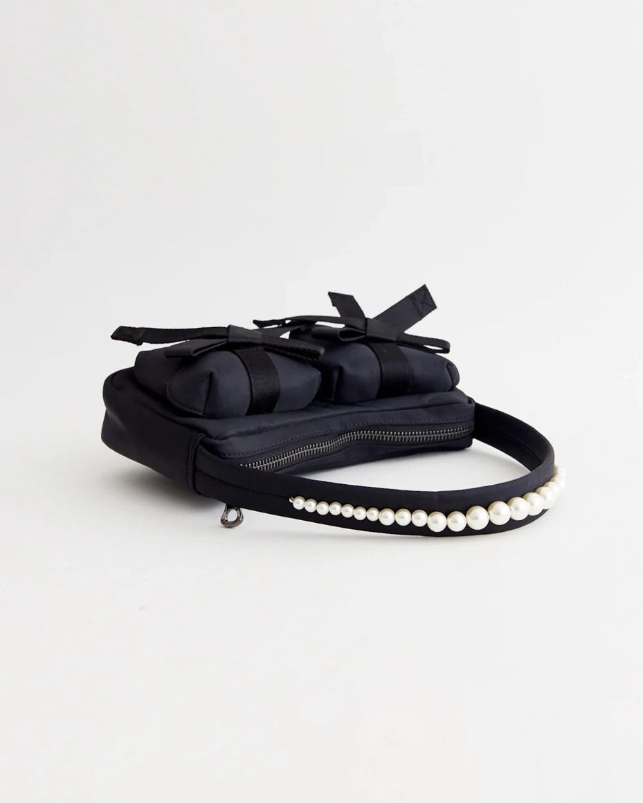 A beautiful utility bag from Simone Rocha accentuated with faux-pearl at the fixed shoulder strap. It features webbing bows and flap compartments at front, a useful two-way zip closure, patch pocket inside and faille lining.