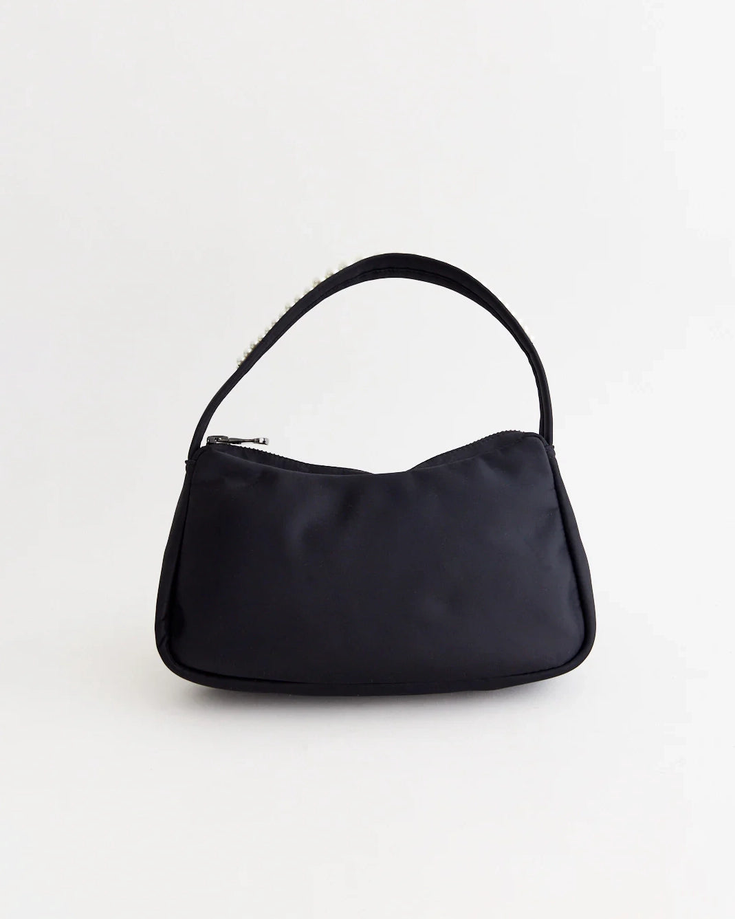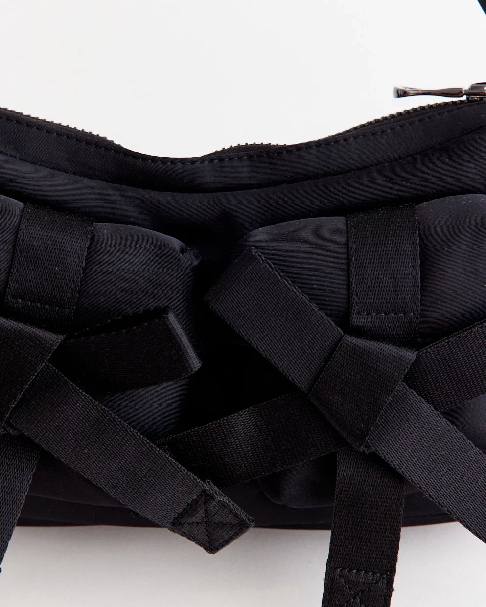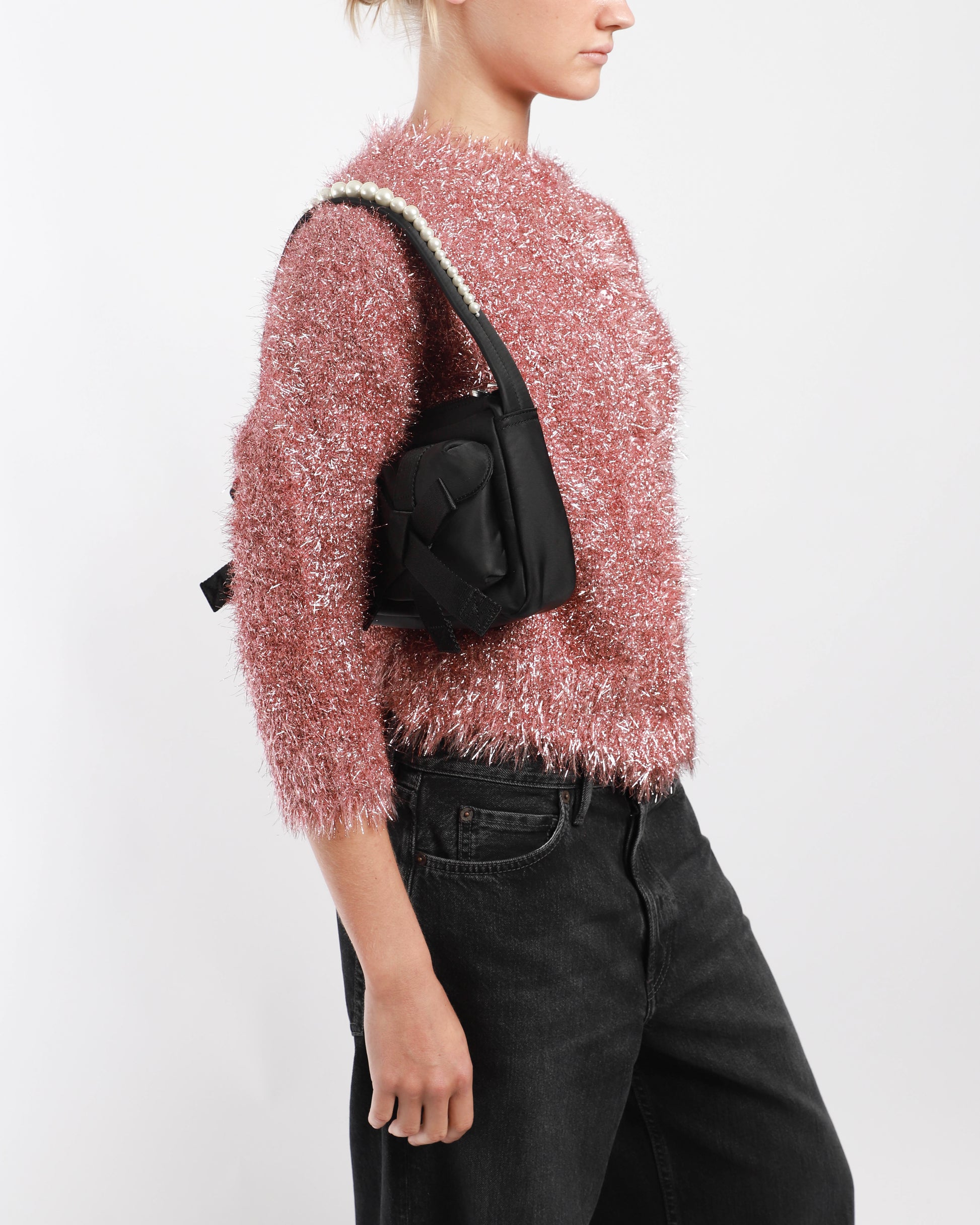 A beautiful utility bag from Simone Rocha accentuated with faux-pearl at the fixed shoulder strap. It features webbing bows and flap compartments at front, a useful two-way zip closure, patch pocket inside and faille lining.