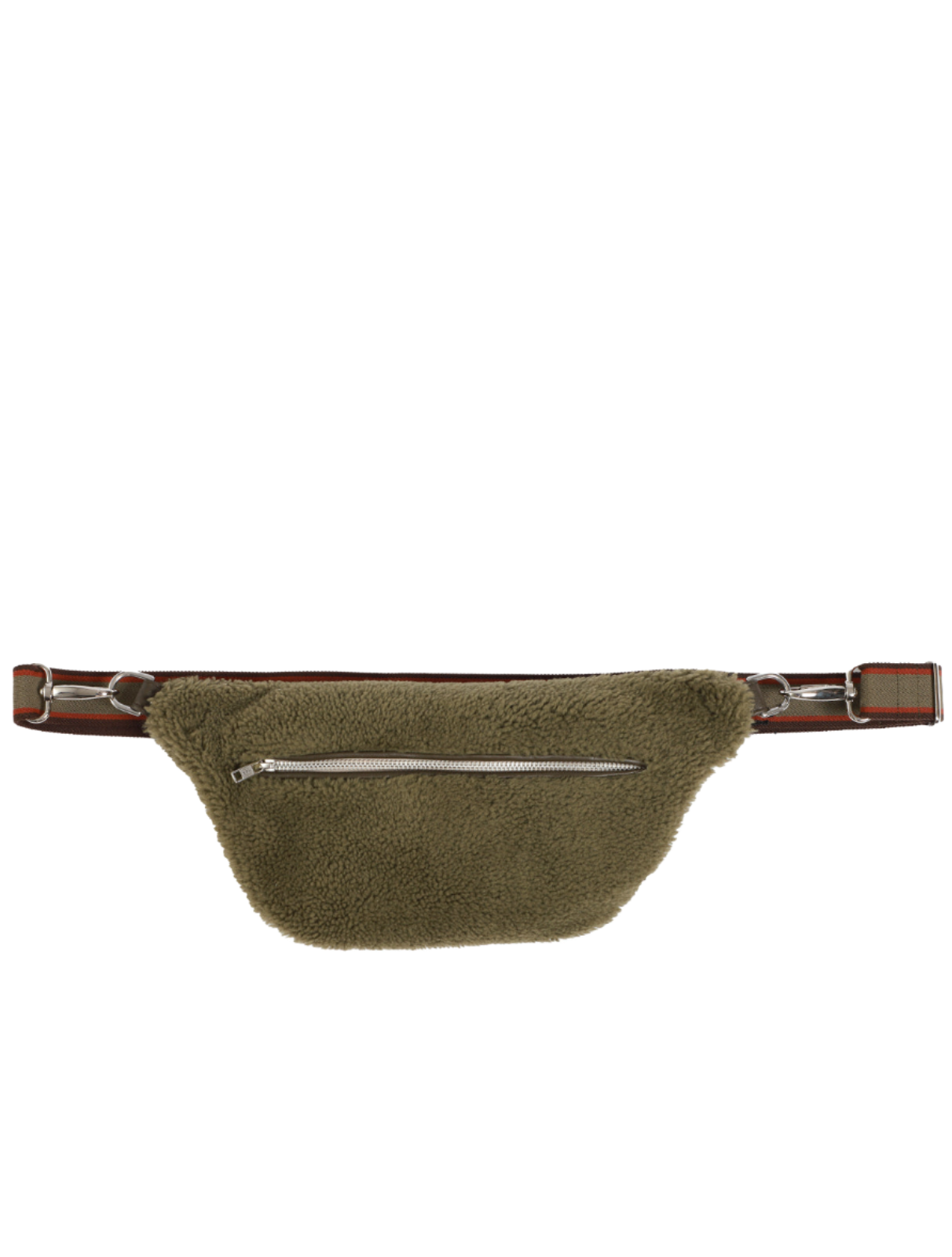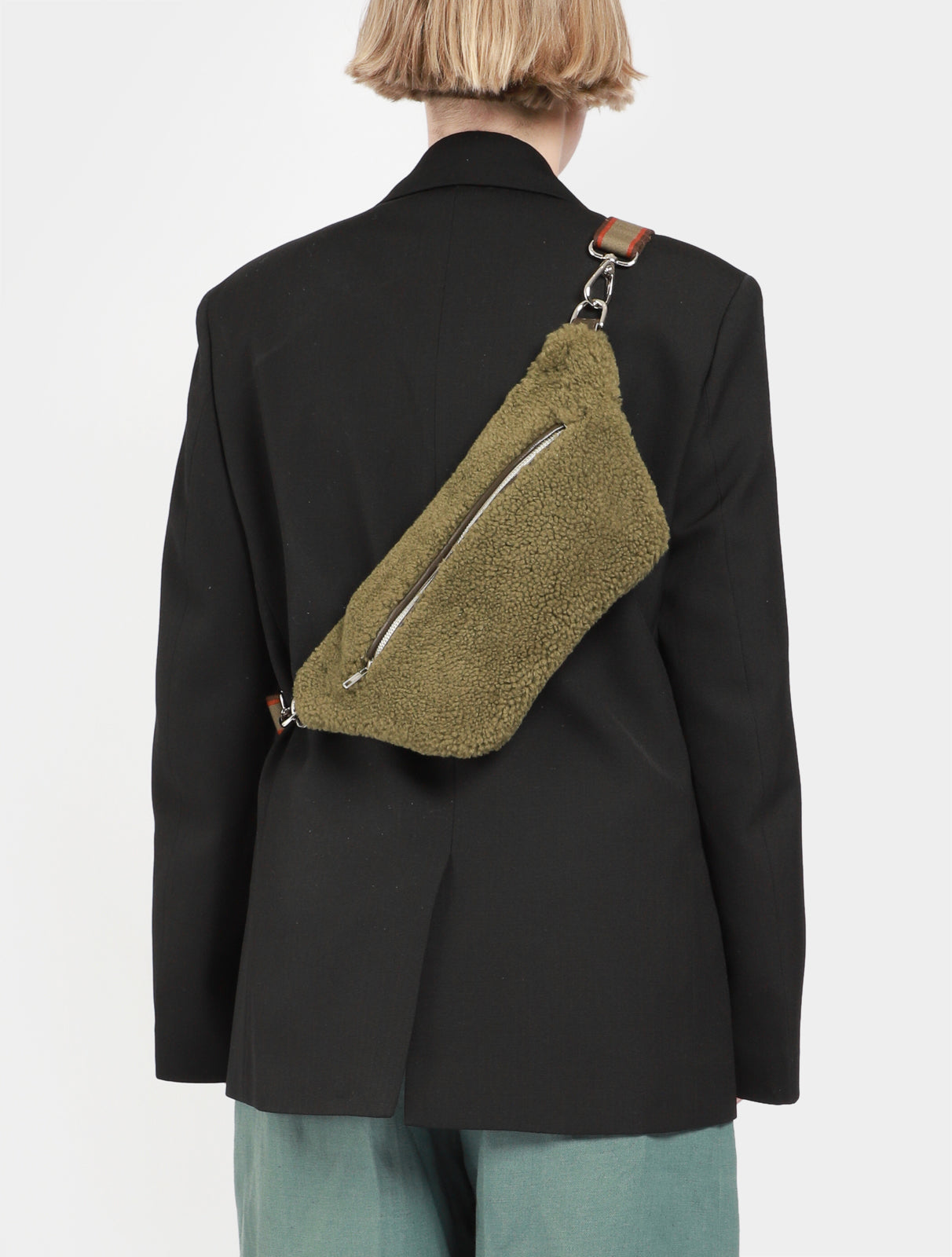 Gabriele Frantzen belt bag in Italian shearling leather, featuring a zip top closure, comes with multi-coloured stretch and adjustable strap with lobster clasp fastenings, can be worn cross body or around waist.