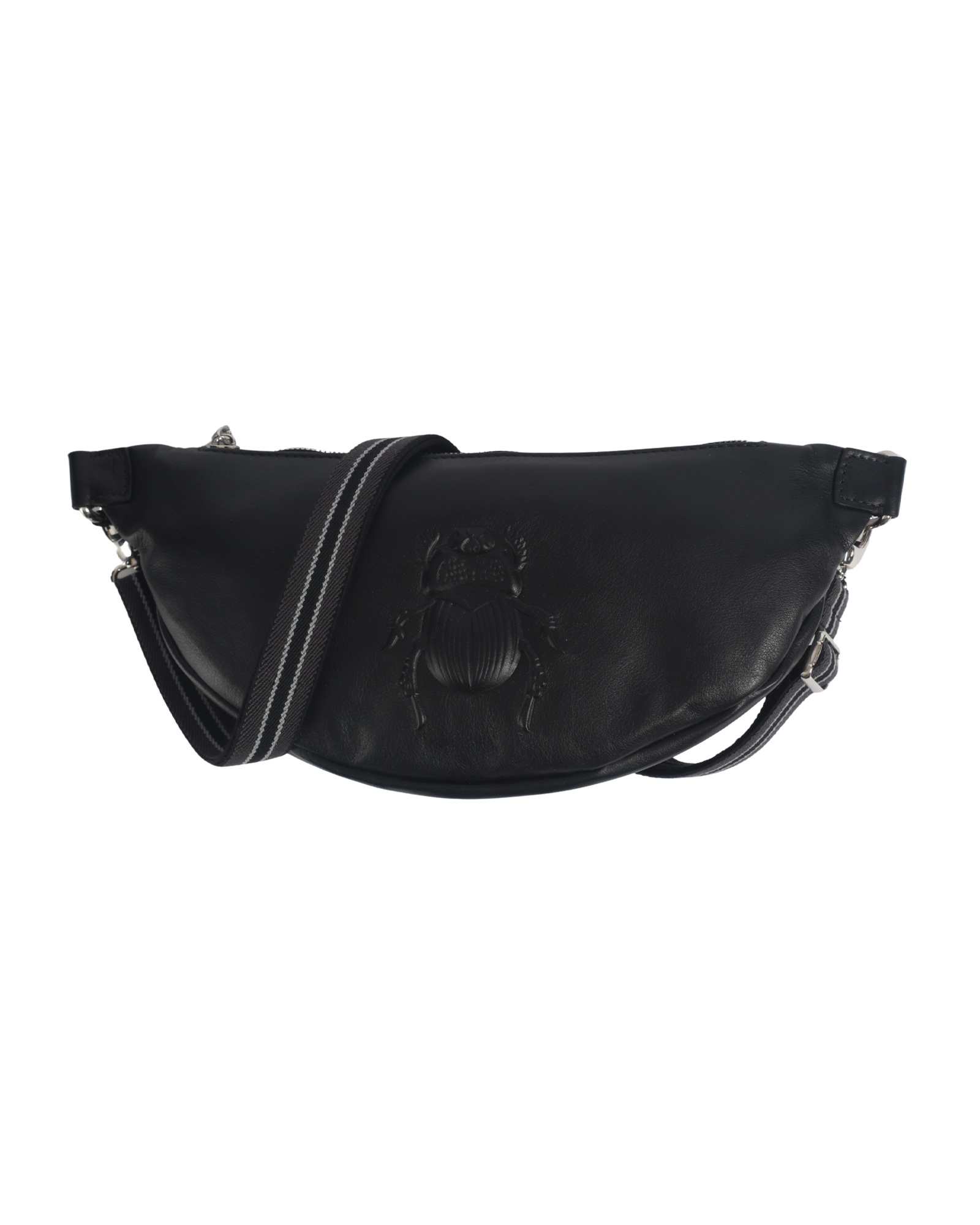 The Scarab Belt Bag is crafted from Italian leather in Italy. It features an adjustable strap that can be worn crossbody or around the waist and is accented with a bold scarab detail on the front.