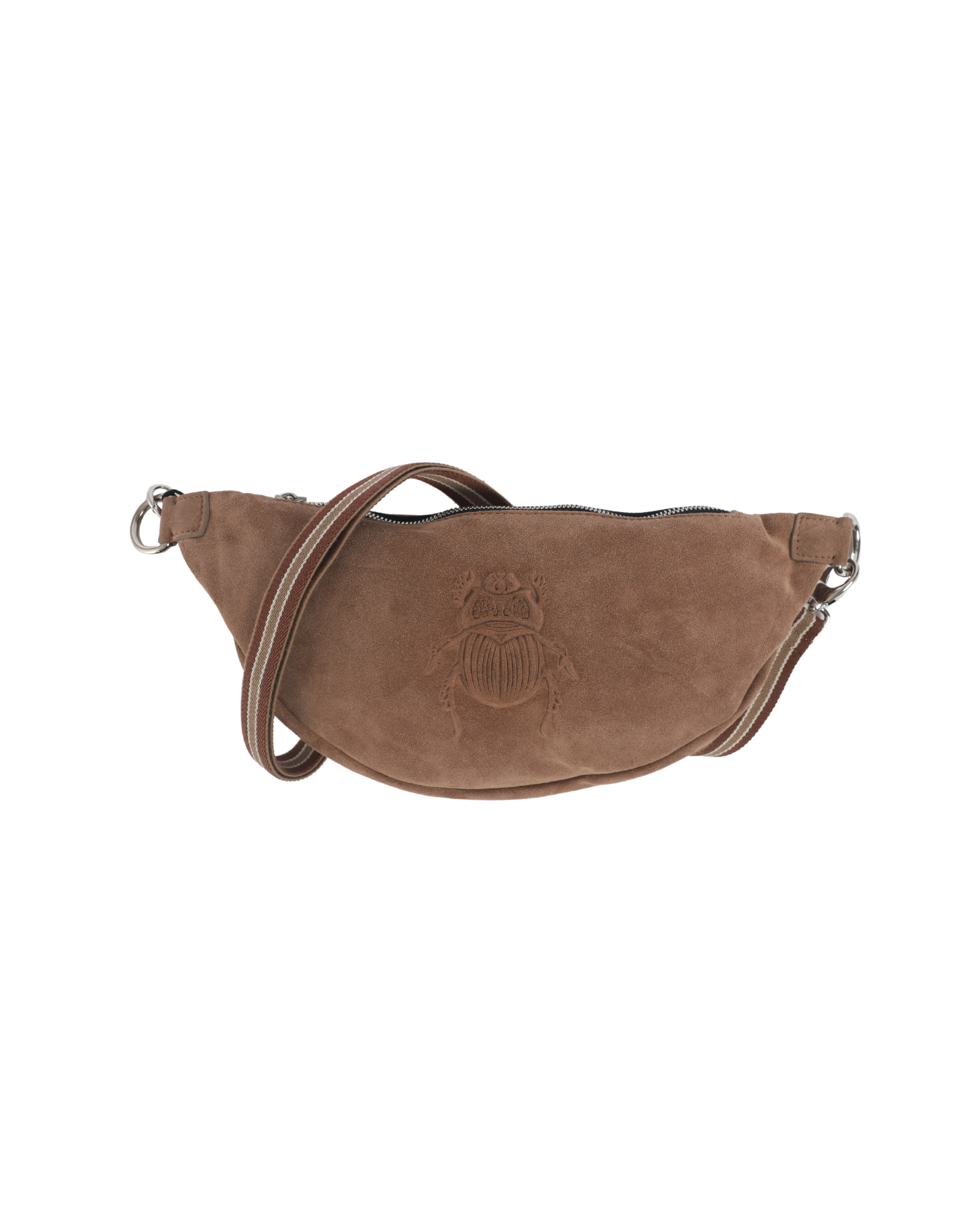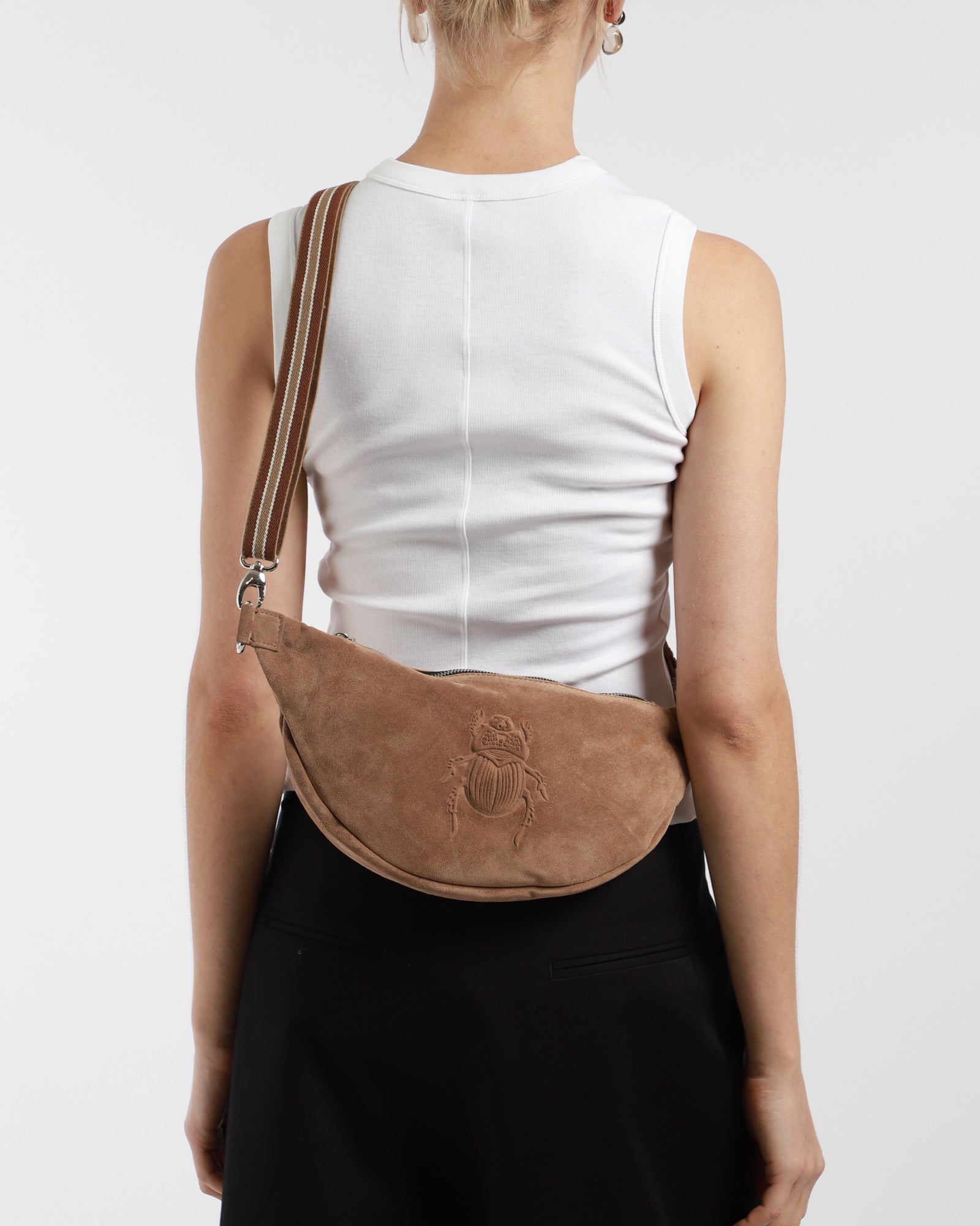 The Scarab Belt Bag is crafted from Italian suede leather in Italy. It features an adjustable strap that can be worn crossbody or around the waist and is accented with a bold scarab detail on the front.