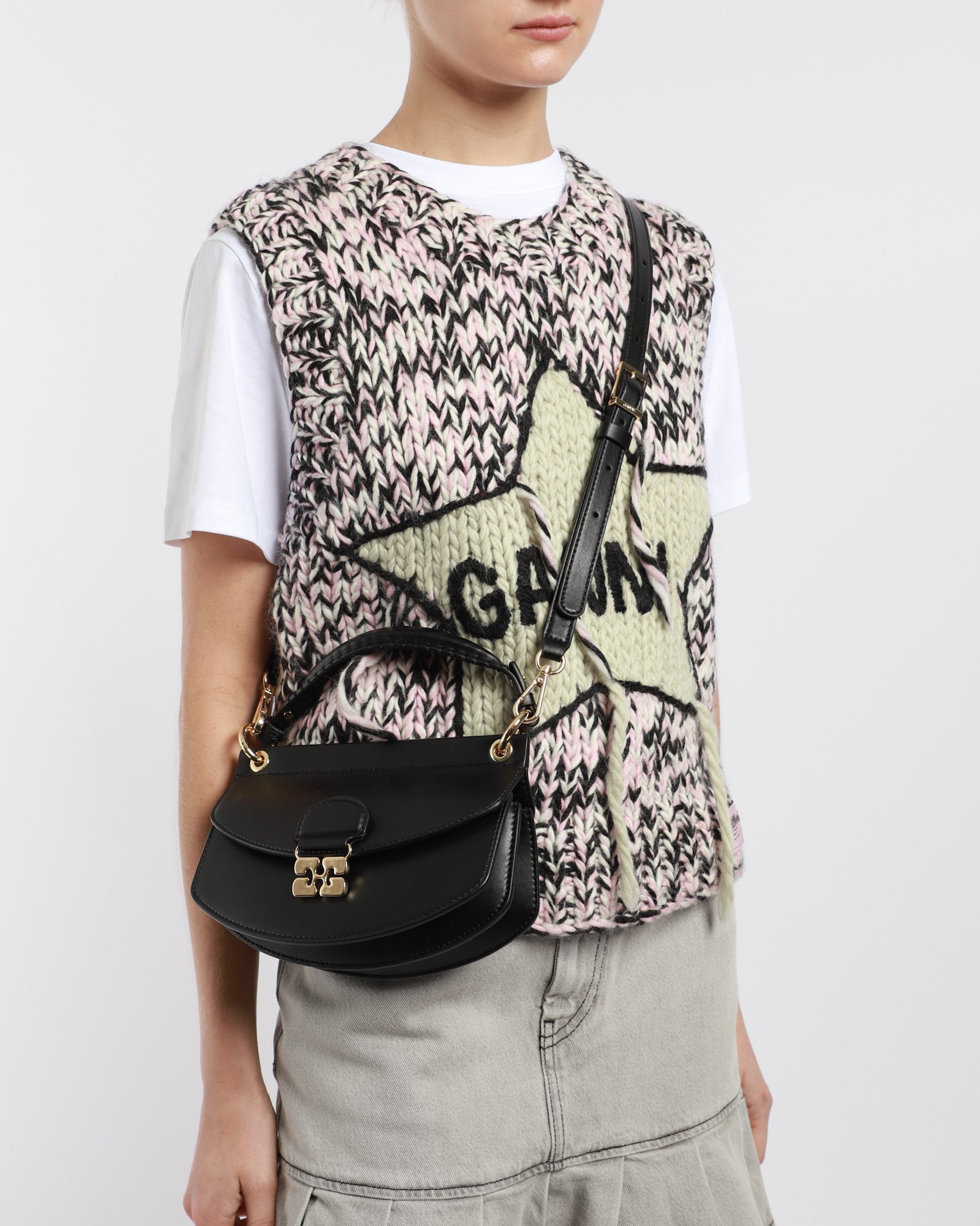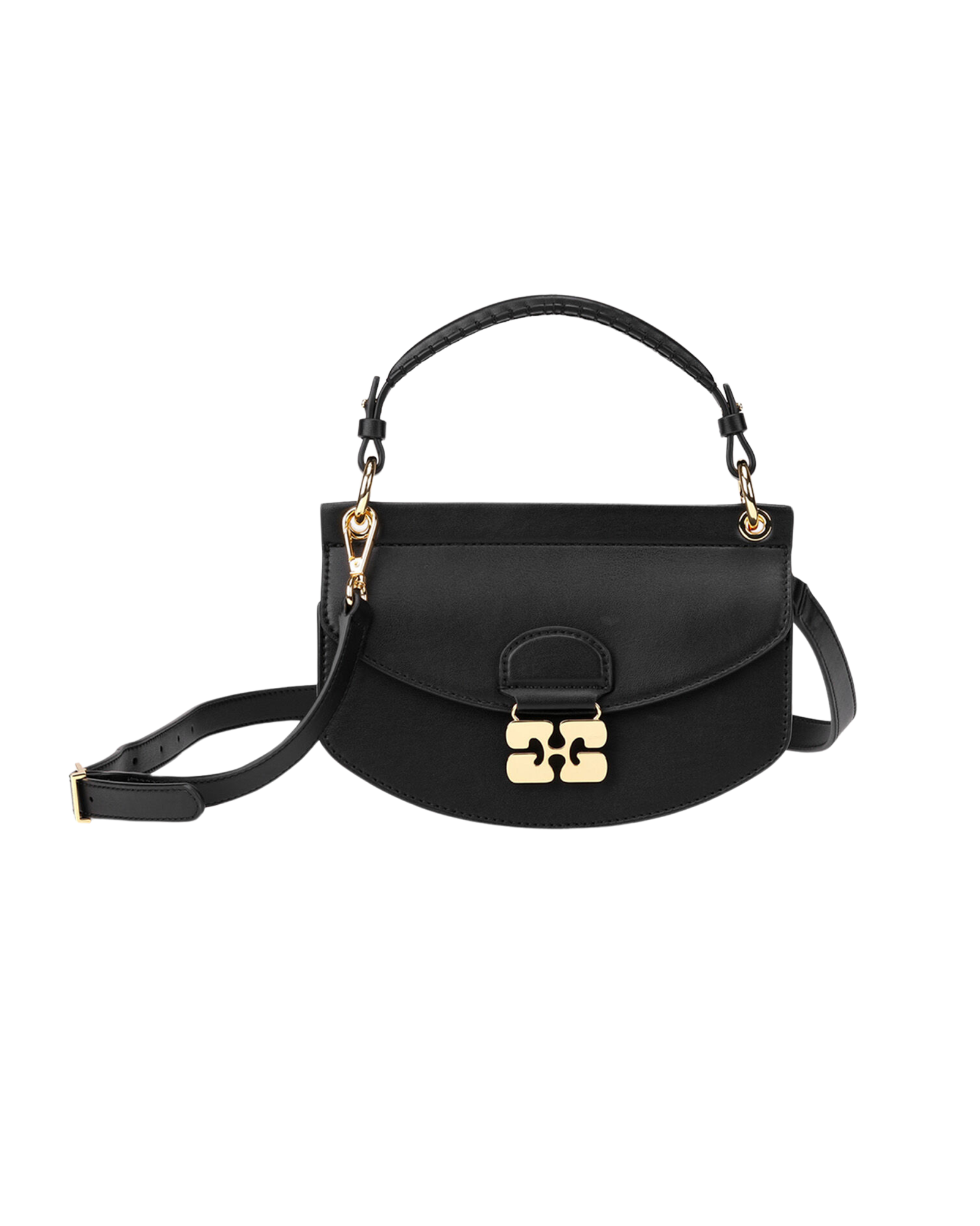 The Apo-G Mini Bag is a versatile crossbody or shoulder bag with a polished finish, crafted from recycled materials. It features a foldover top with a magnetic fastening, a detachable top handle, and an internal slip pocket along with a zip pocket for added functionality.