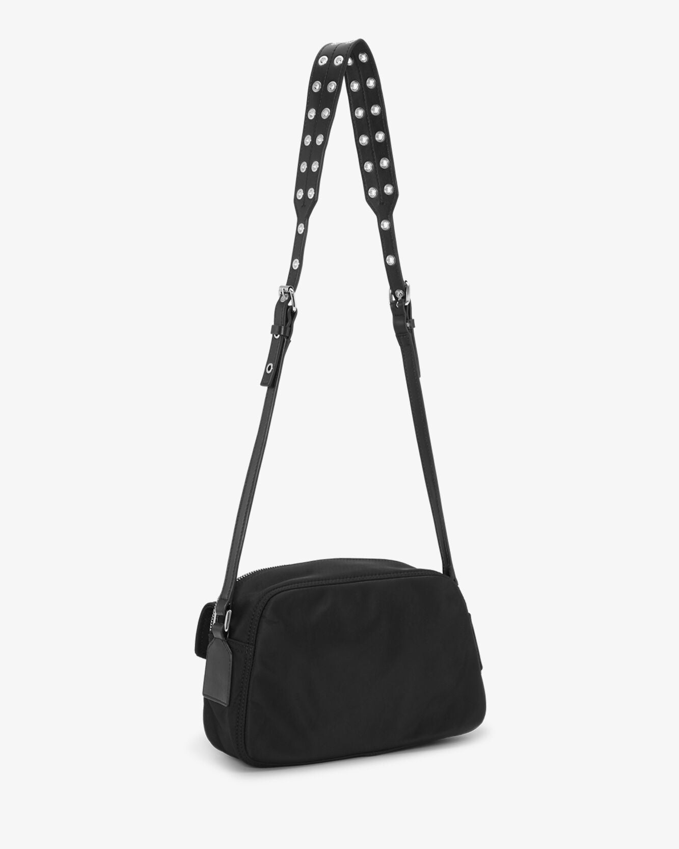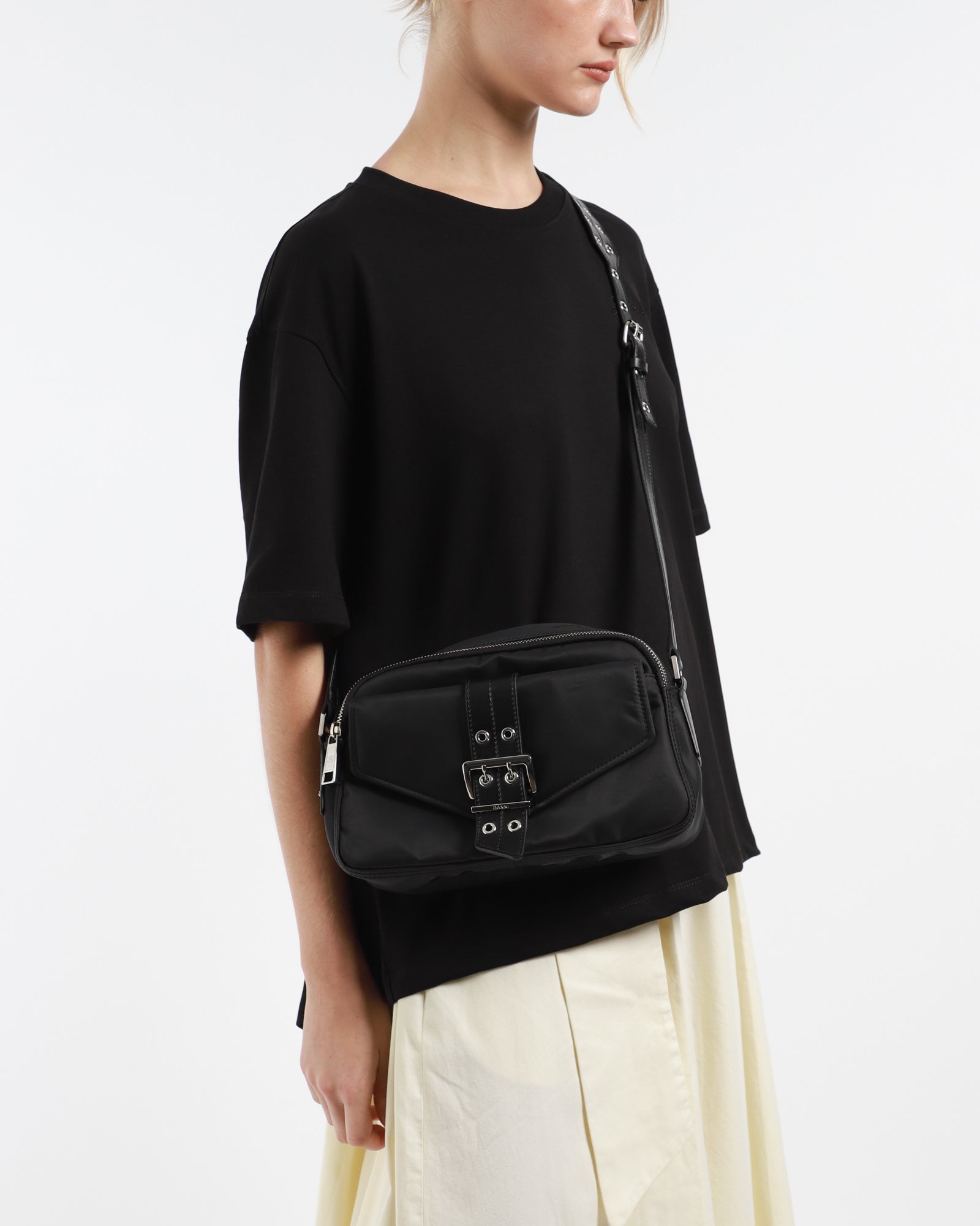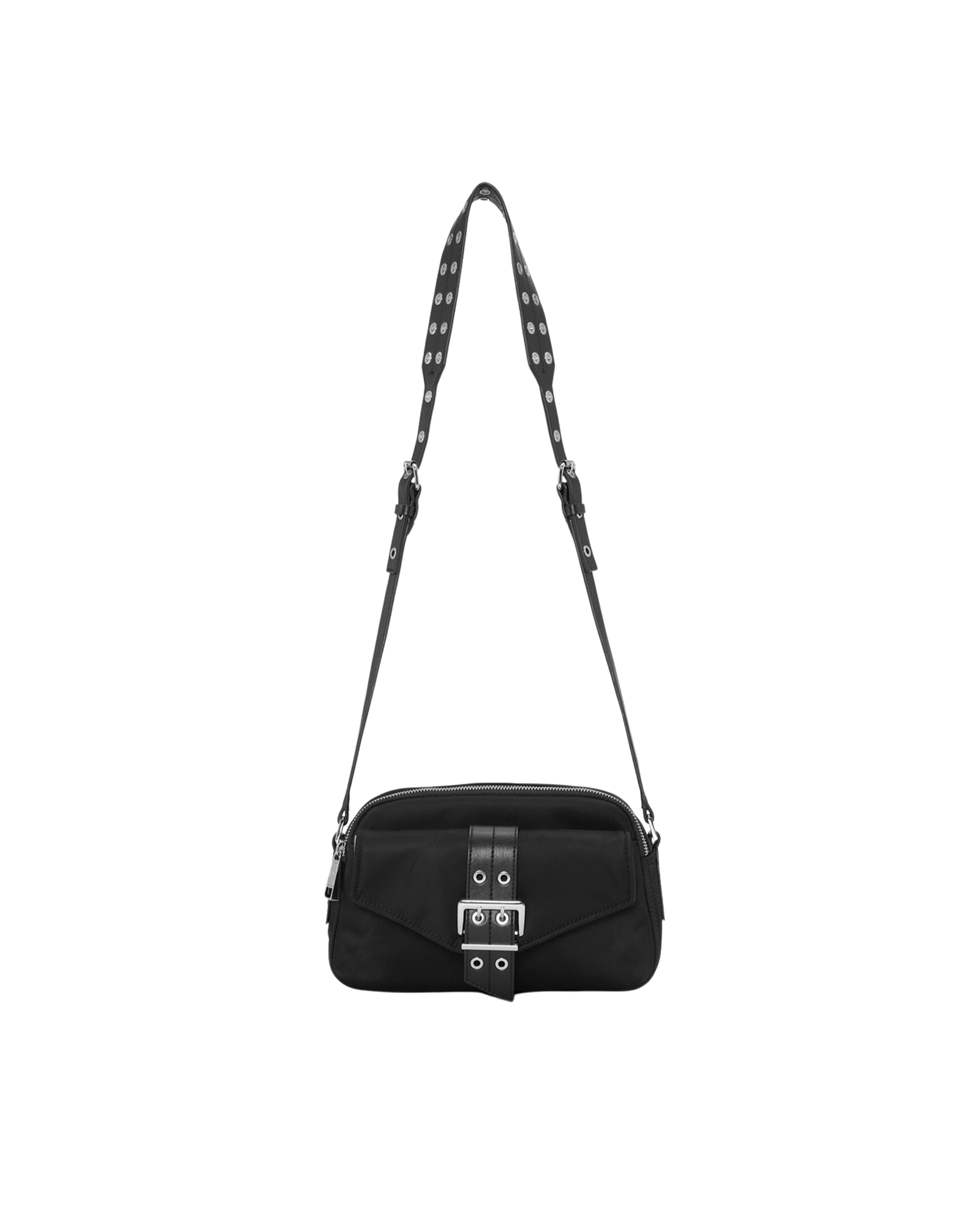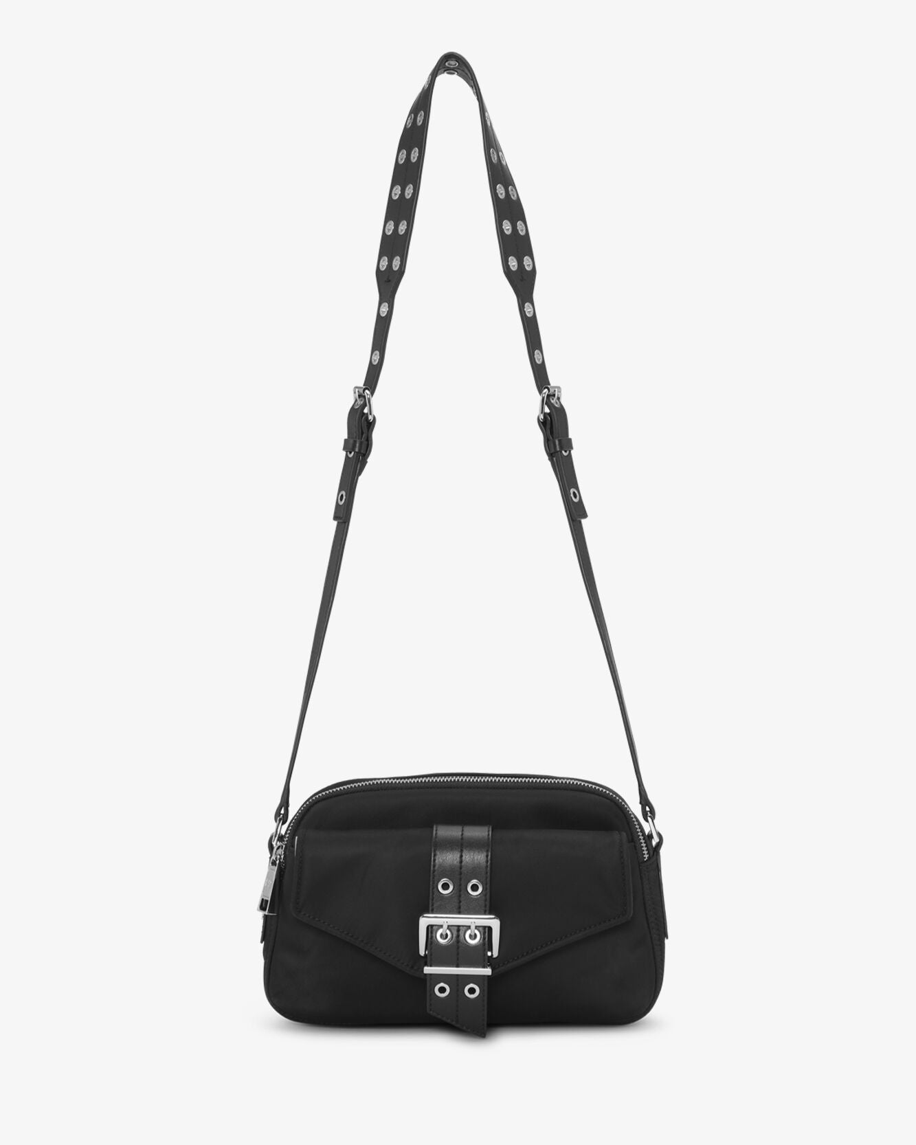 This Black Bucky Camera Bag features a front flap secured by a strap embellished with eyelets and a metallic buckle. The bag has a zipper closure along the top, an adjustable shoulder strap, and a metallic hardware logo on the side.