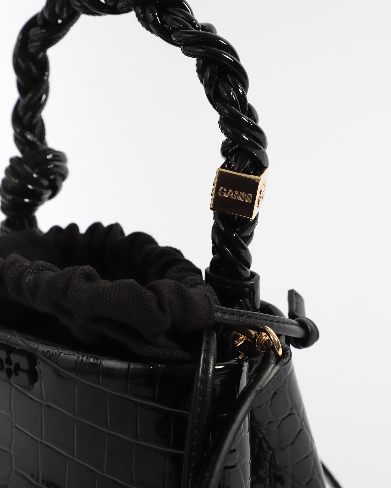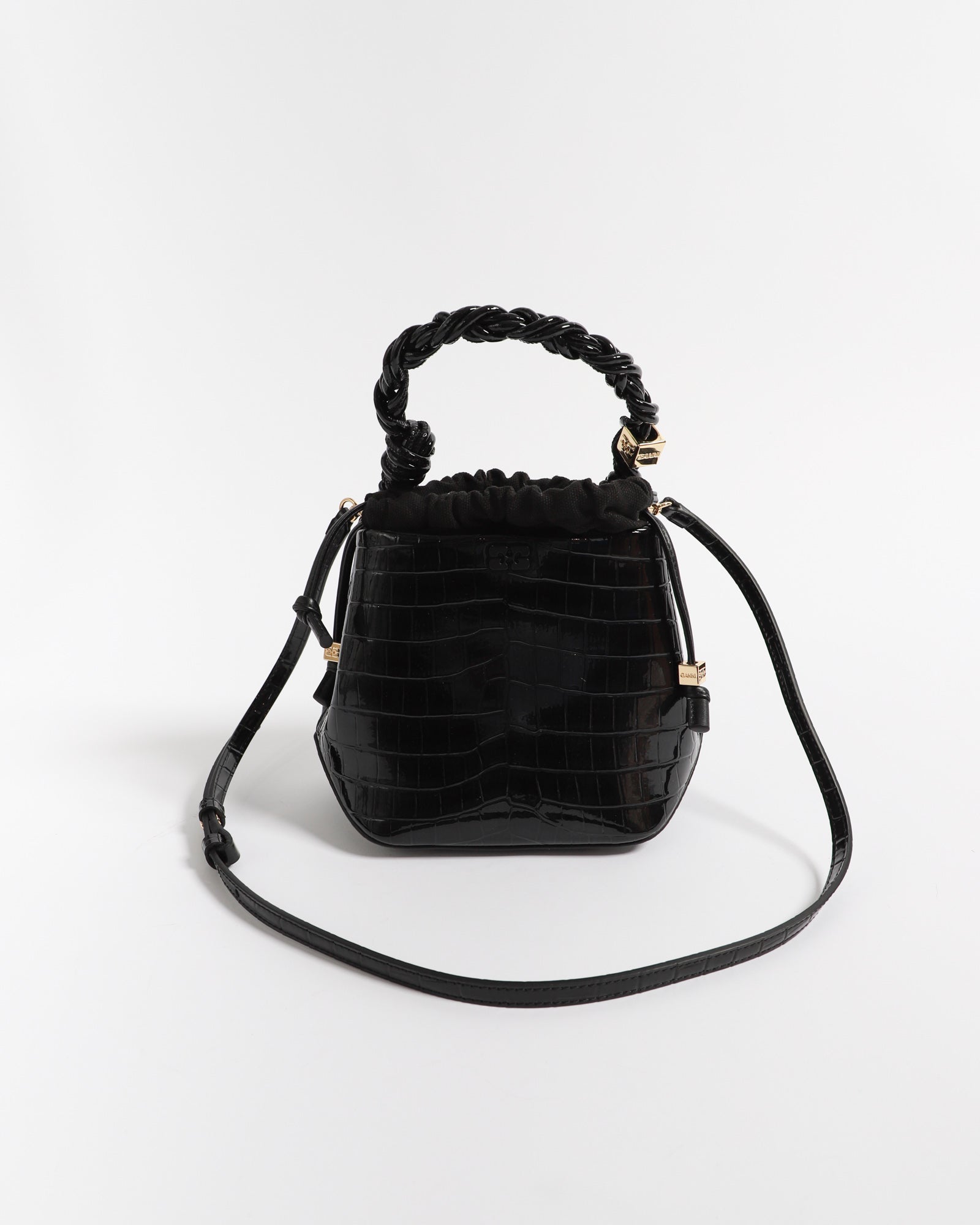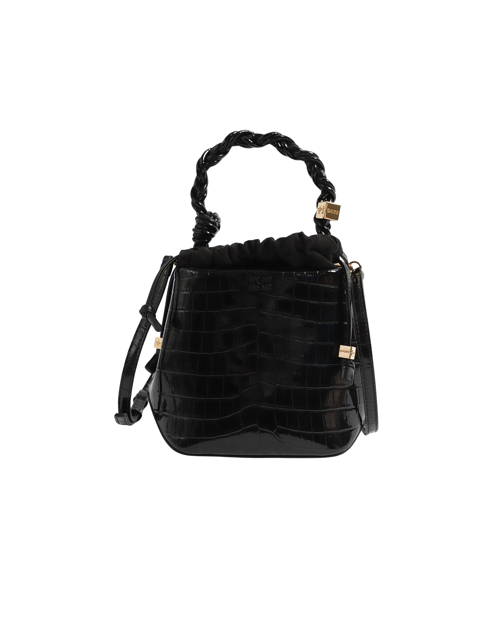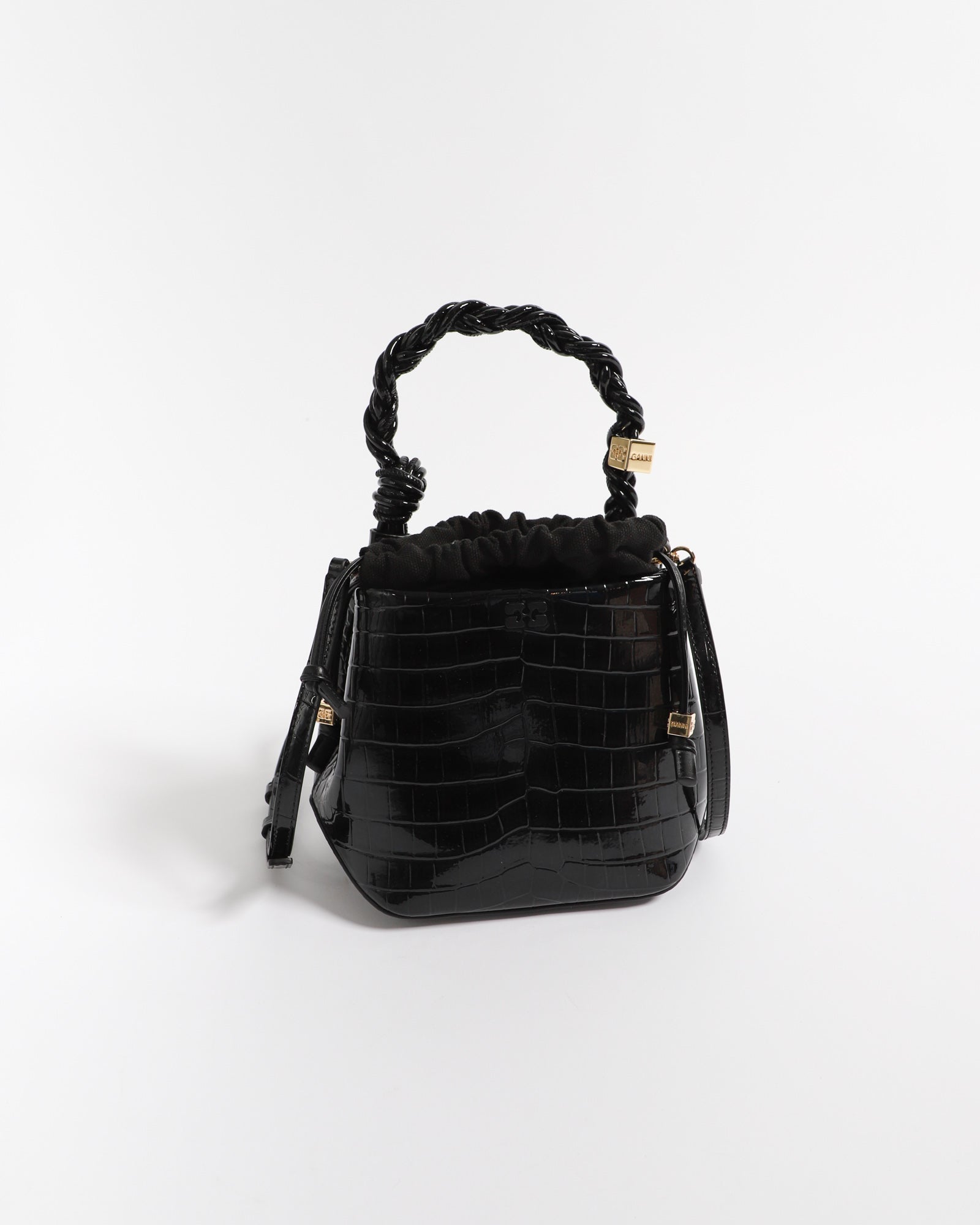 This GANNI Bou Bucket Bag features a drawstring closure, GANNI Butterfly hardware logo, braided strands with a braided knot, metallic dice with a GANNI and Butterfly logo engraved and GANNI embossed logo on the back of the bag.