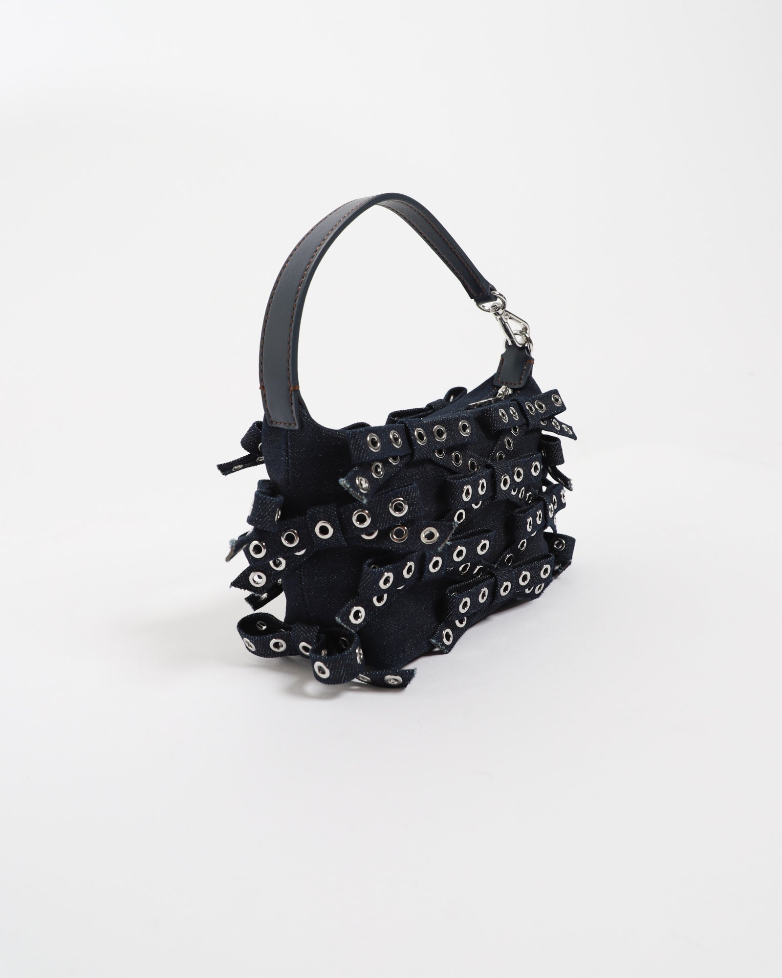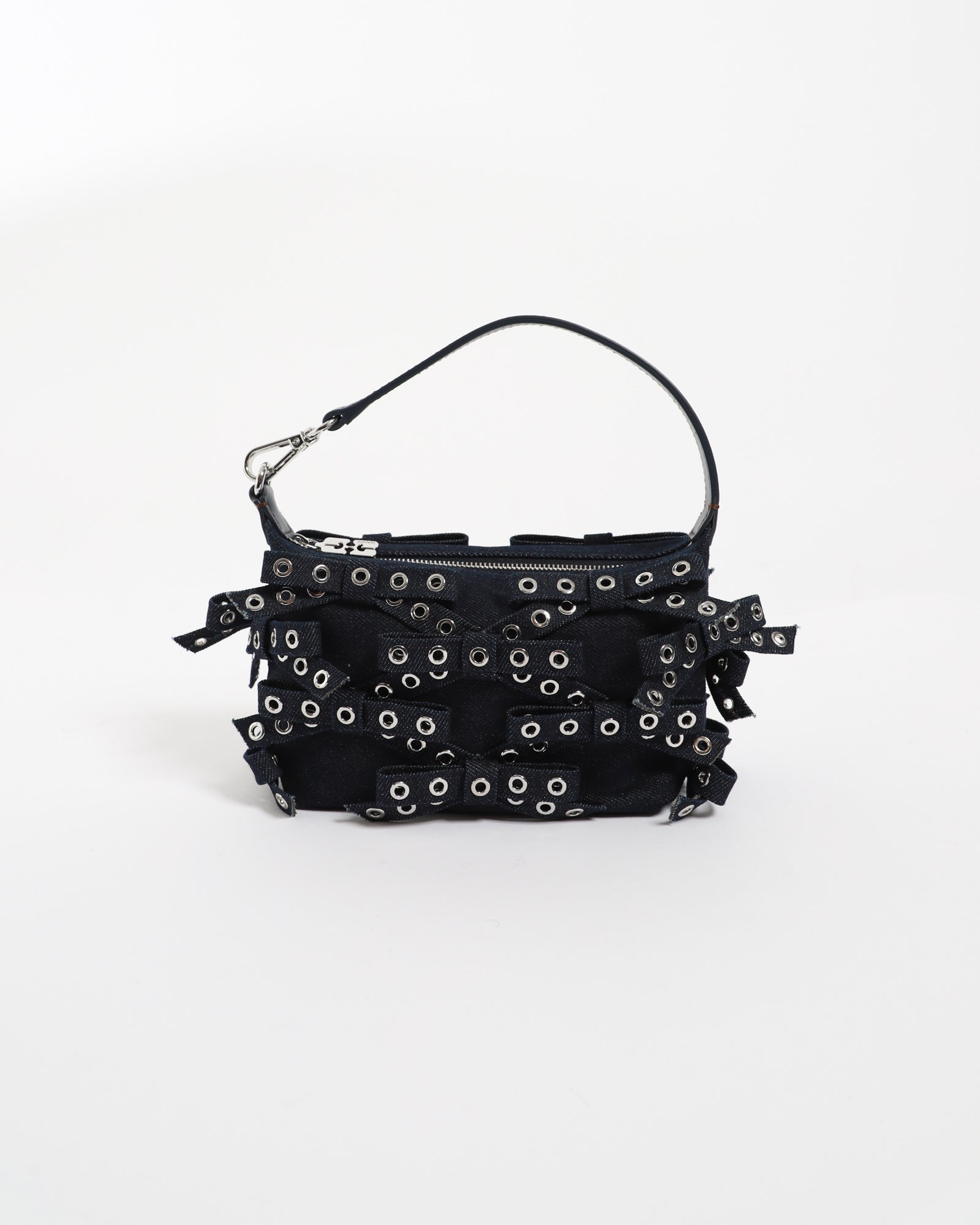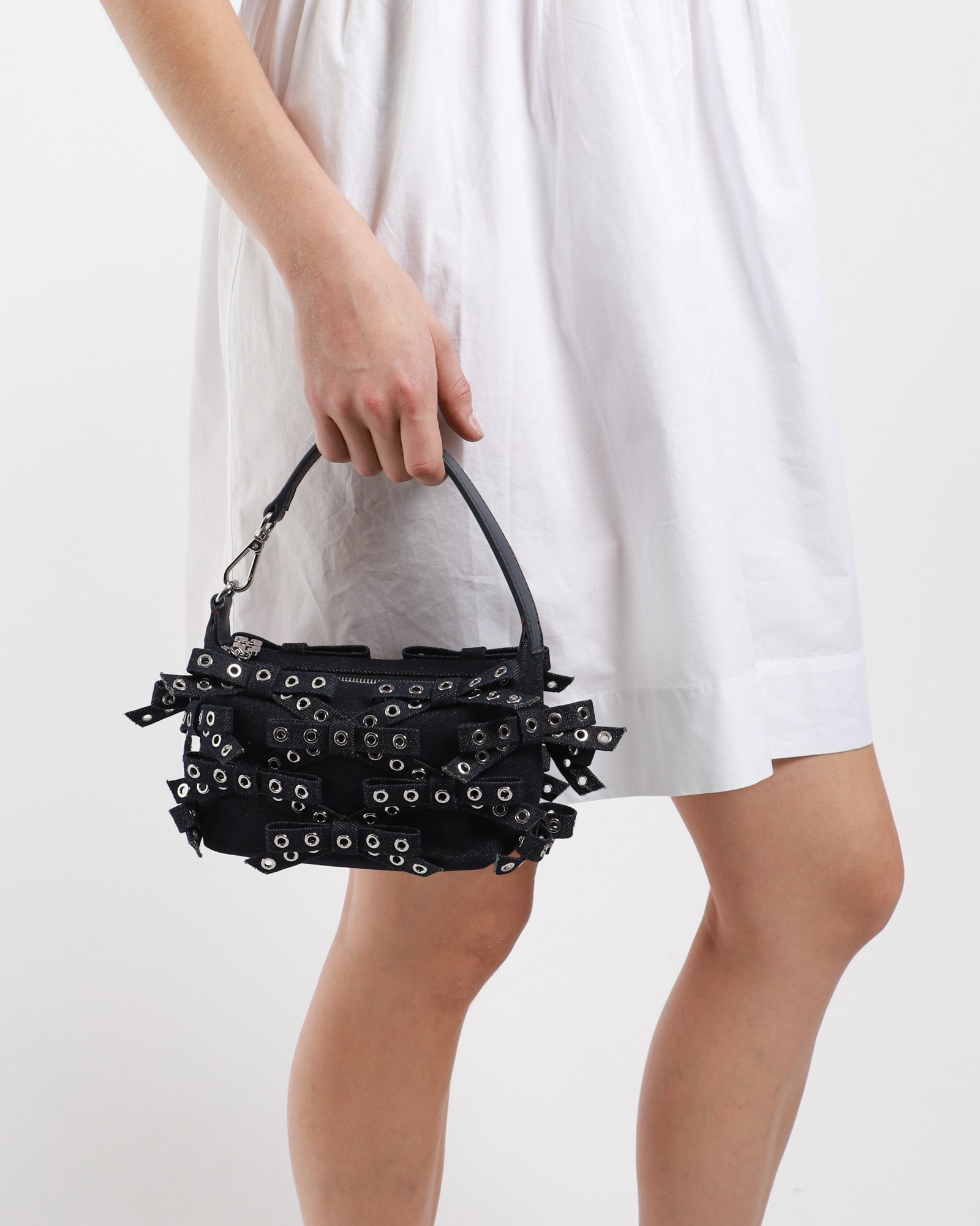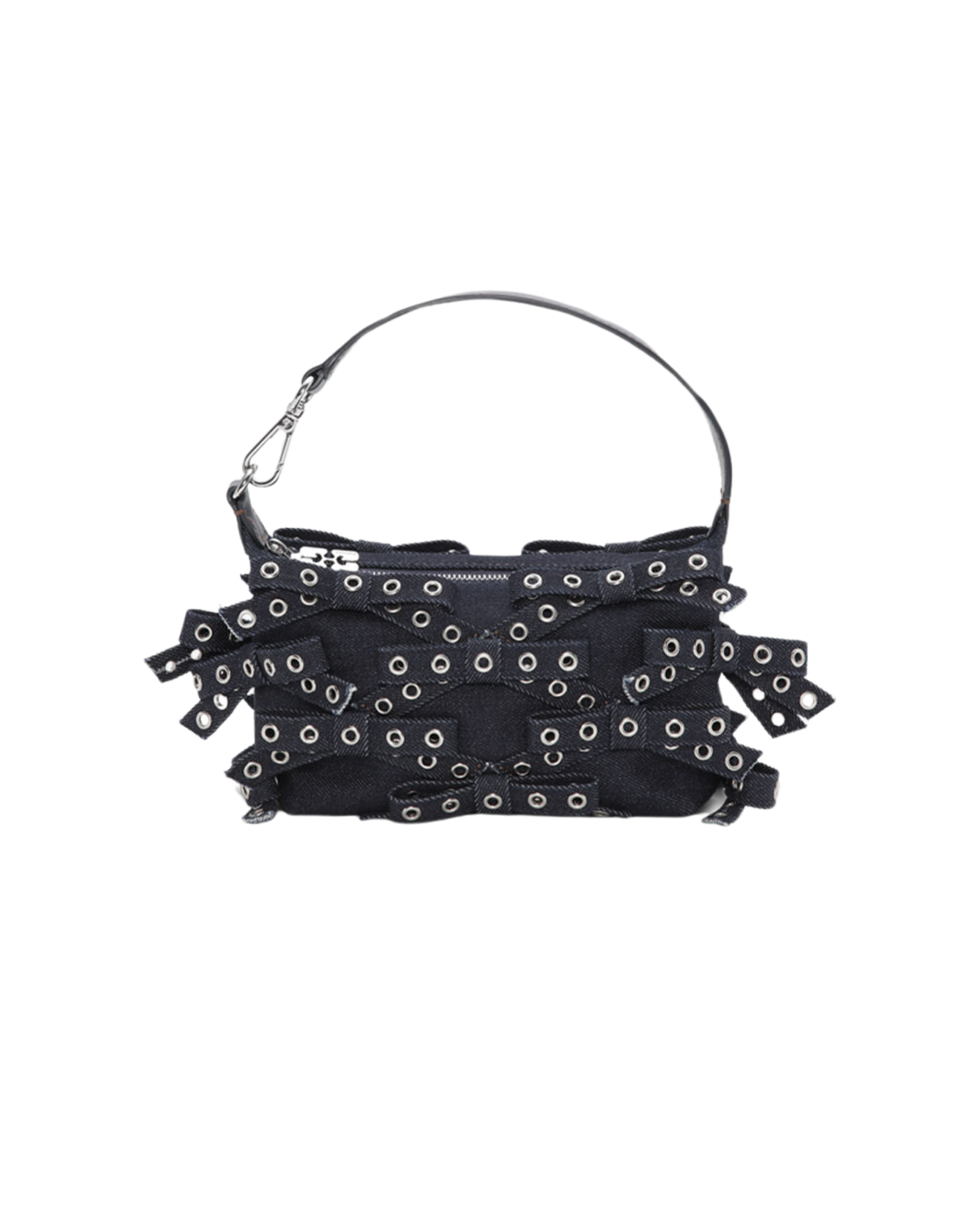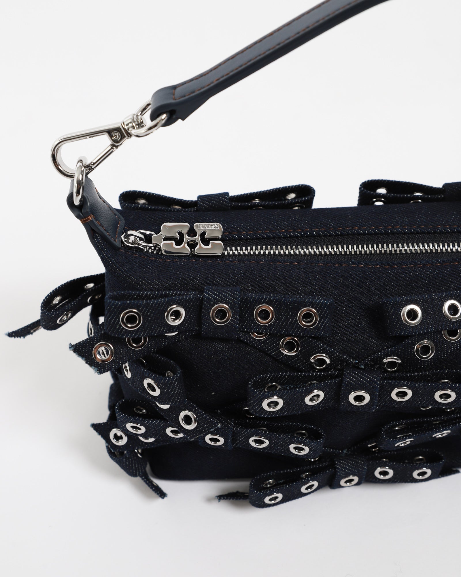 The Small Bow Eyelet Bag is crafted from recycled cotton and features an engraved GANNI Butterfly logo zip puller, elegantly finished with bow detailing.