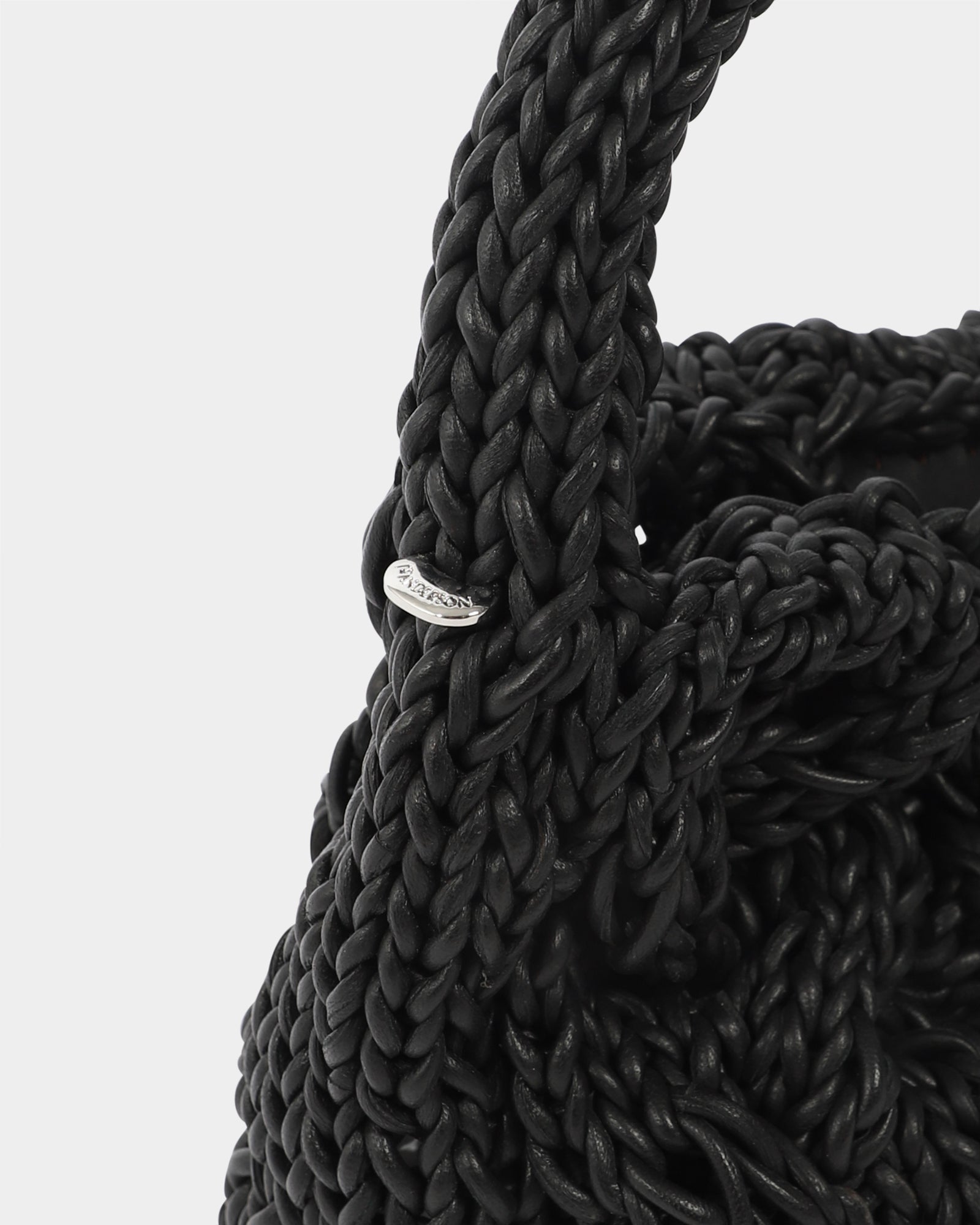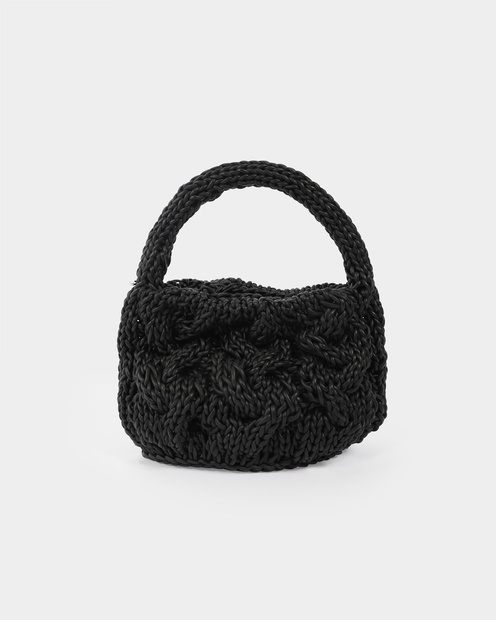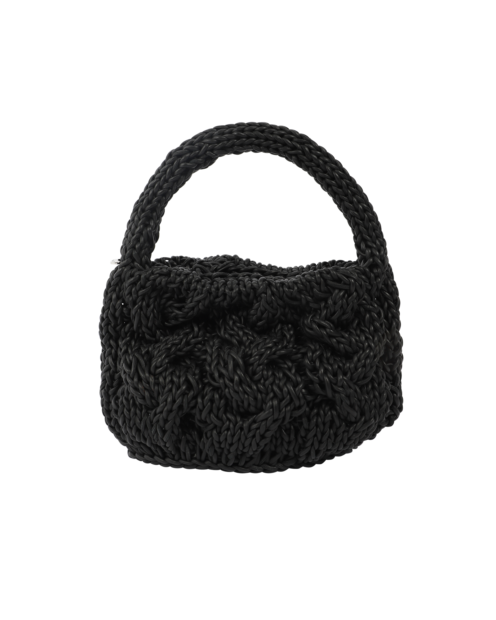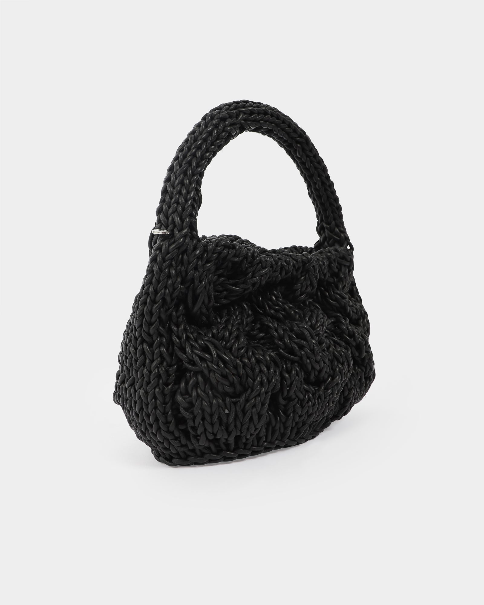 The Small Cable Knit Bag is hand knitted with a leather top handle, and has a magnet closure, a leather base with blind logo embossing and a silver bead logo engraved detailing on one side. Made in India.
