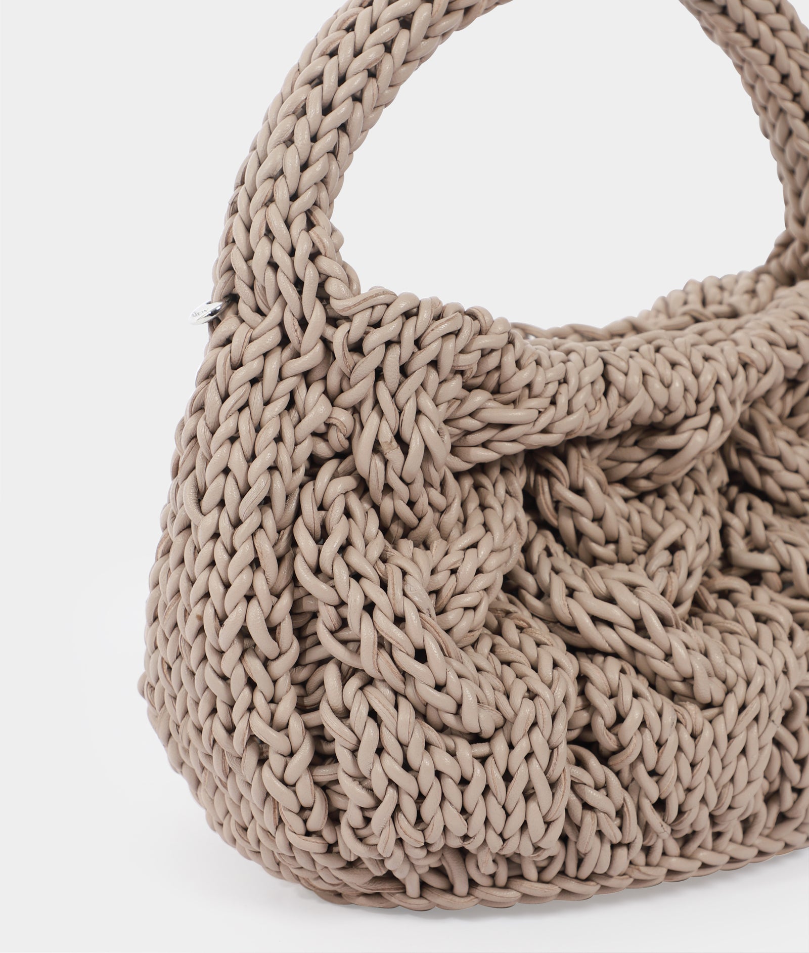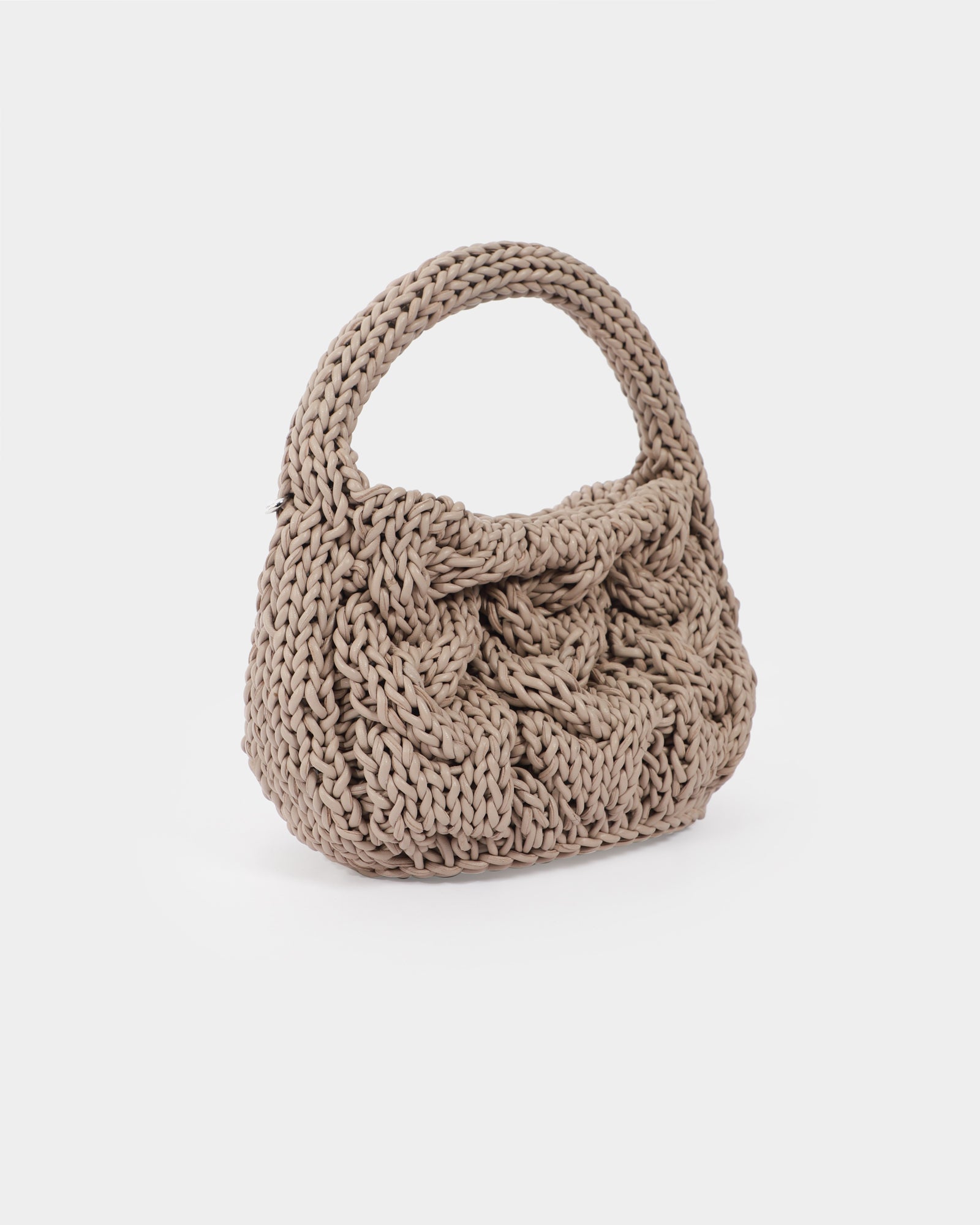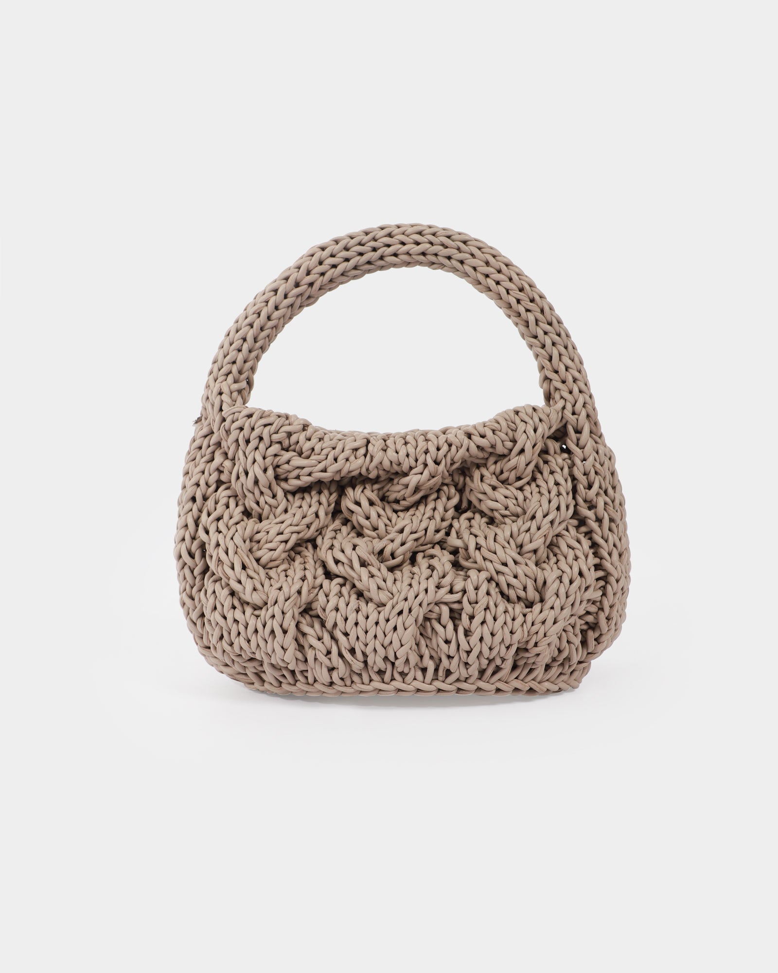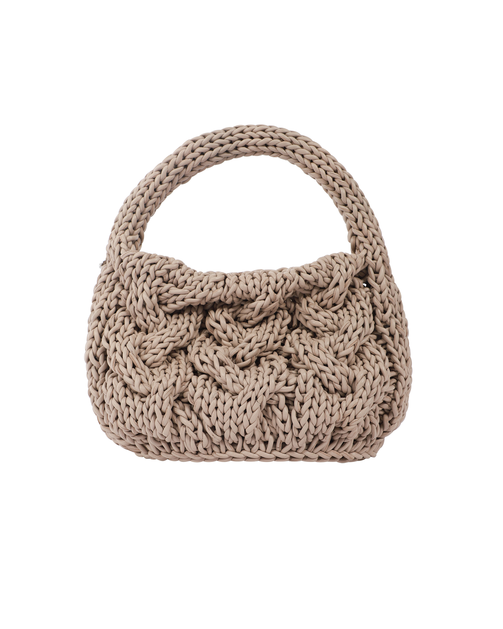 The Small Cable Knit Bag is hand knitted with a leather top handle, and has a magnet closure, a leather base with blind logo embossing and a silver bead logo engraved detailing on one side. Made in India.