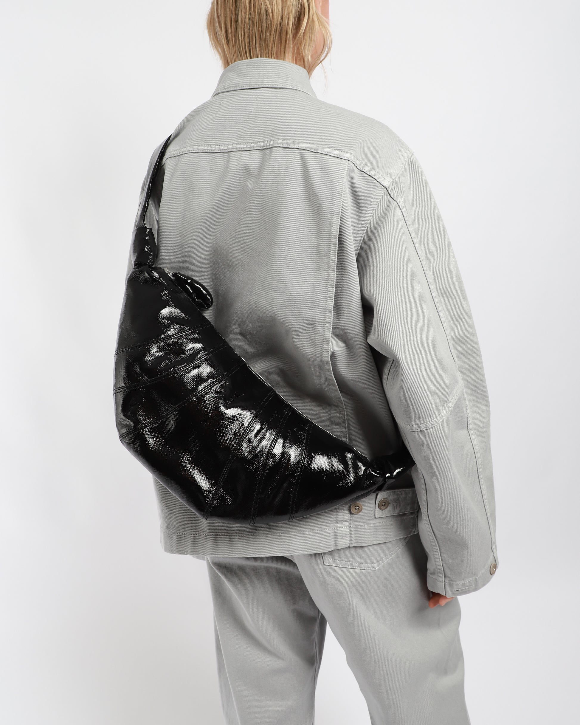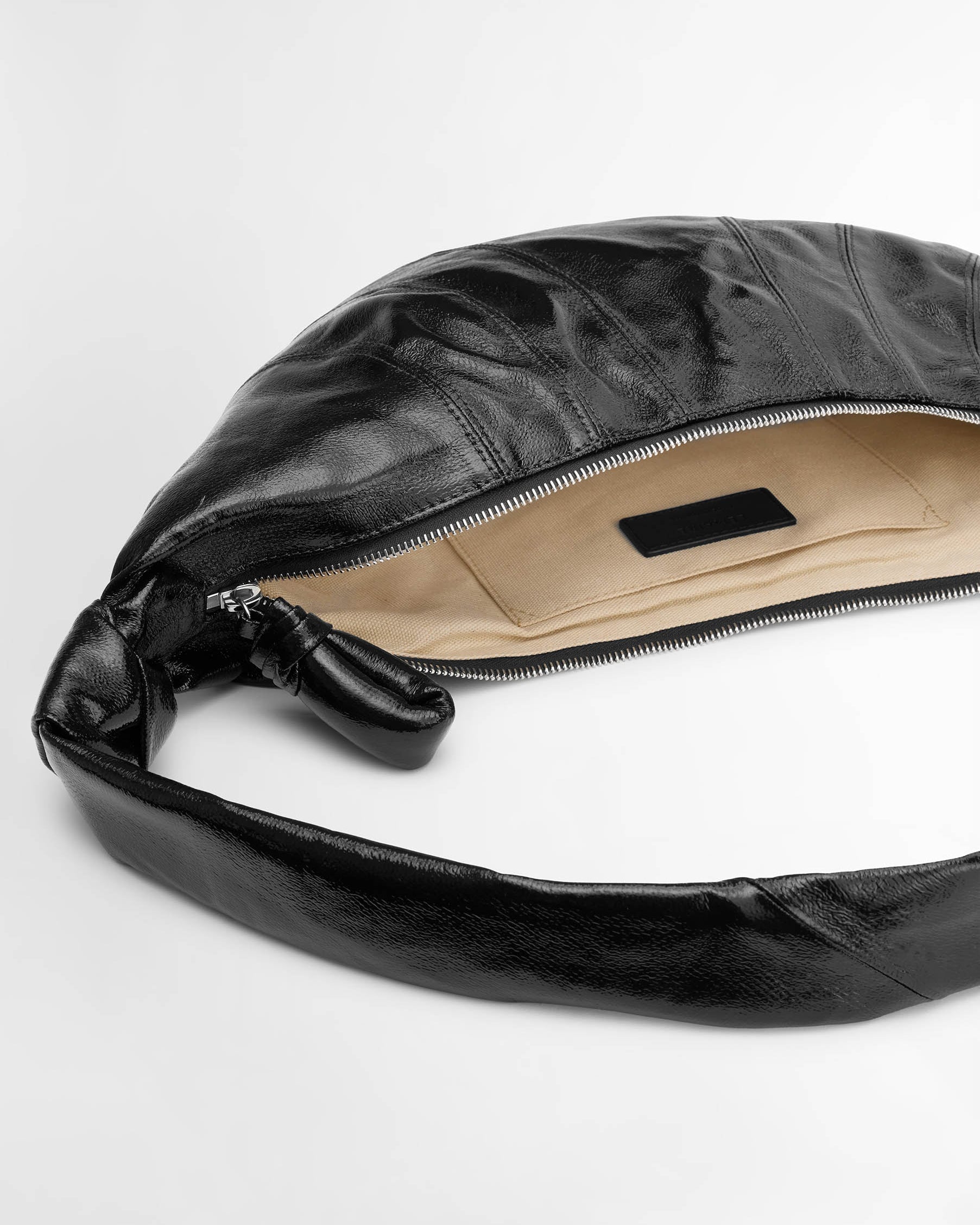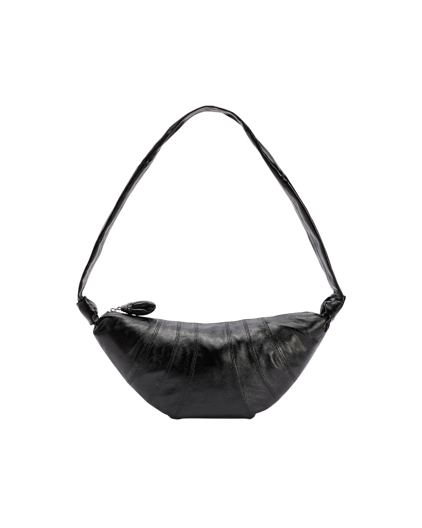 The Medium croissant is made of coated cotton with a crisp texture and a shiny finish, its distinctive surface adds a tactile element and contributes to its durability. Inspired by the shape of the eponymous pastry, this vegan bag is achieved through an assembly of top-stitched cutouts, blending style and functionality. It features a matching looped zip puller and side knot finishings. It will host small accessories such as a smartphone, a card holder and a wallet, and can be worn over the shoulder or cross-body. Made in Spain