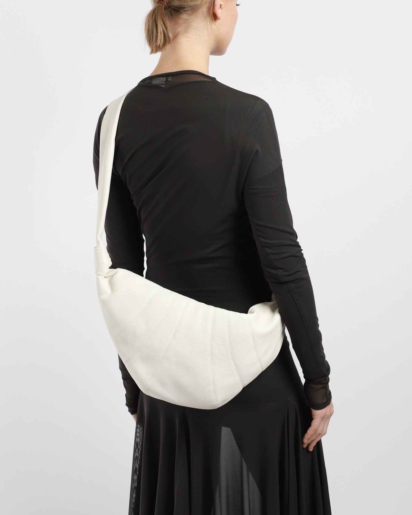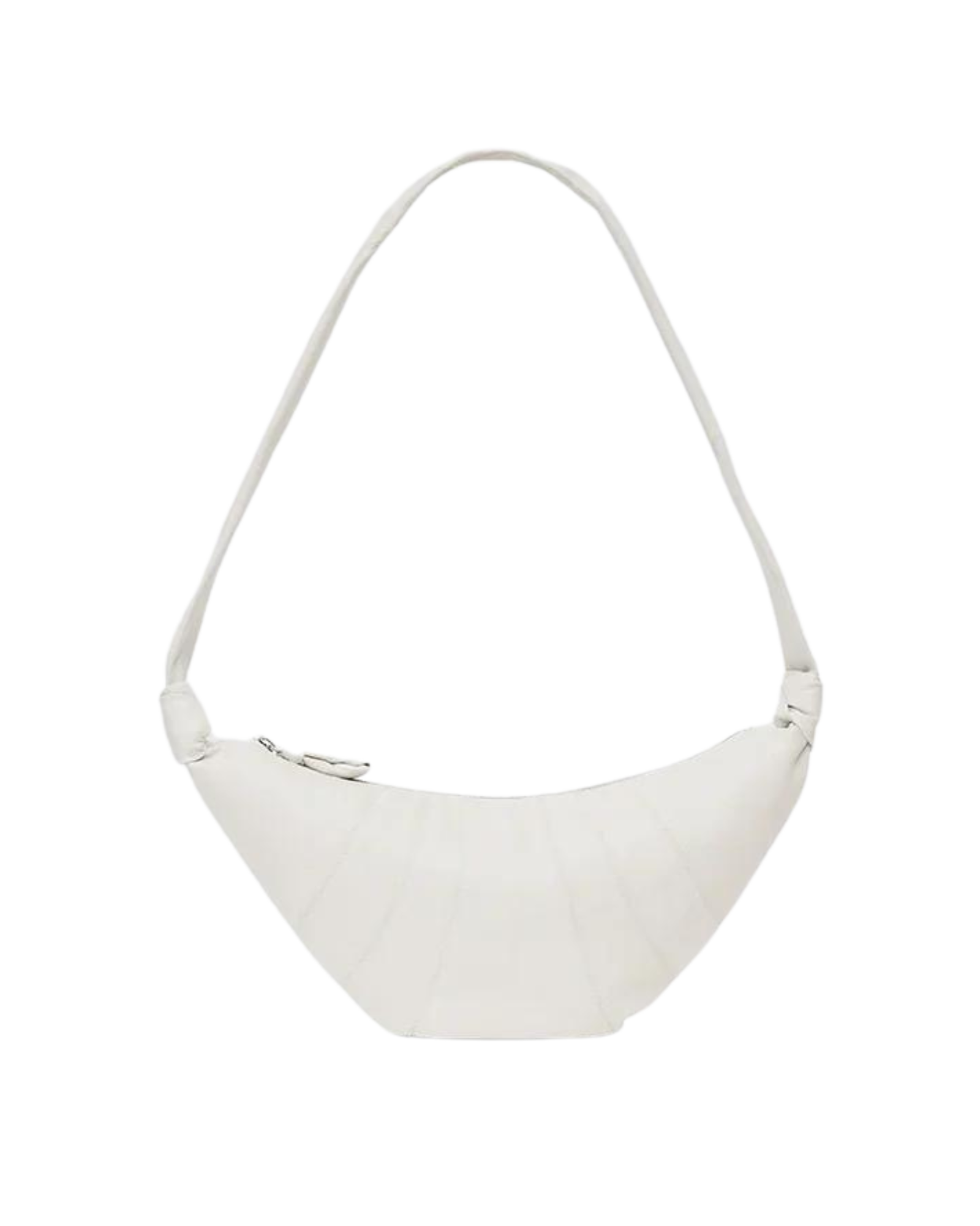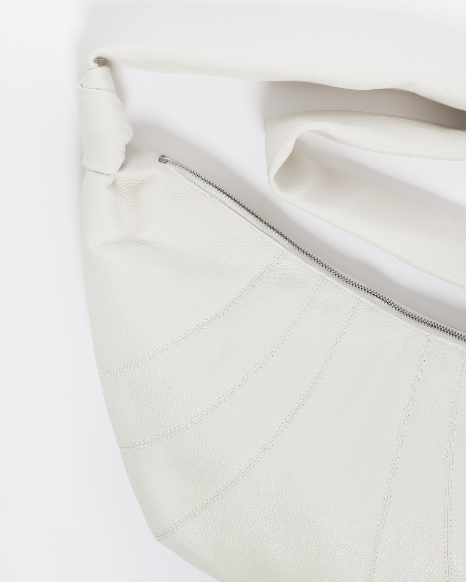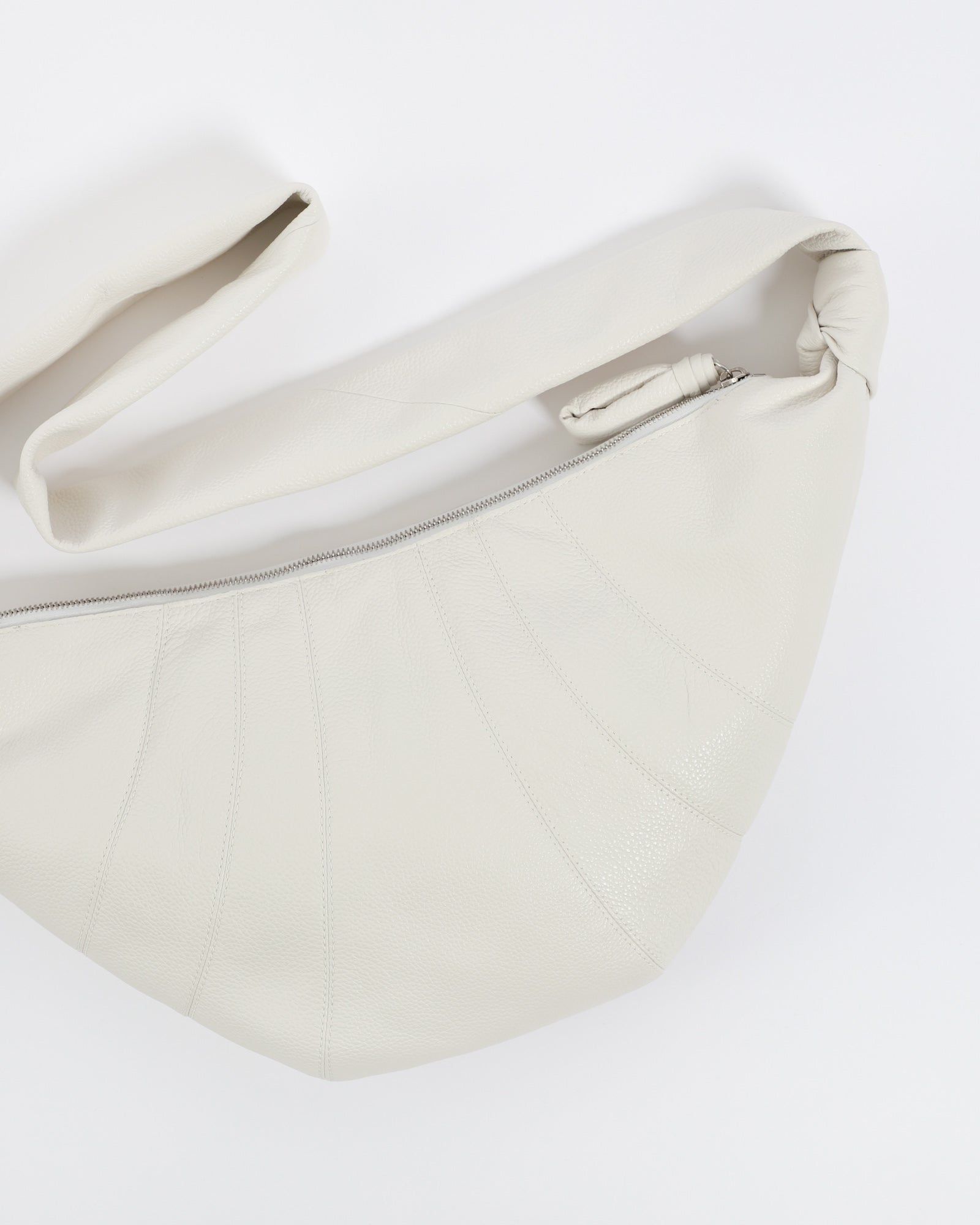 Lemaire's Medium Soft Grain Croissant Bag is made of soft grained leather that is supple yet resistant. Inspired by the shape of the croissant pastry, its design is achieved through an assembly of top-stitched cutouts, blending style and functionality. It also features a matching looped zip puller and side knot finishings. The Medium Croissant has the capacity for accessories such as a smartphone or 4x7-inch book. It can be worn as a shoulder or cross-body bag, expressing its versatility.