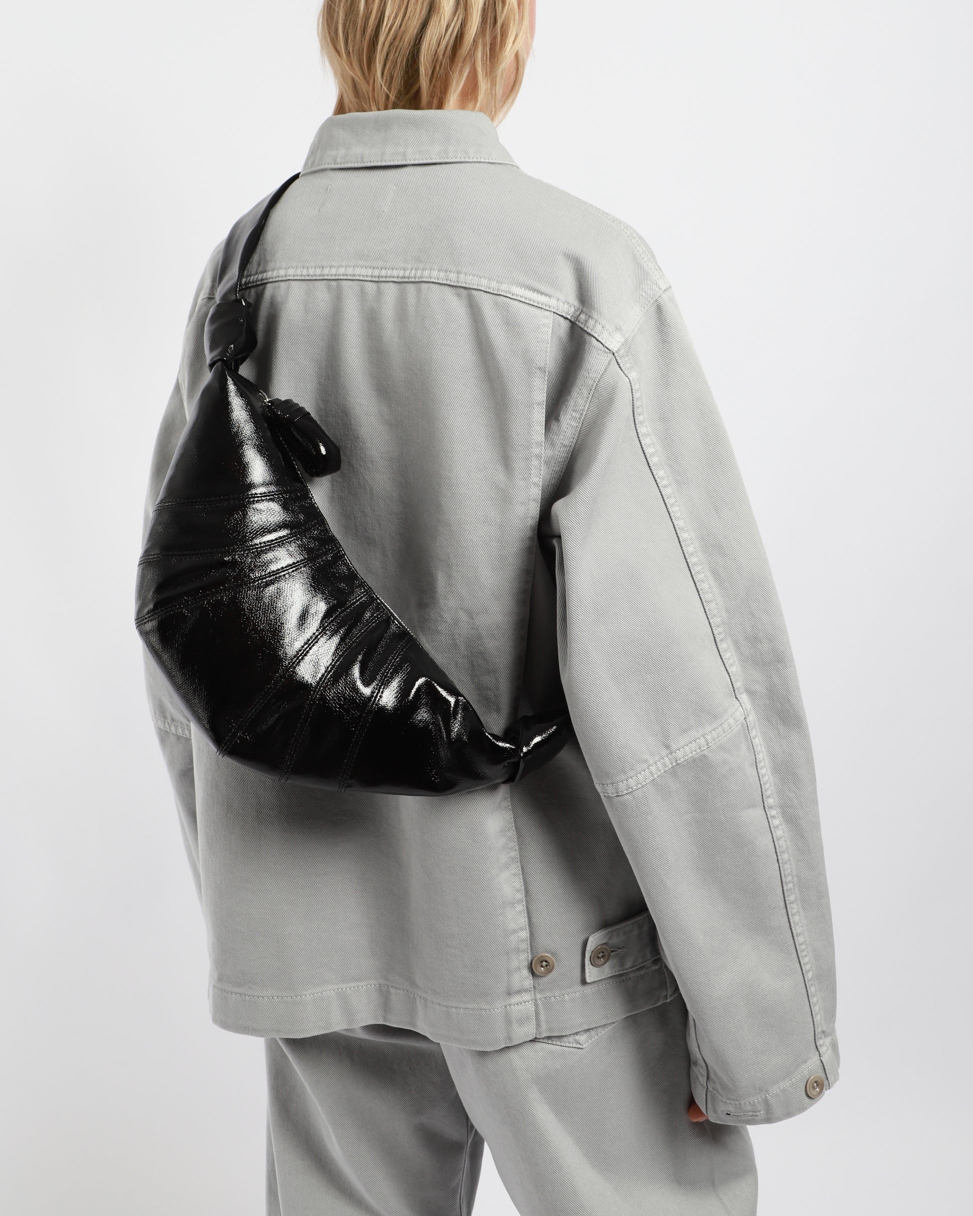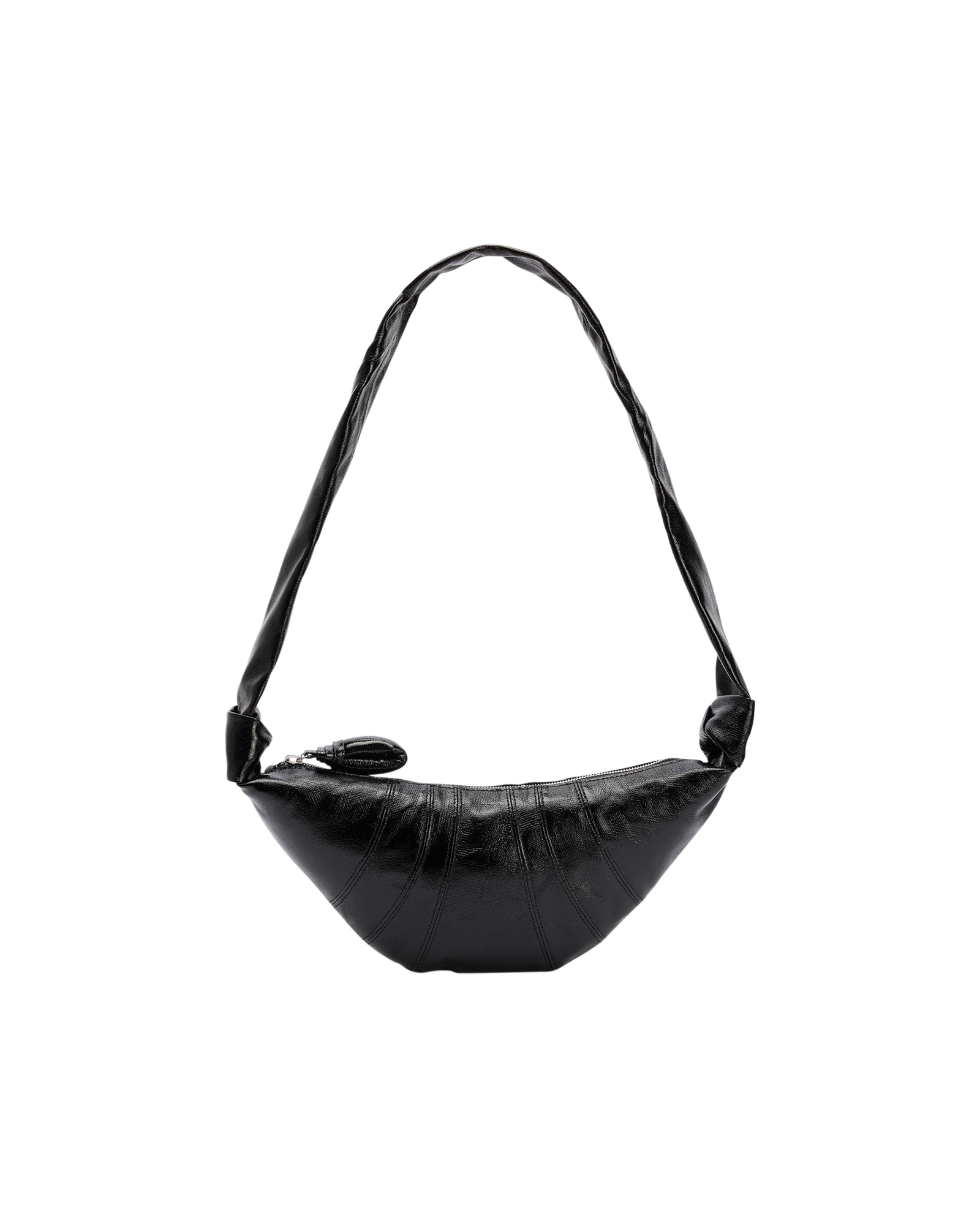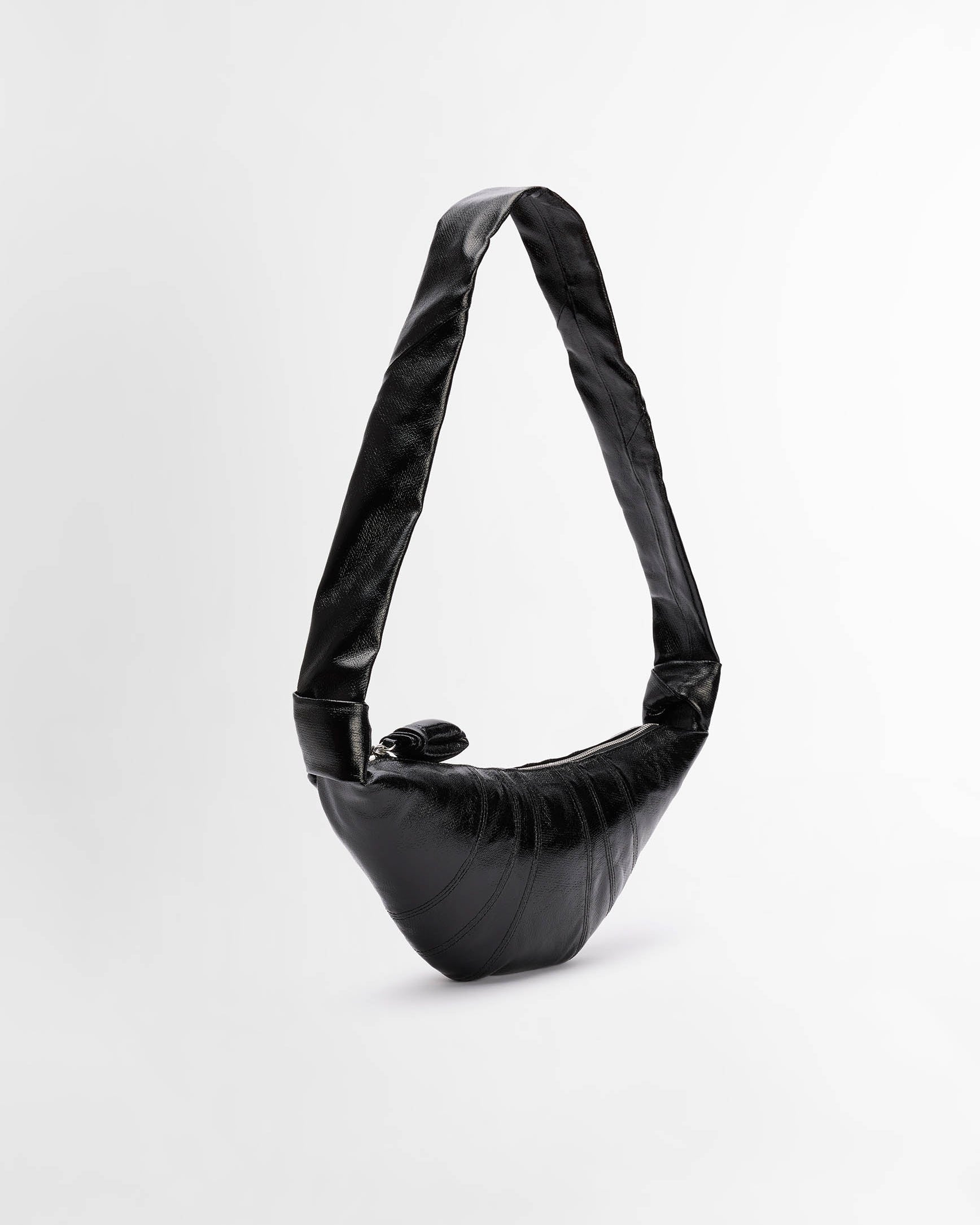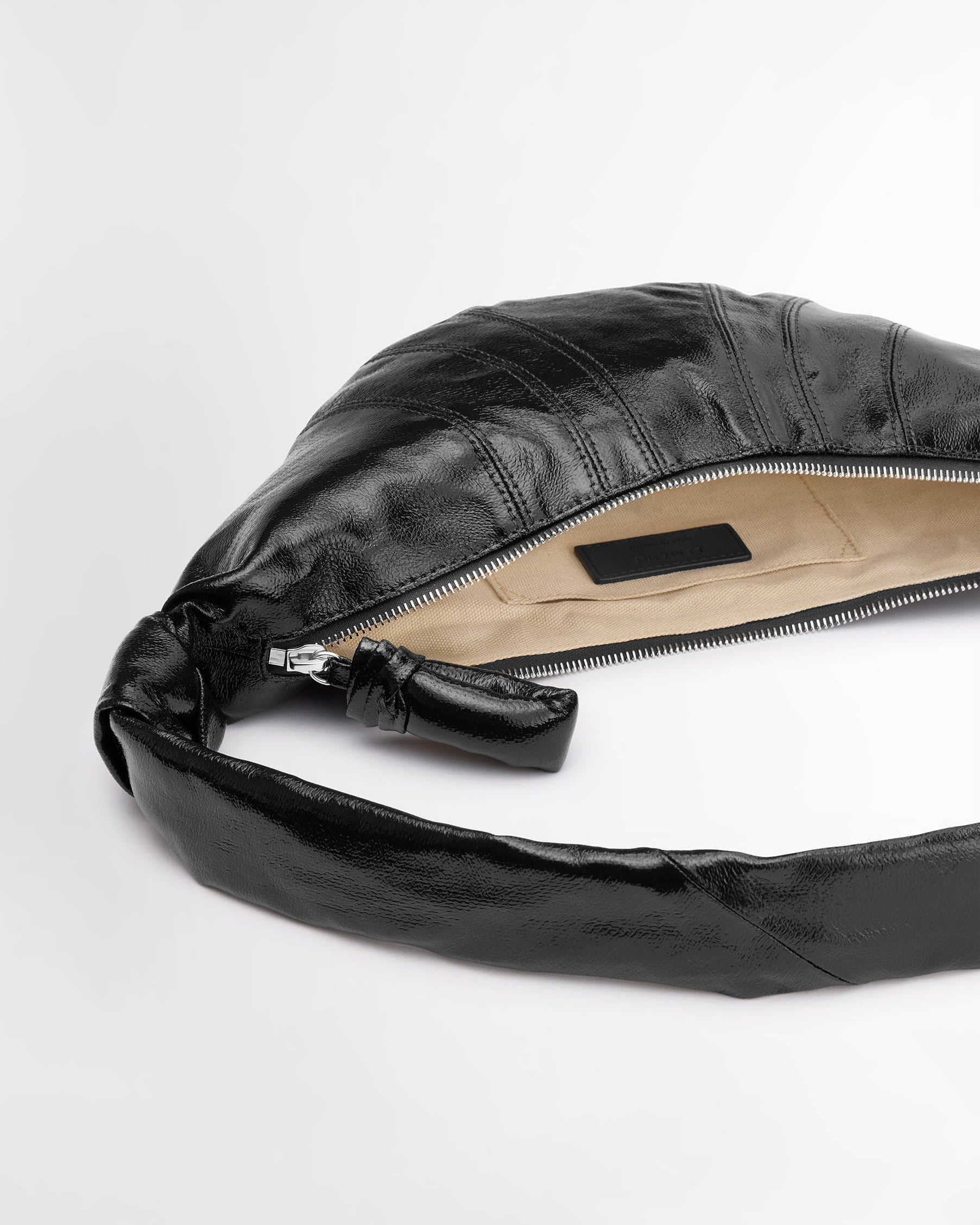 The Small Croissant is made from coated cotton with a crisp texture and a shiny finish, and has a distinctive surface that adds a tactile element and contributes to its durability. It has top-stitched cutouts, blending style and functionality, and features a matching looped zip puller and side knot finishings.