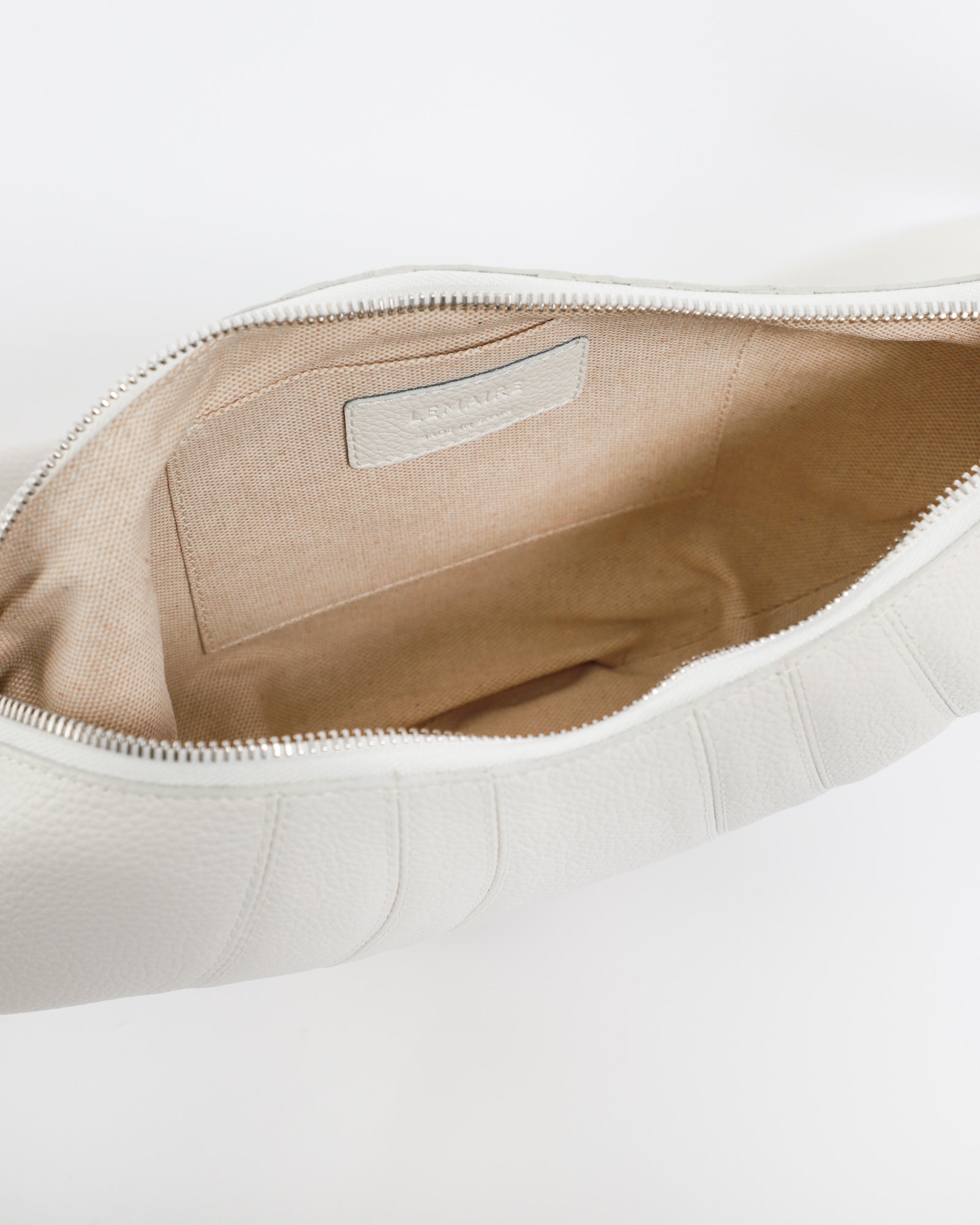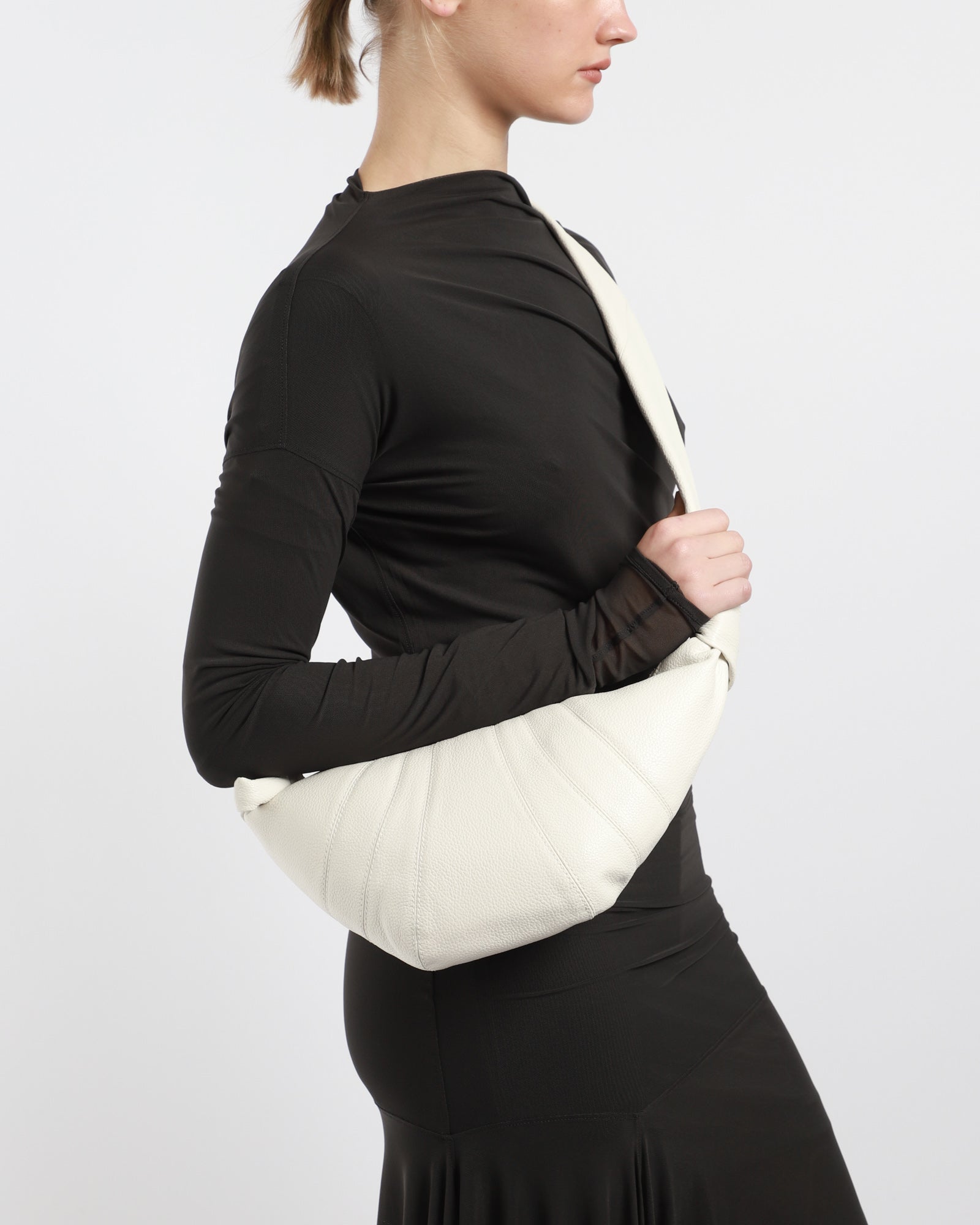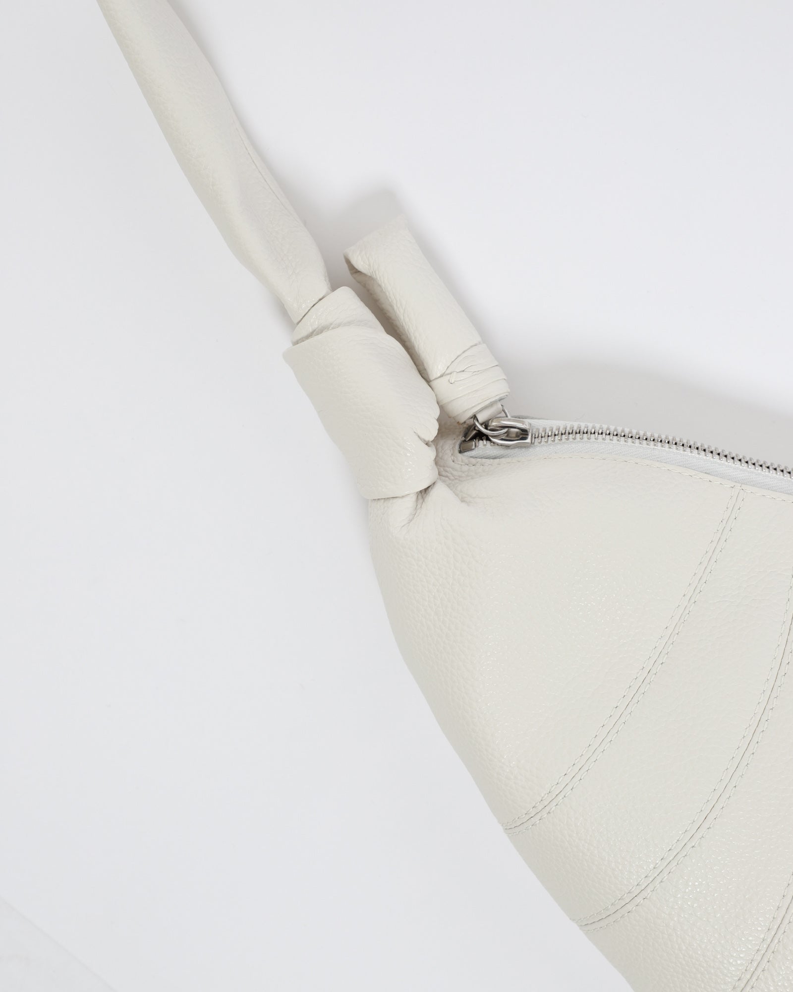 Lemaire's Small Soft Grain Croissant Bag is made of soft grained leather that is supple yet resistant. Inspired by the shape of the croissant pastry, its design is achieved through an assembly of top-stitched cutouts, blending style and functionality. It also features a matching looped zip puller and side knot finishings. The Small Croissant has the capacity for small accessories such as a smartphone, a card holder and a wallet.