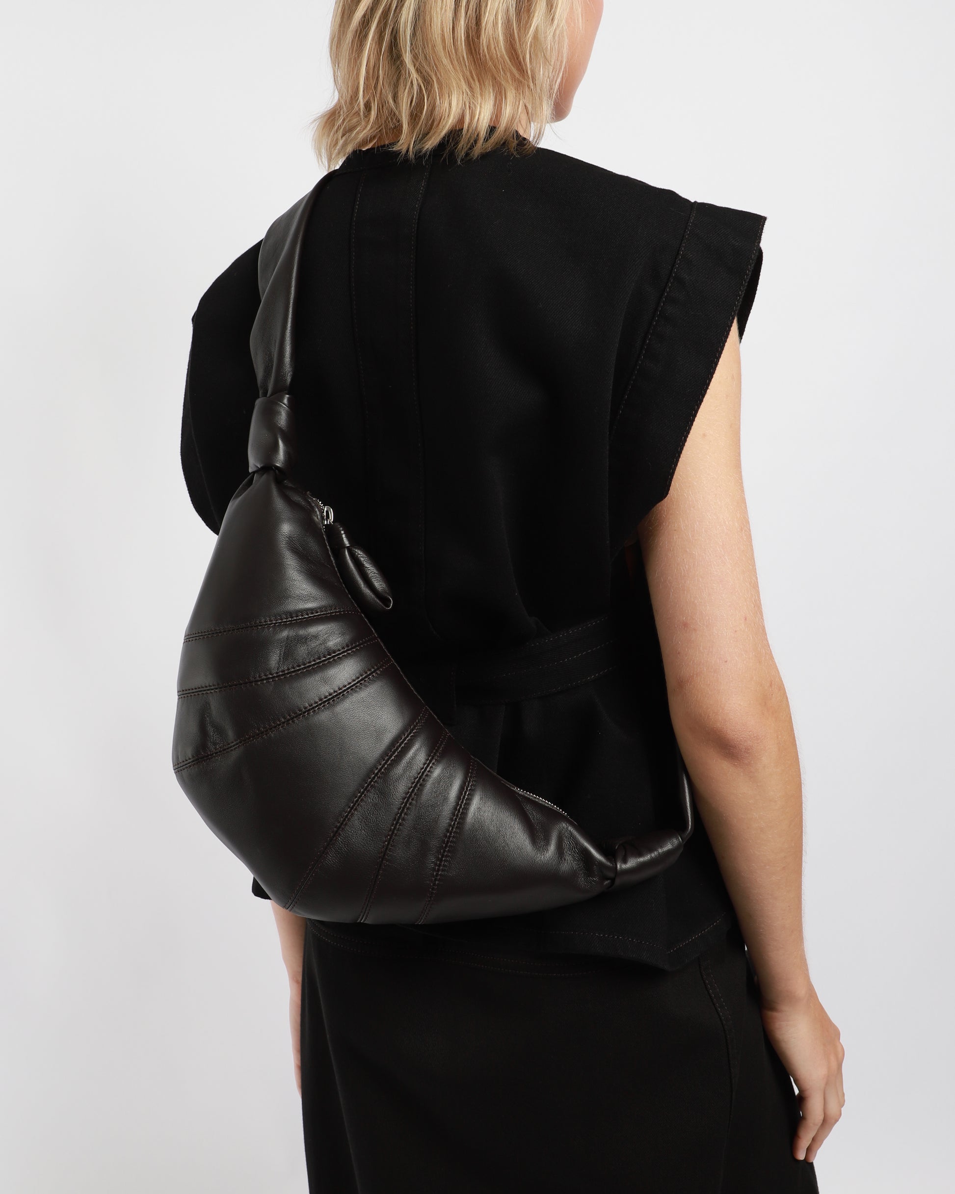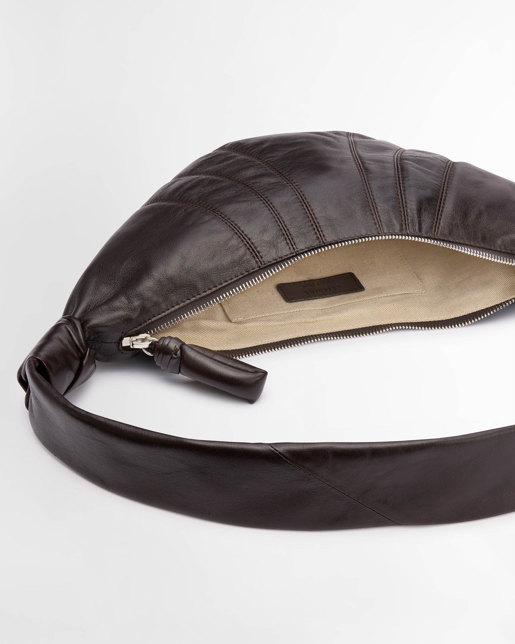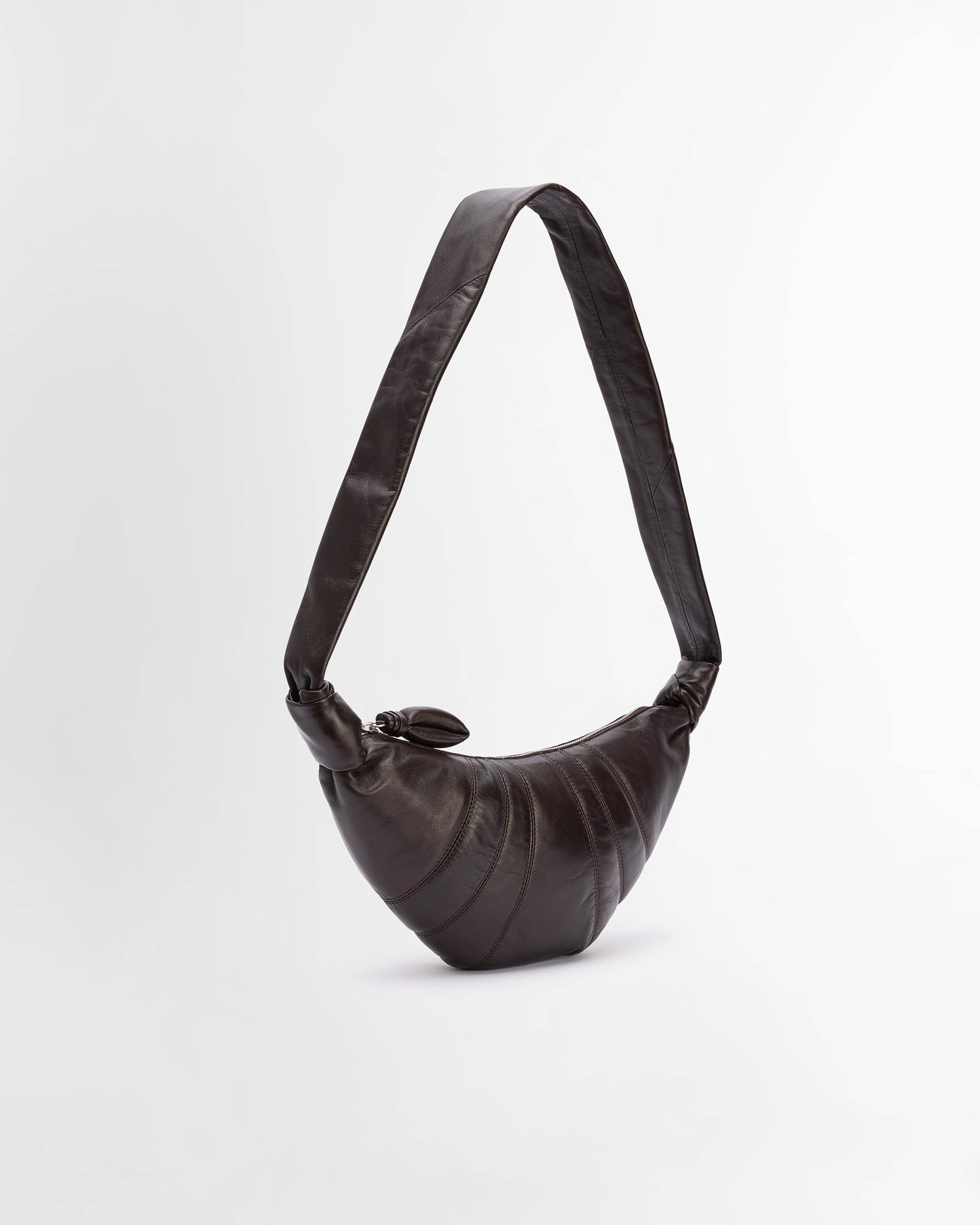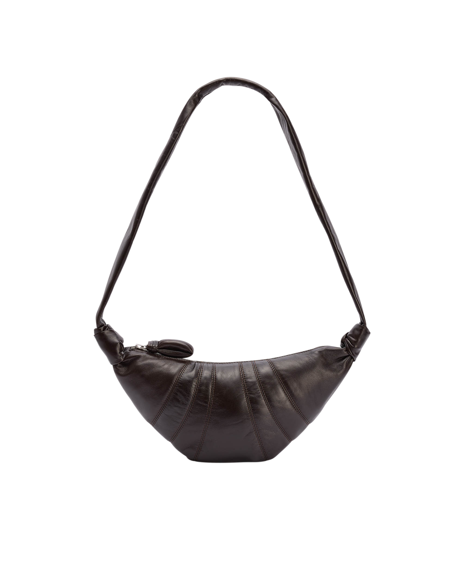 The Small Croissant is made of soft lamb nappa leather, a supple yet resistant fabric. Its smooth surface adds a tactile element and contributes to the durability of the bag’s curve. It features a matching looped zip puller and side knot finishing and has the capacity for small accessories such as a smartphone, a card holder and a wallet. Made in Spain.
