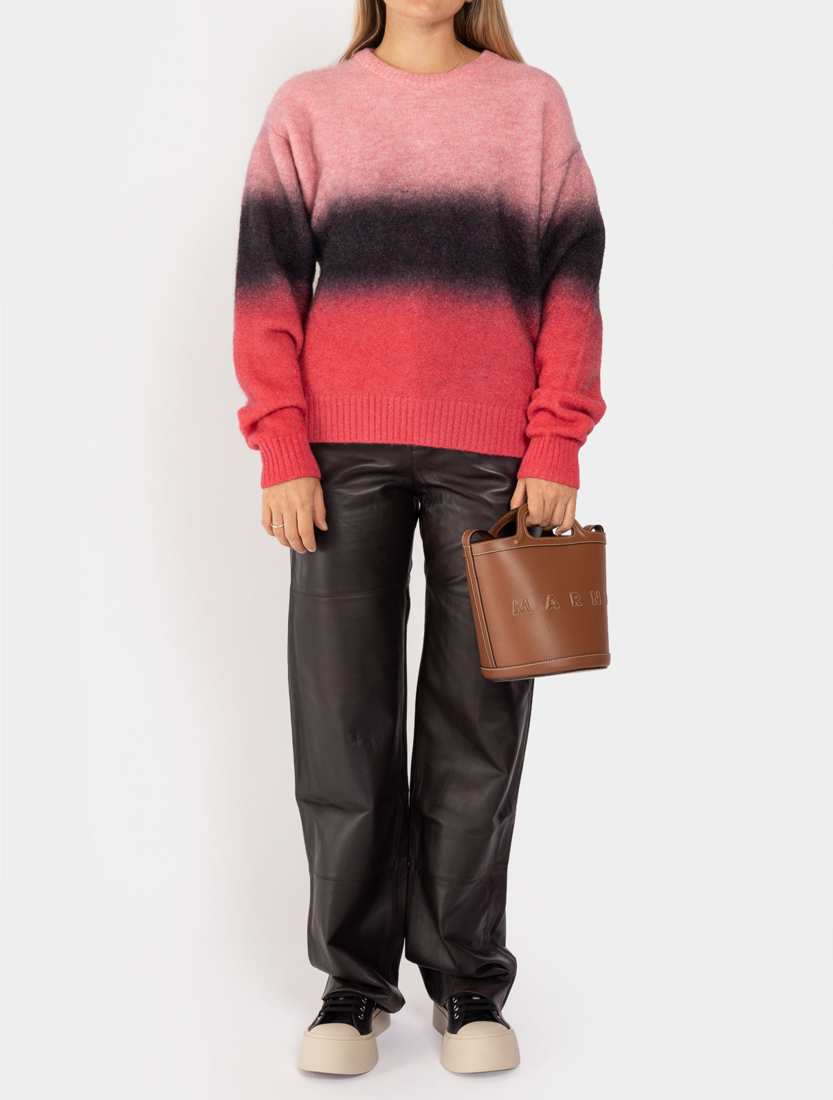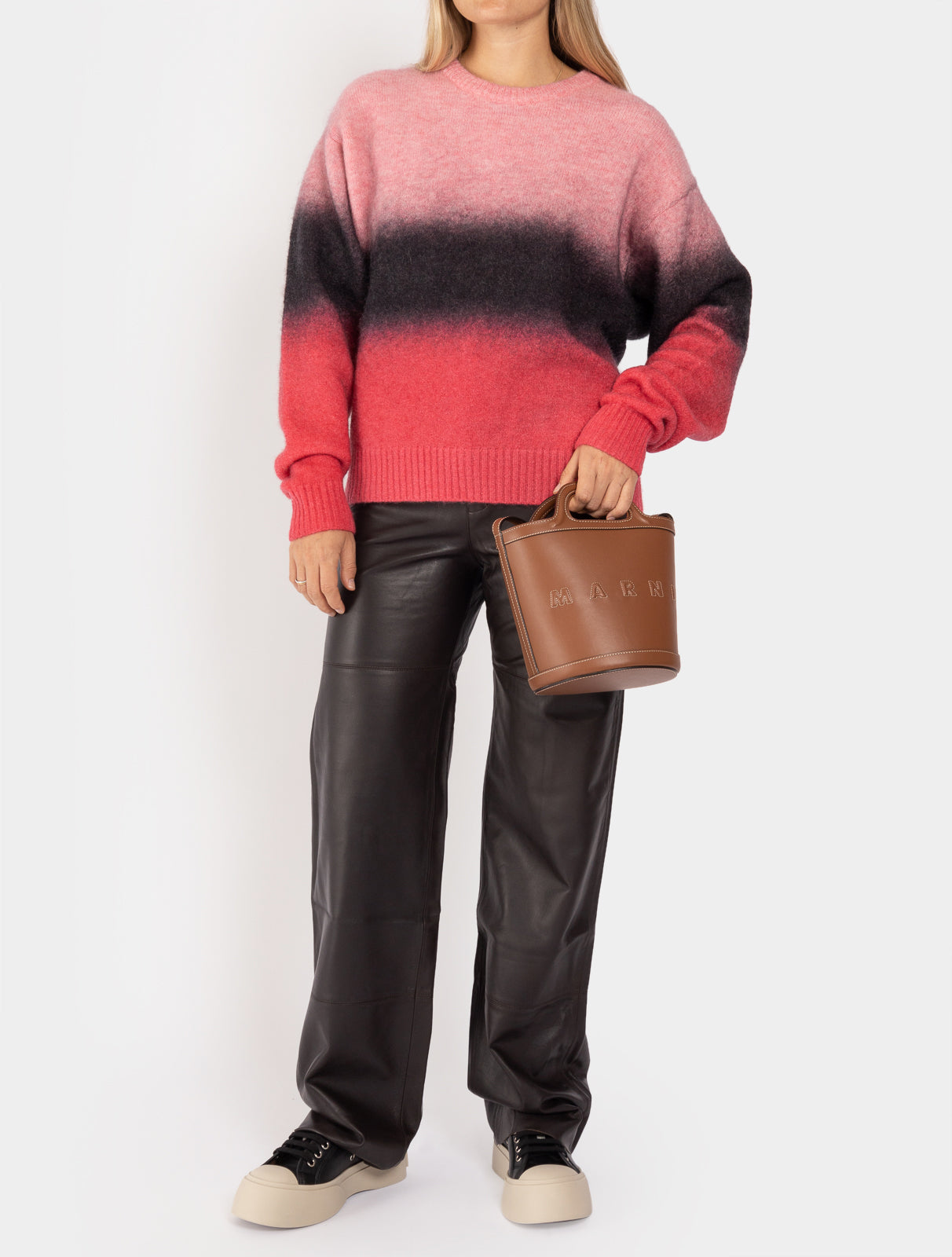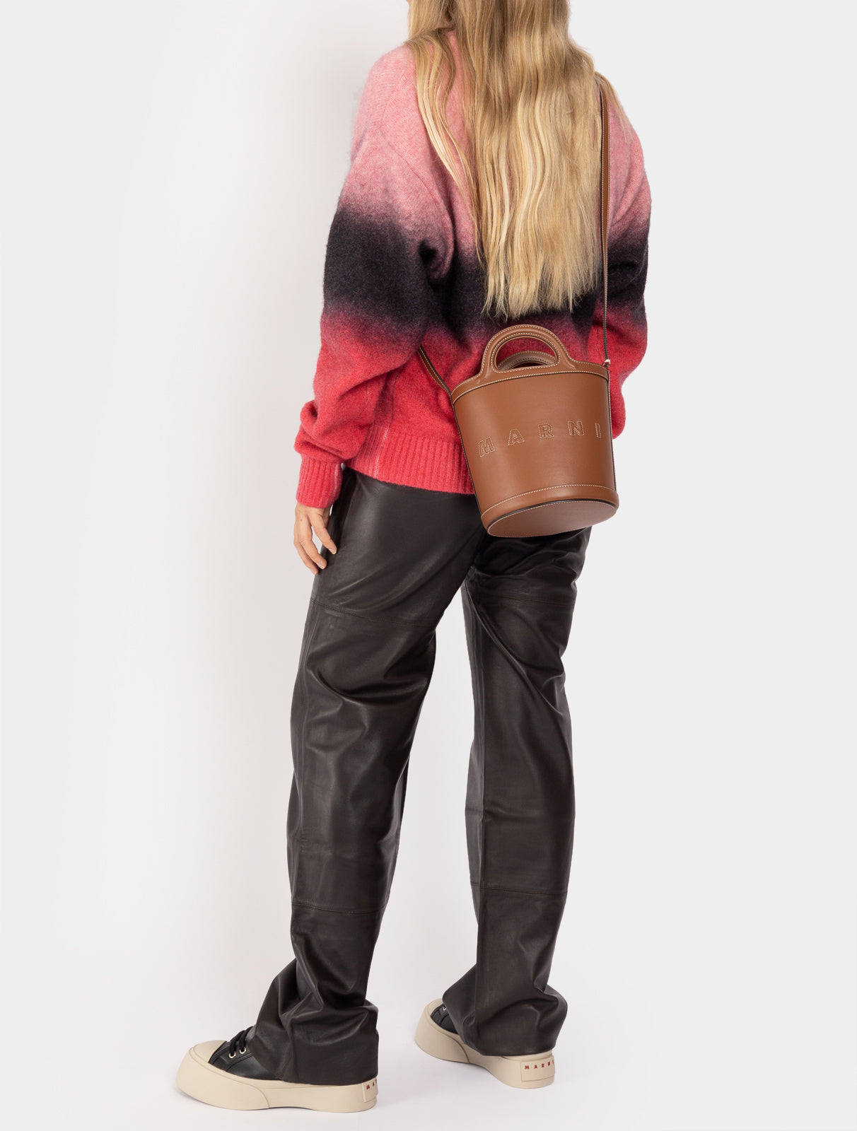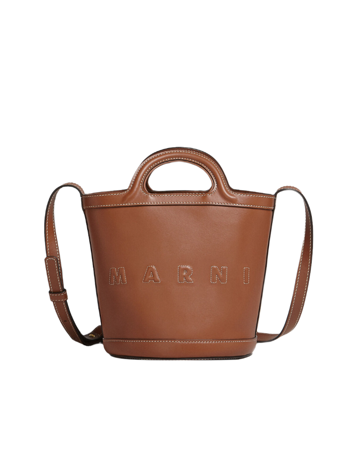 Marni mini sized bucket bag made of leather, featuring contrast stitch detailing, handles with relief detail, optional long leather shoulder strap, fabric lining with interior zip pocket, gold tone hardware and embroidered logo front.