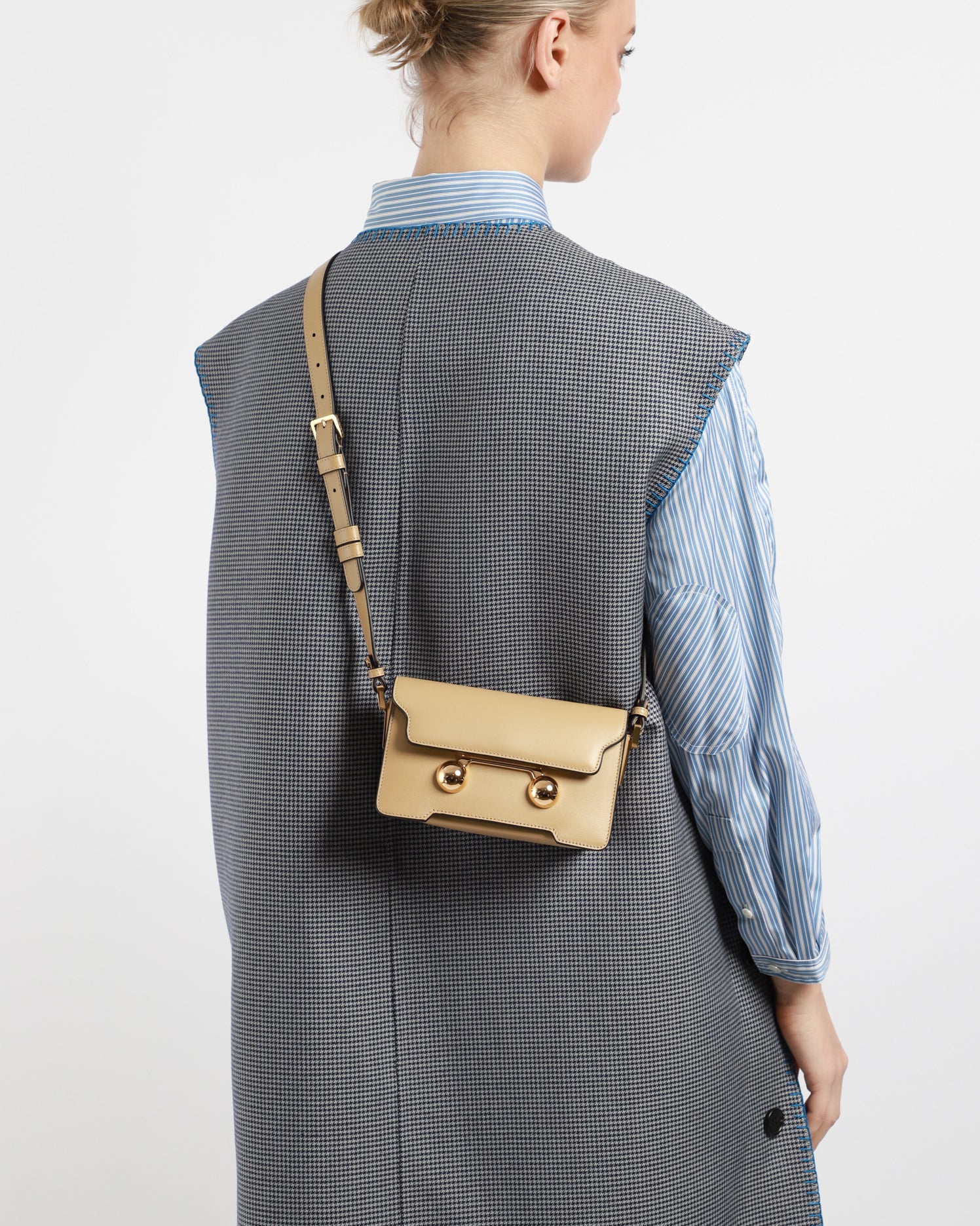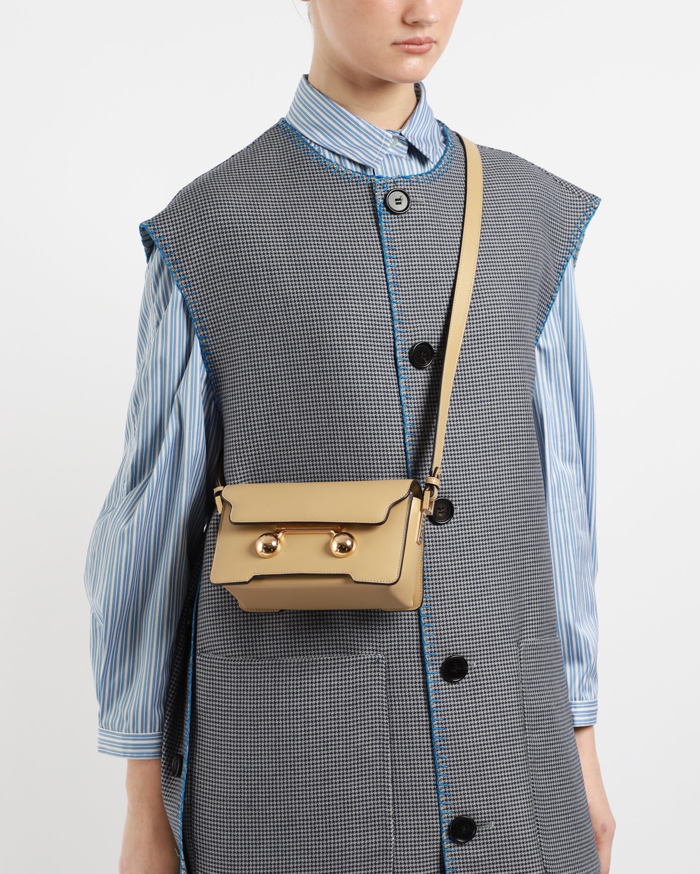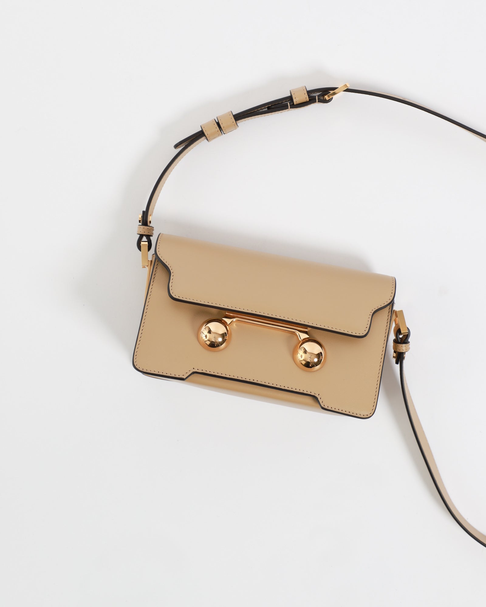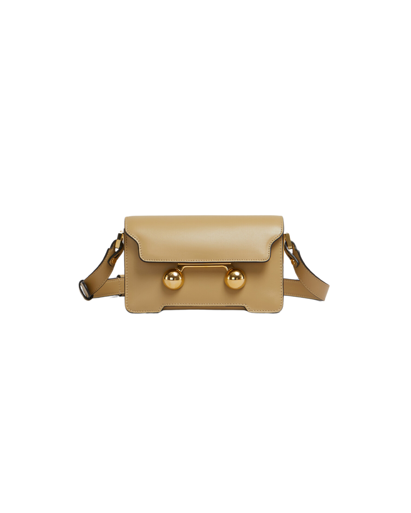 The Trunkaroo mini shoulder bag is crafted from calfskin leather with a front flap and magnetic closure. It features engraved Marni lettering and oversized stud details, a single compartment, and an inner pocket. The detachable, adjustable shoulder strap allows it to also be worn as a clutch. Made in Italy.