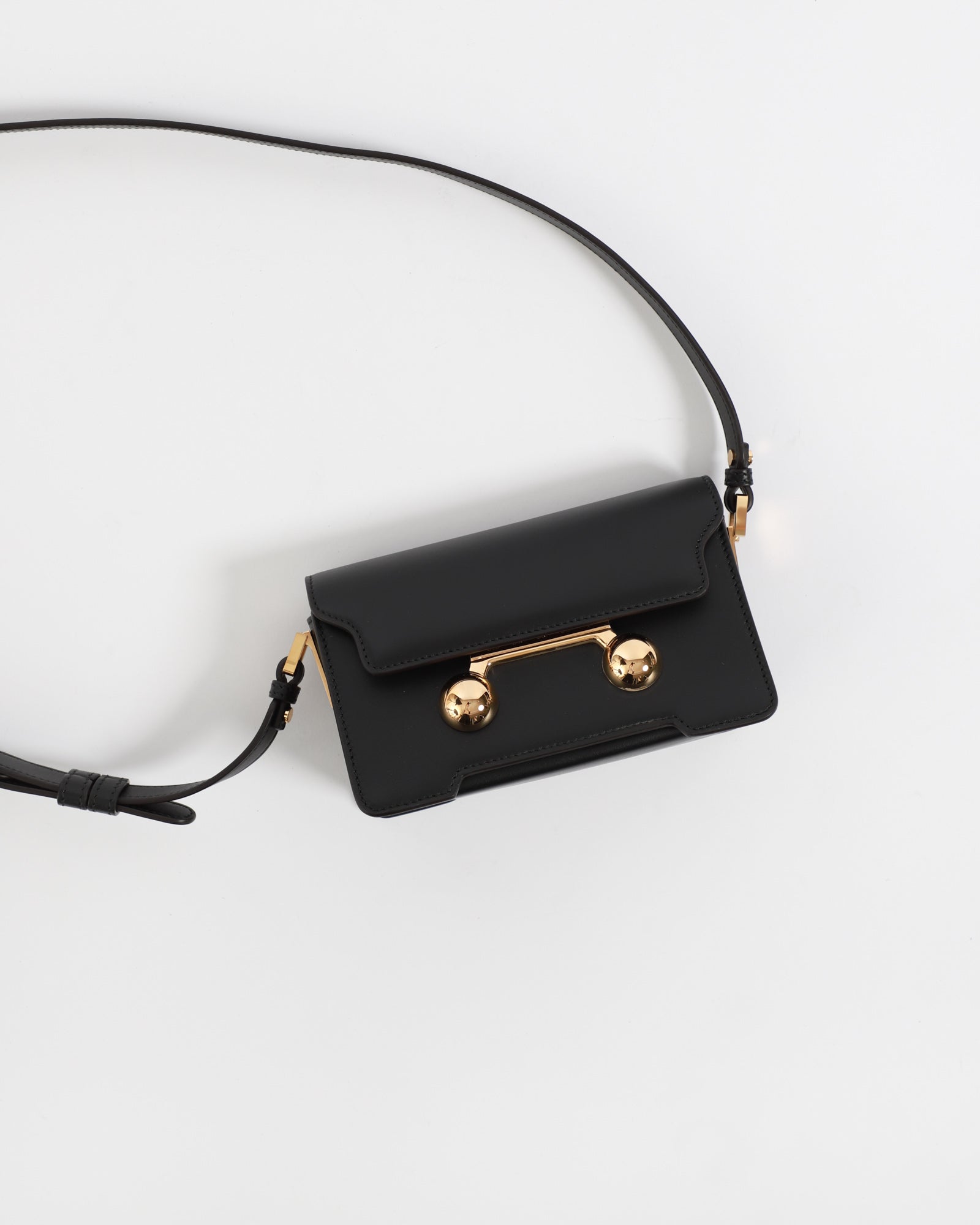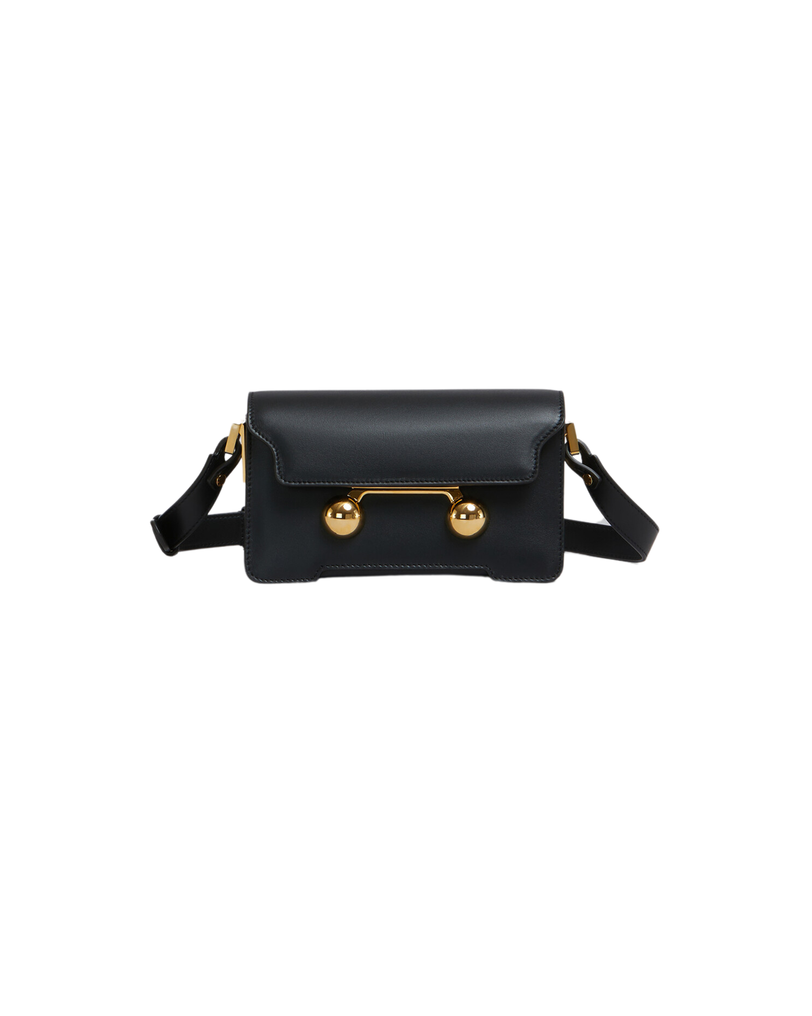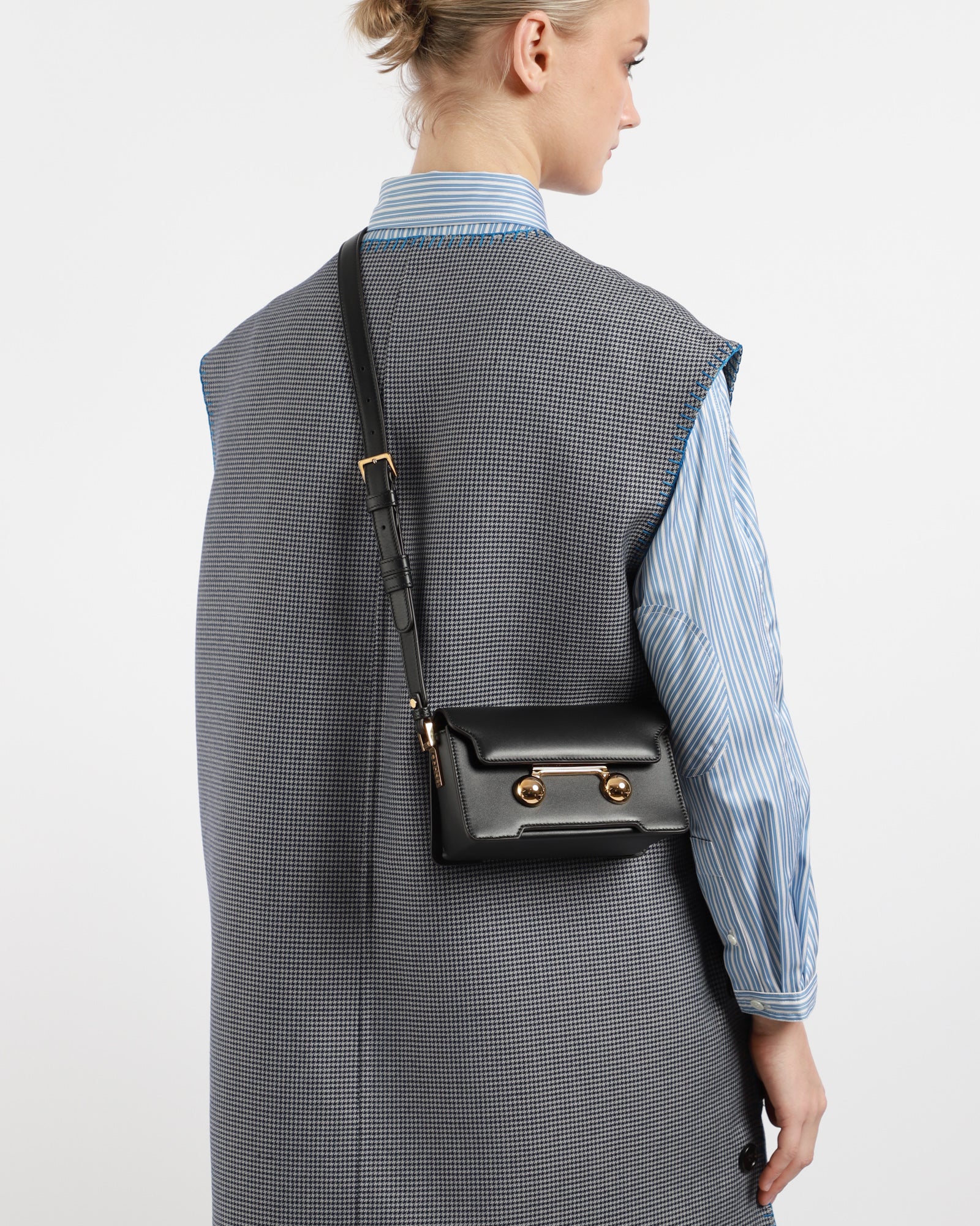 The Trunkaroo mini shoulder bag is crafted from calfskin leather with a front flap and magnetic closure. It features engraved Marni lettering and oversized stud details, a single compartment, and an inner pocket. The detachable, adjustable shoulder strap allows it to also be worn as a clutch. Made in Italy.