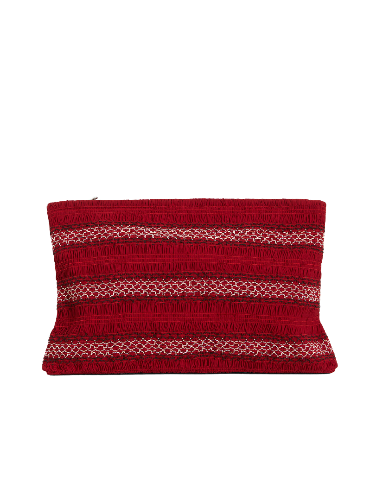 Clutch from Molly Goddard featuring a semi-structured medium size in polyester fabric, all-over ruched and shirring detail, exposed zip top to close.