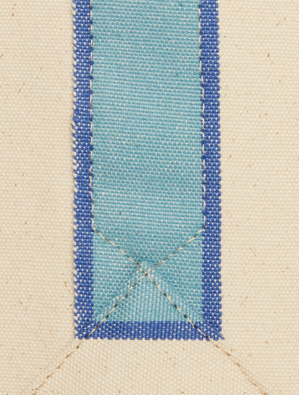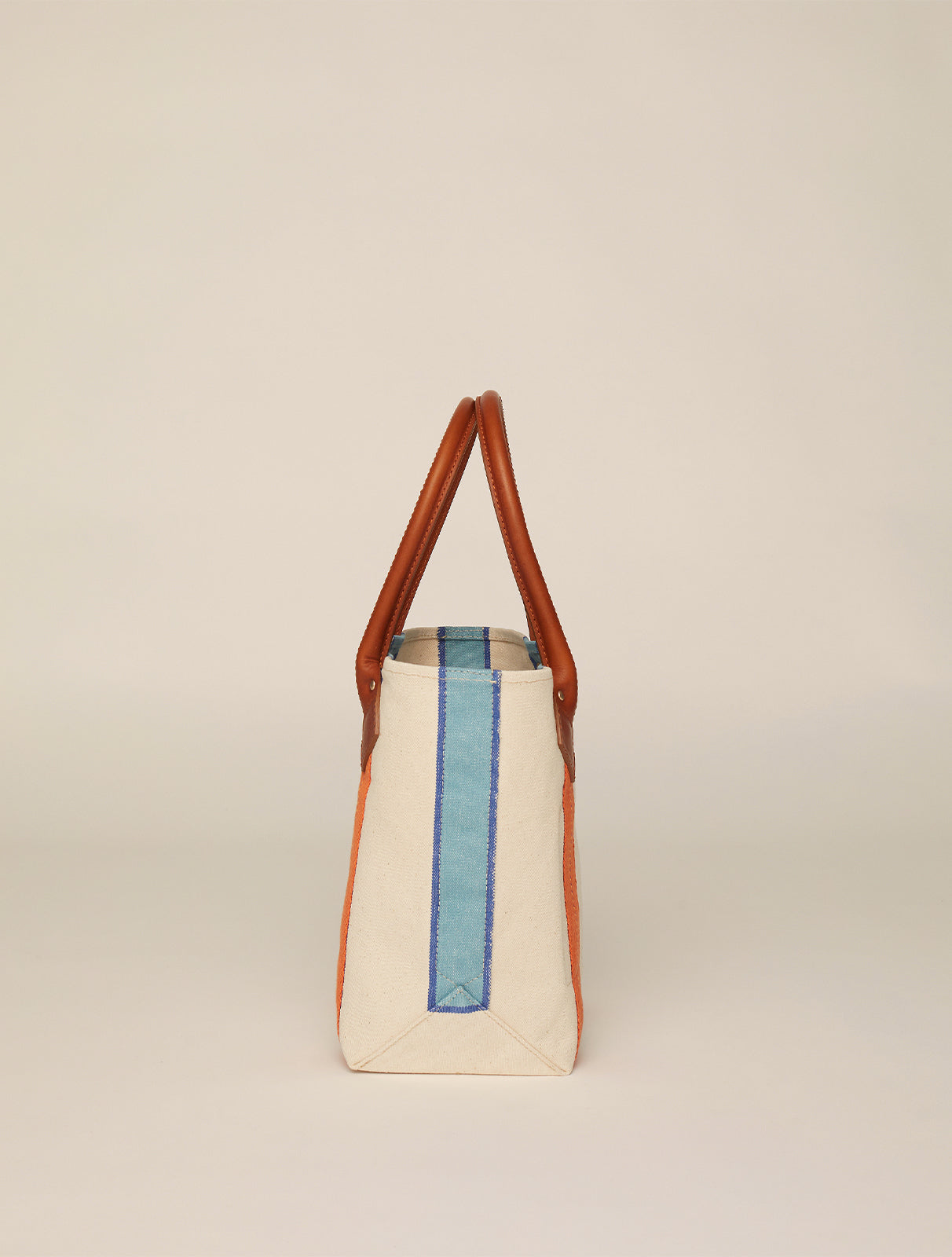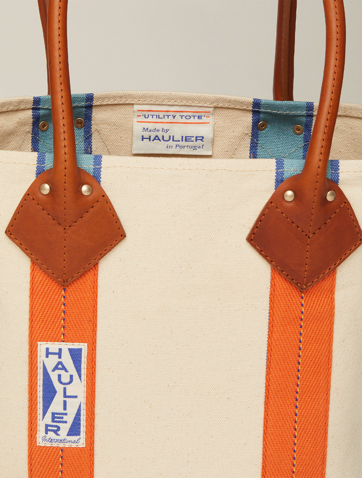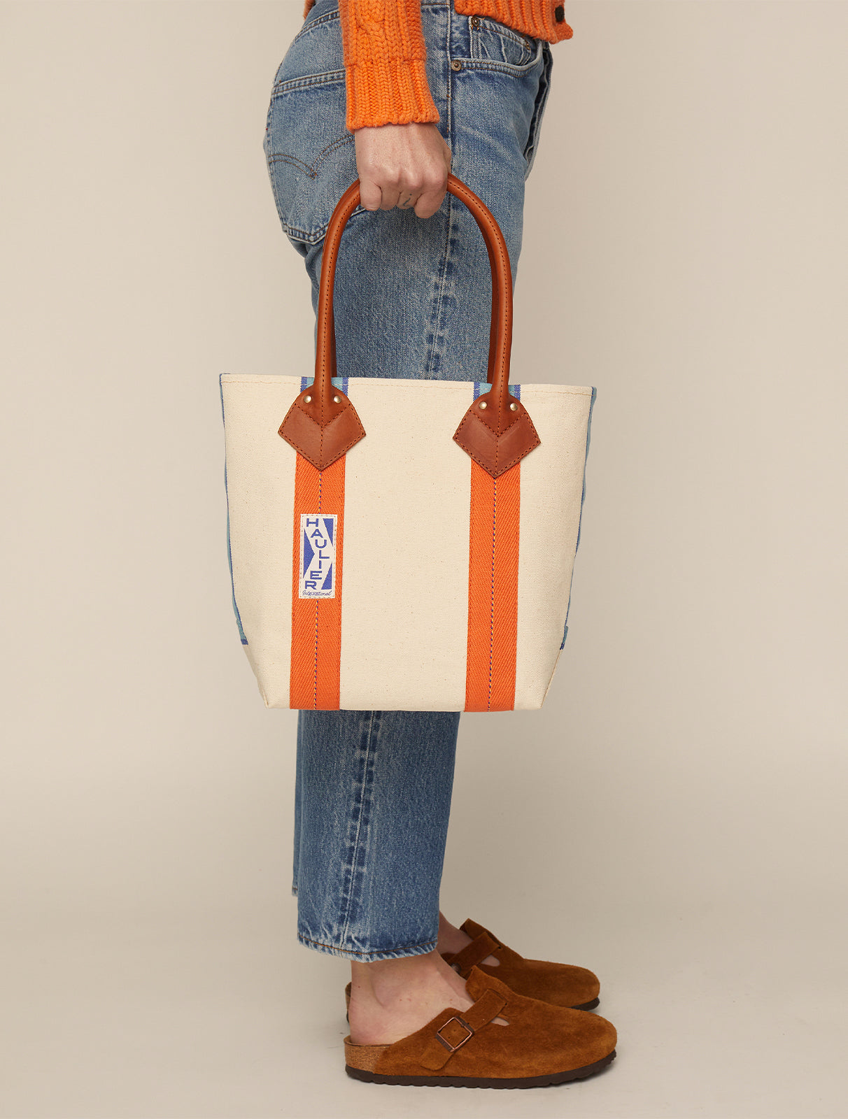 Small all-purpose tote bag from Haulier crafted from a selvedge canvas woven to size on mid-centruy shuttle looms which allows for zero cutting waste. The tote bag features leather handles and internal patch pocket with debossed stamp, solid brass rivets, signature webbing and contrast construction stripes.