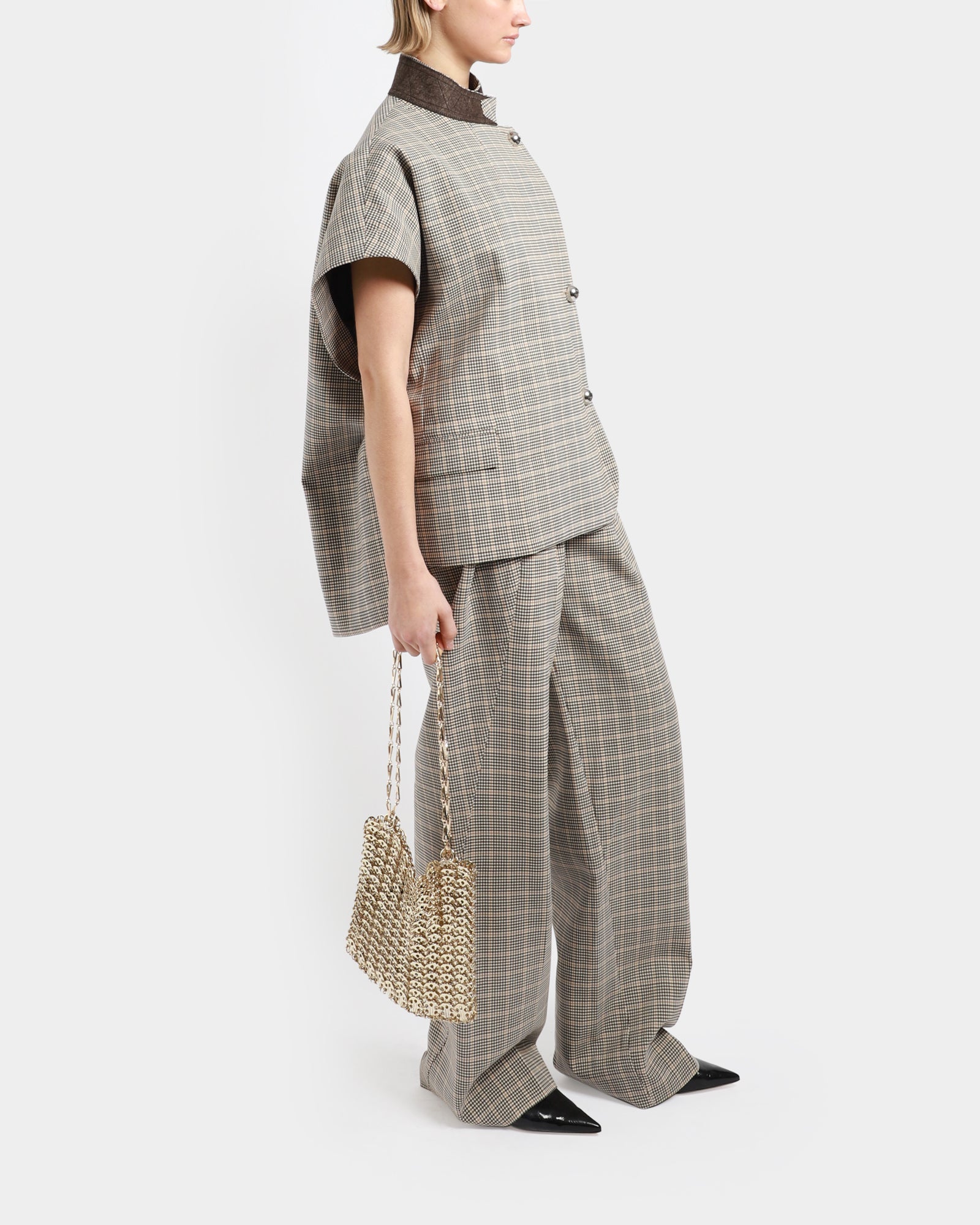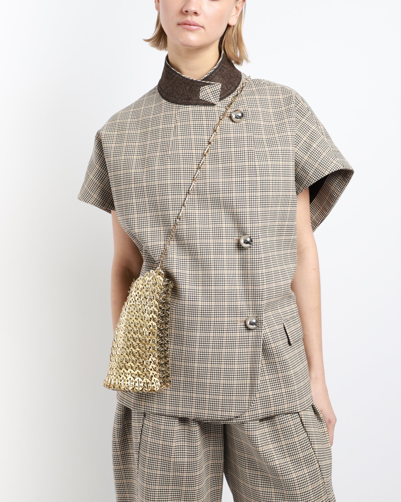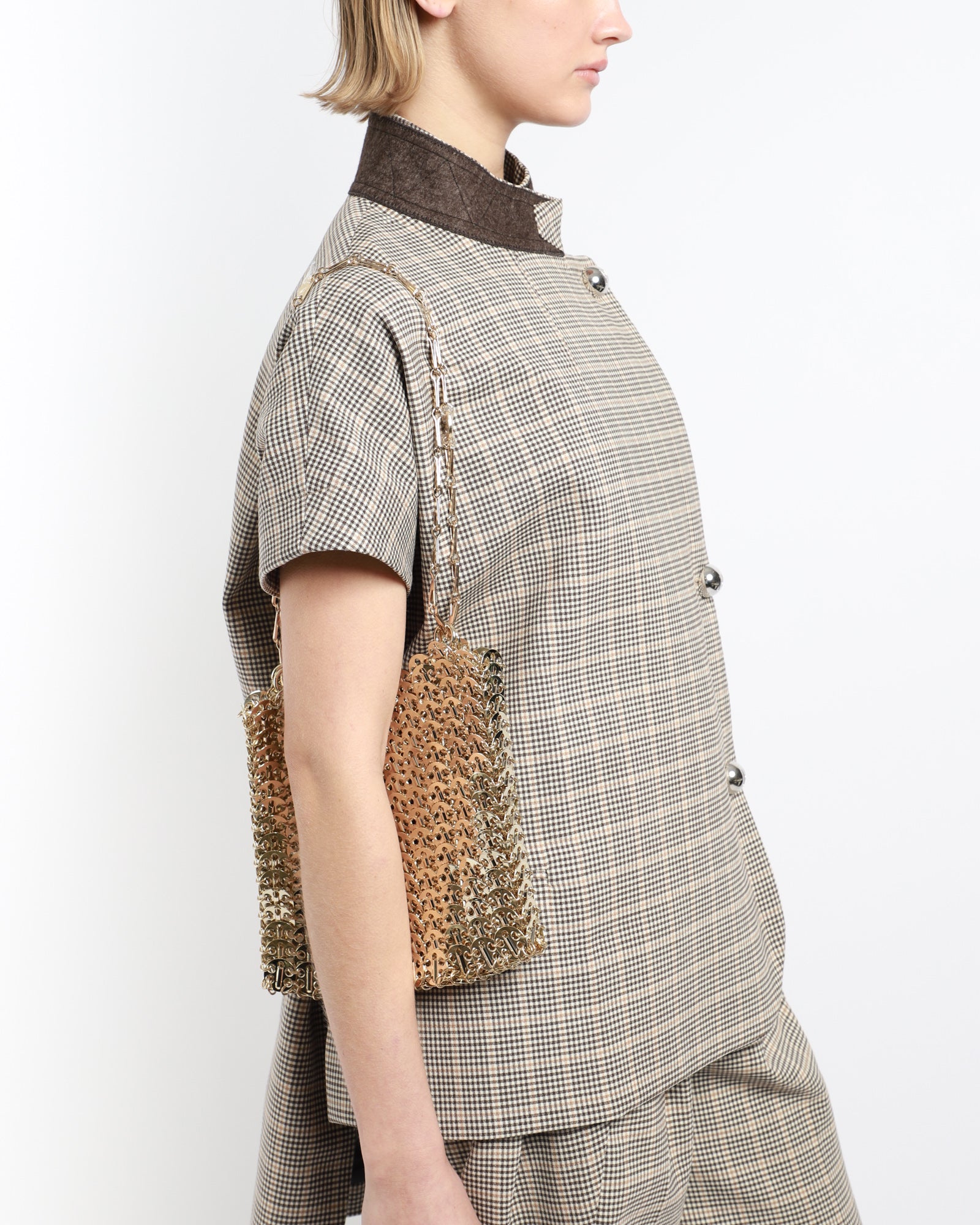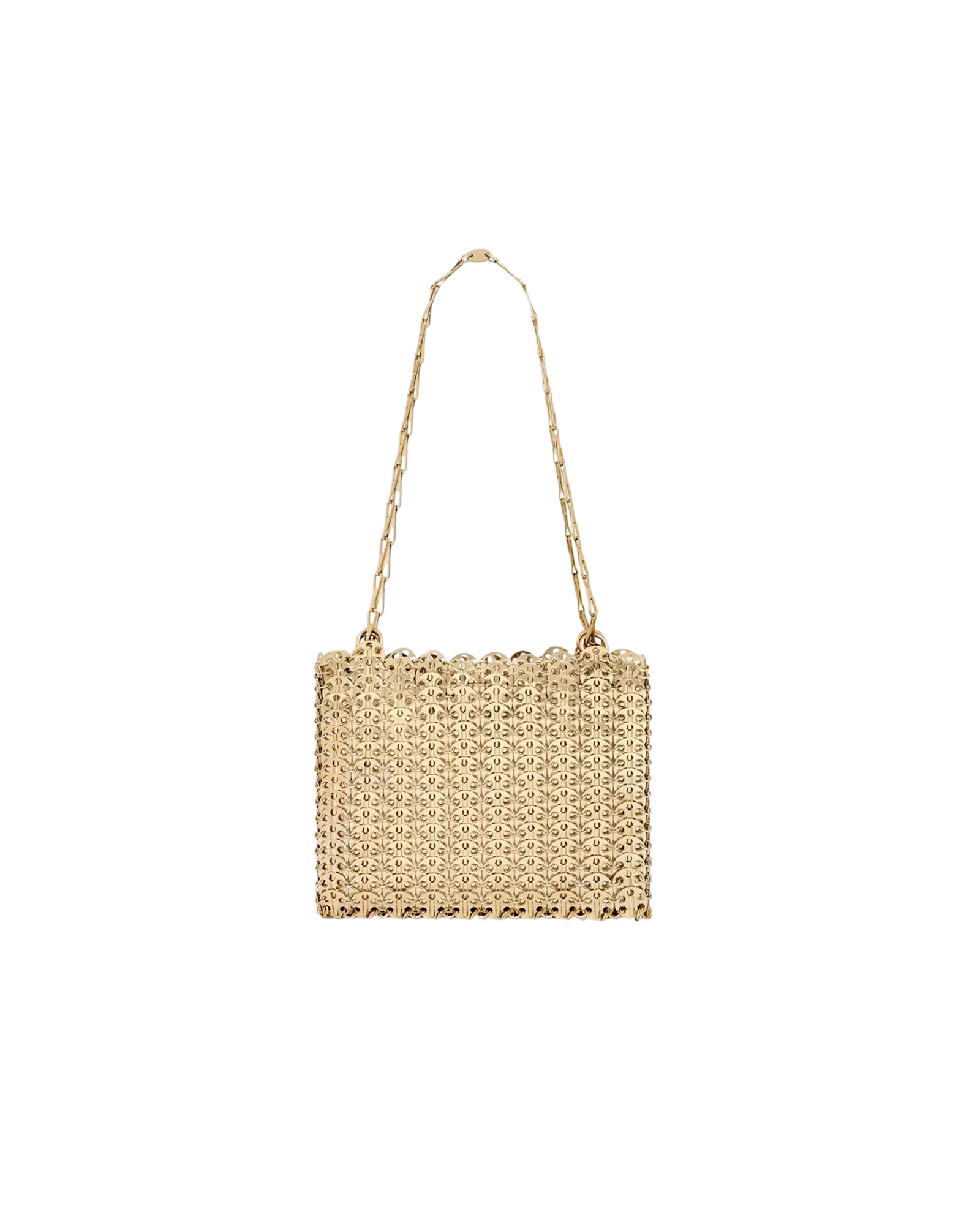 A handcrafted chain mail-style shoulder bag in gold-tone brass. It features sliding chain-link shoulder straps, logo hardware, and is a unique fabrication of 367 gold discs bonded by metal rings.