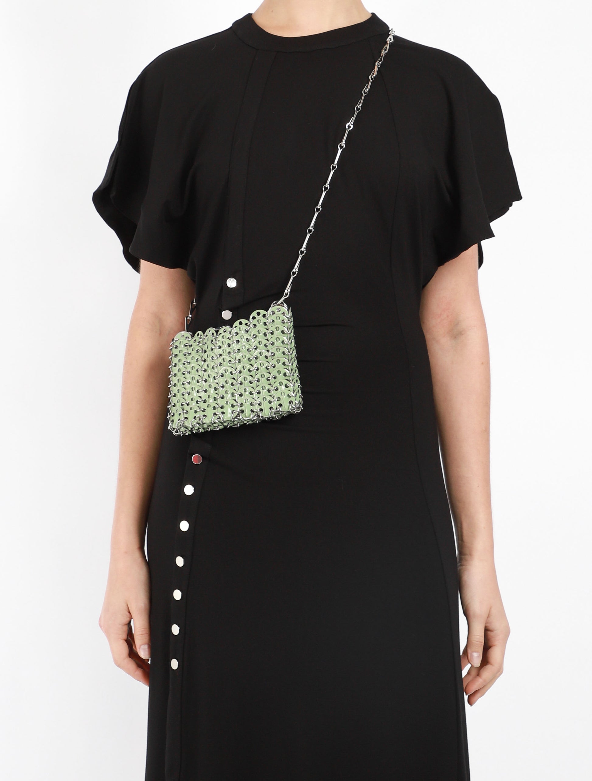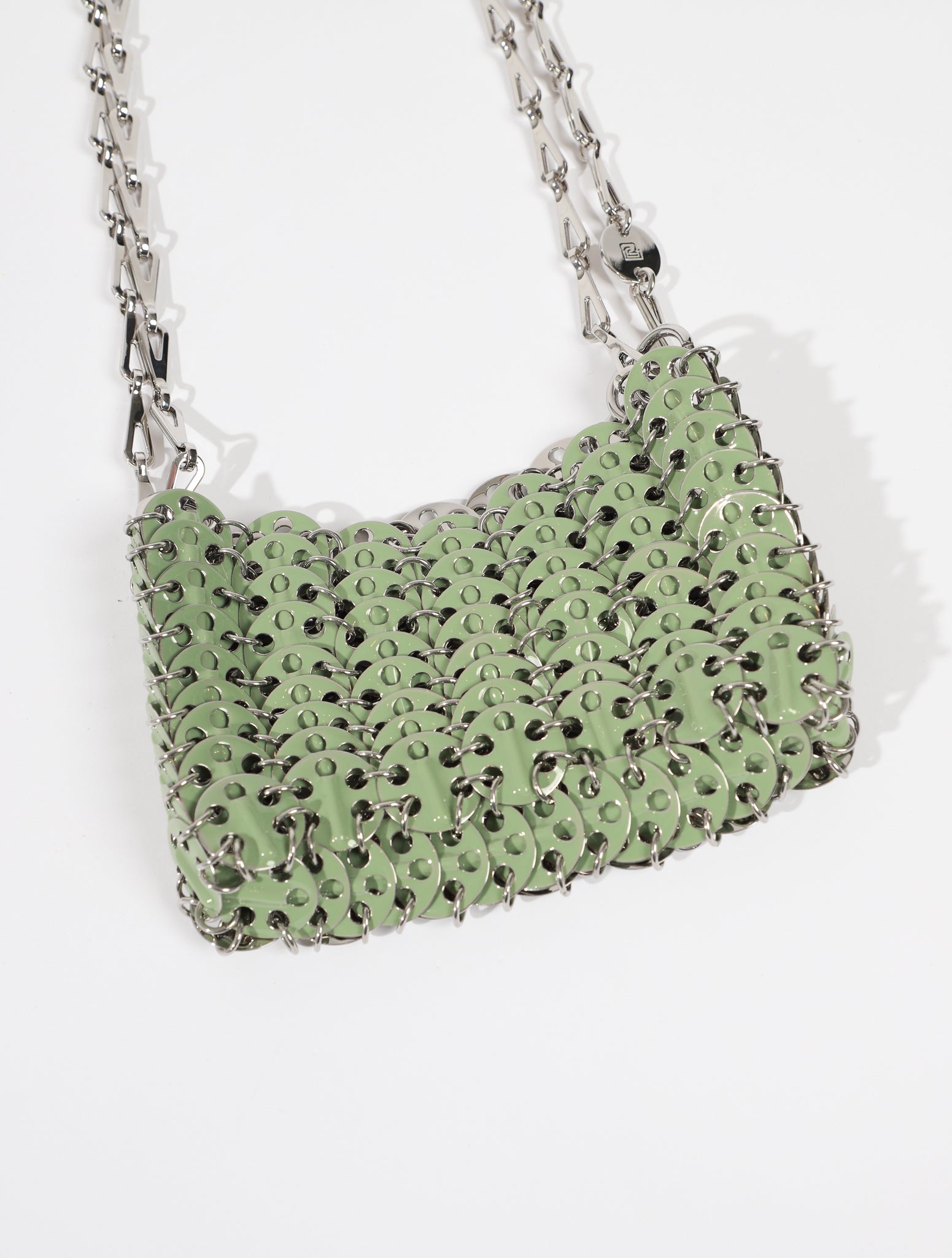 Classic nano sized shoulder bag from Rabanne, featuring the brand's signature gold-tone brass chainmail body and chain strap. Can be worn with full length single strap or shorter length double strap.