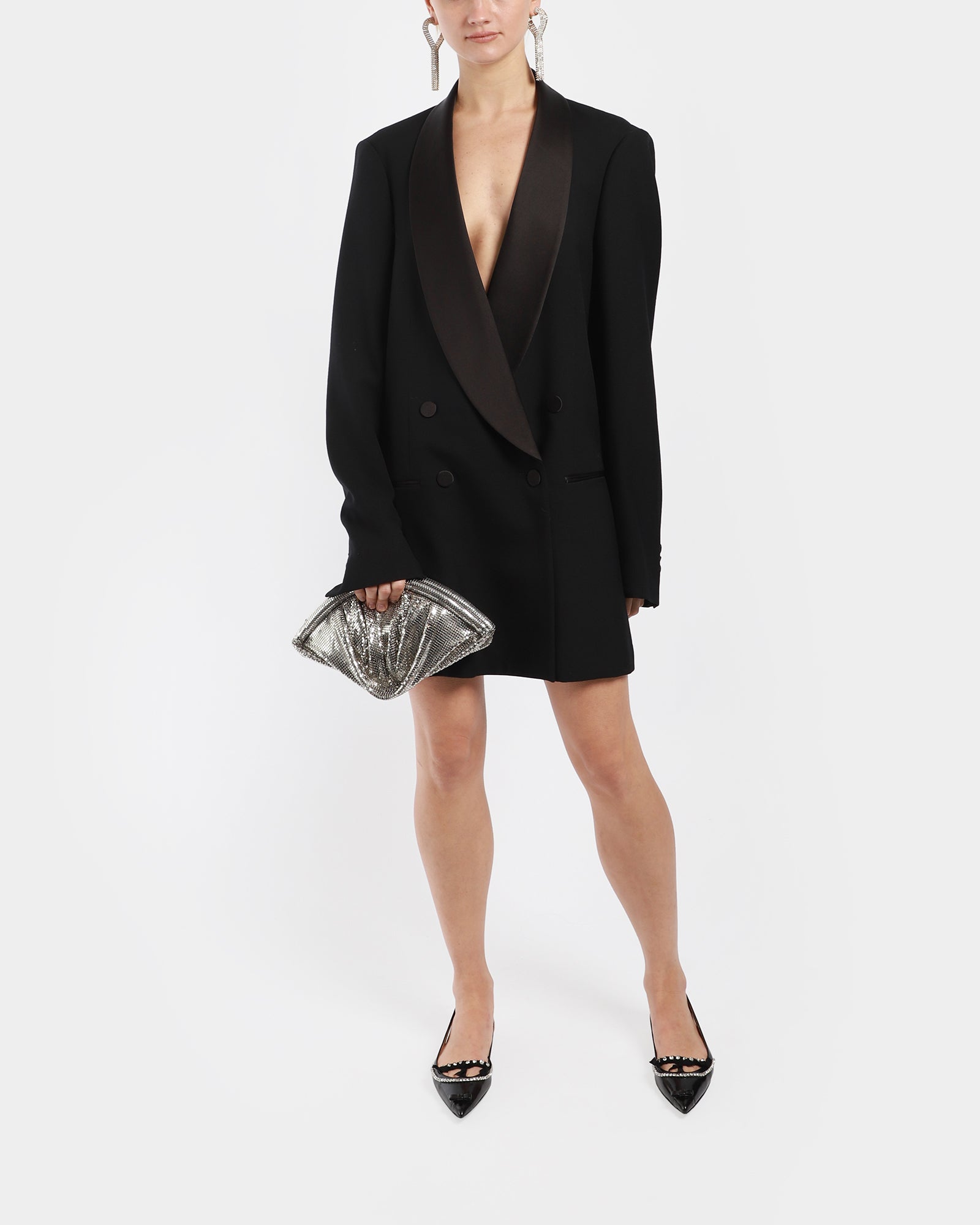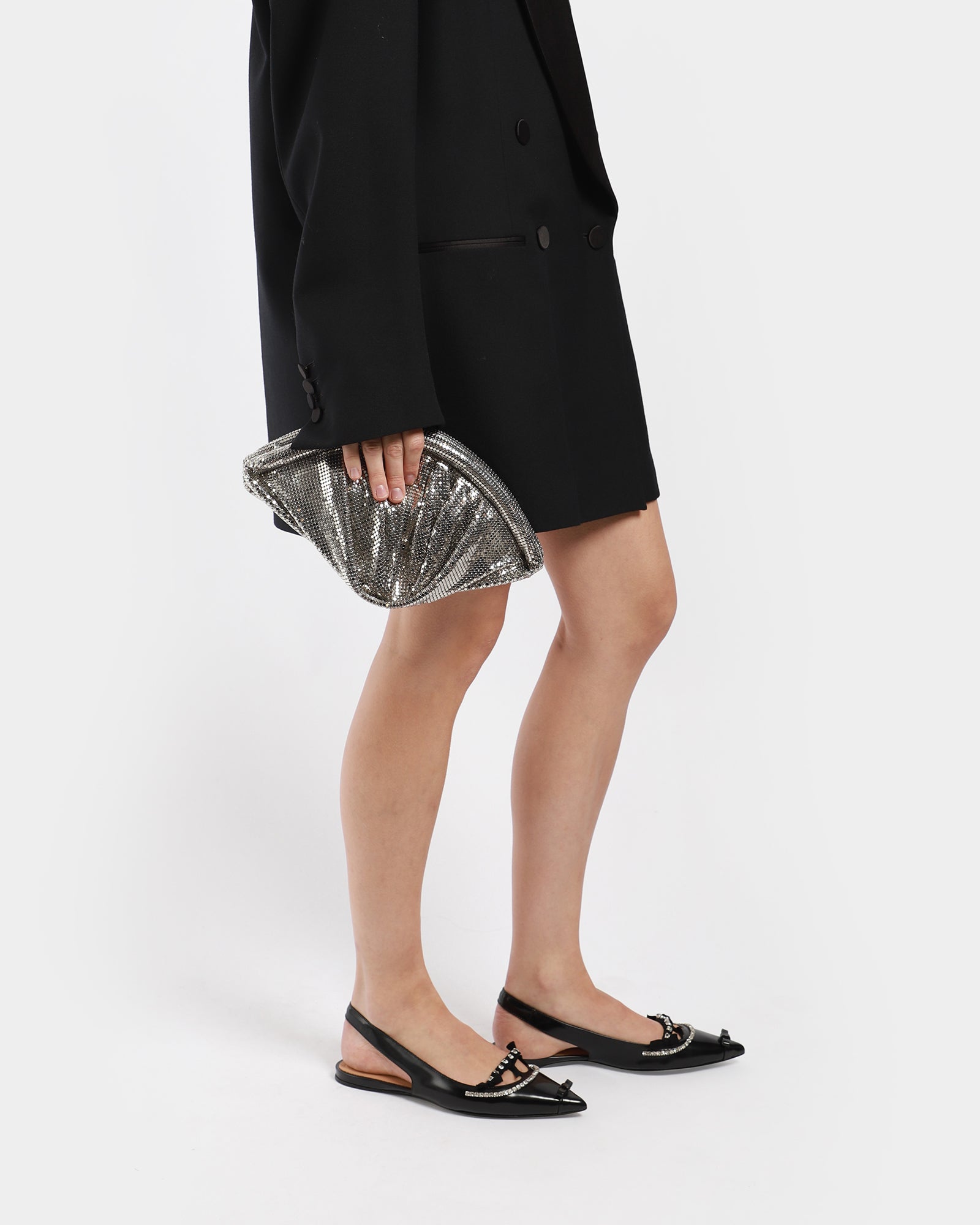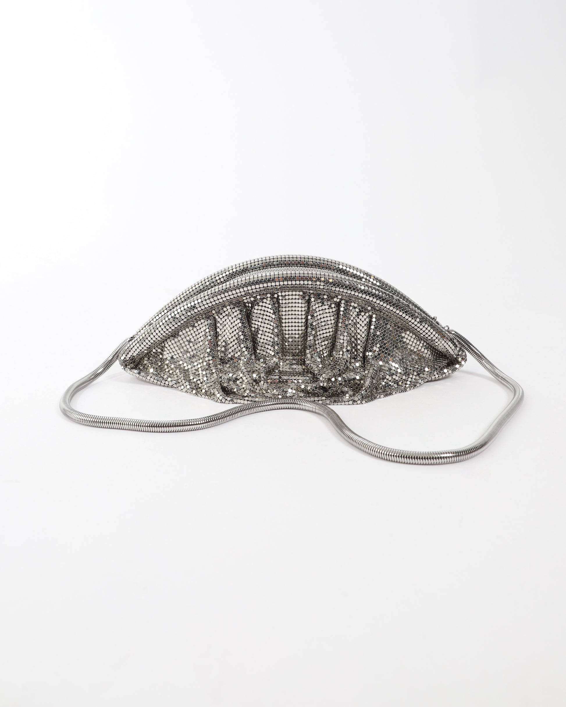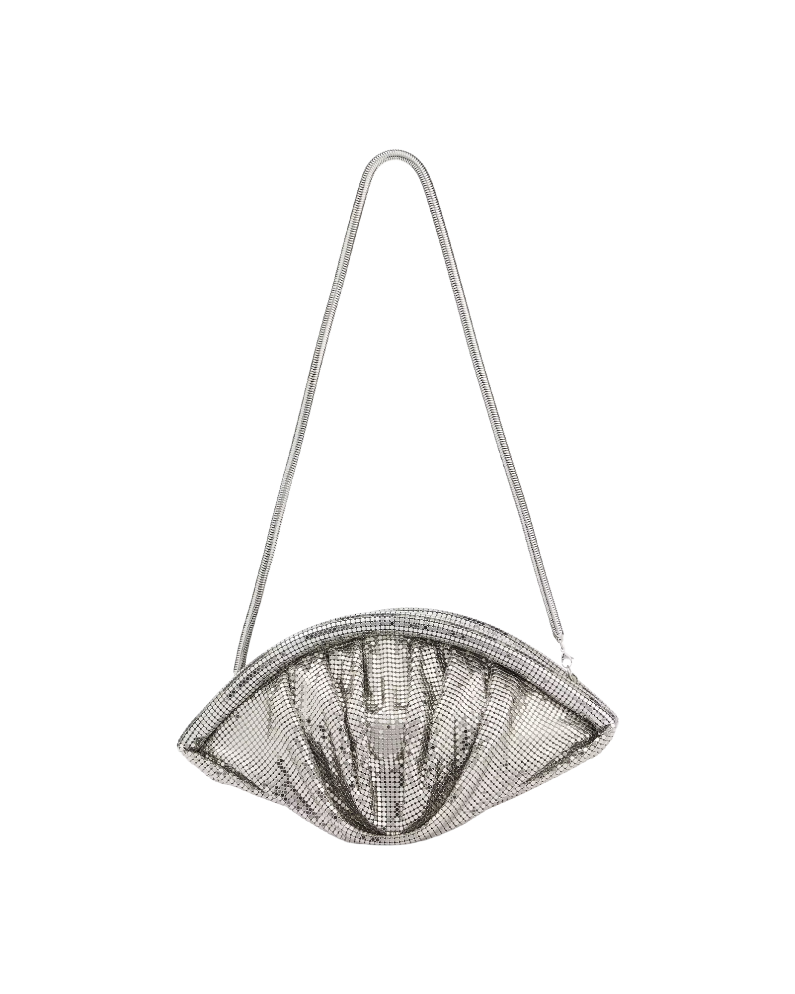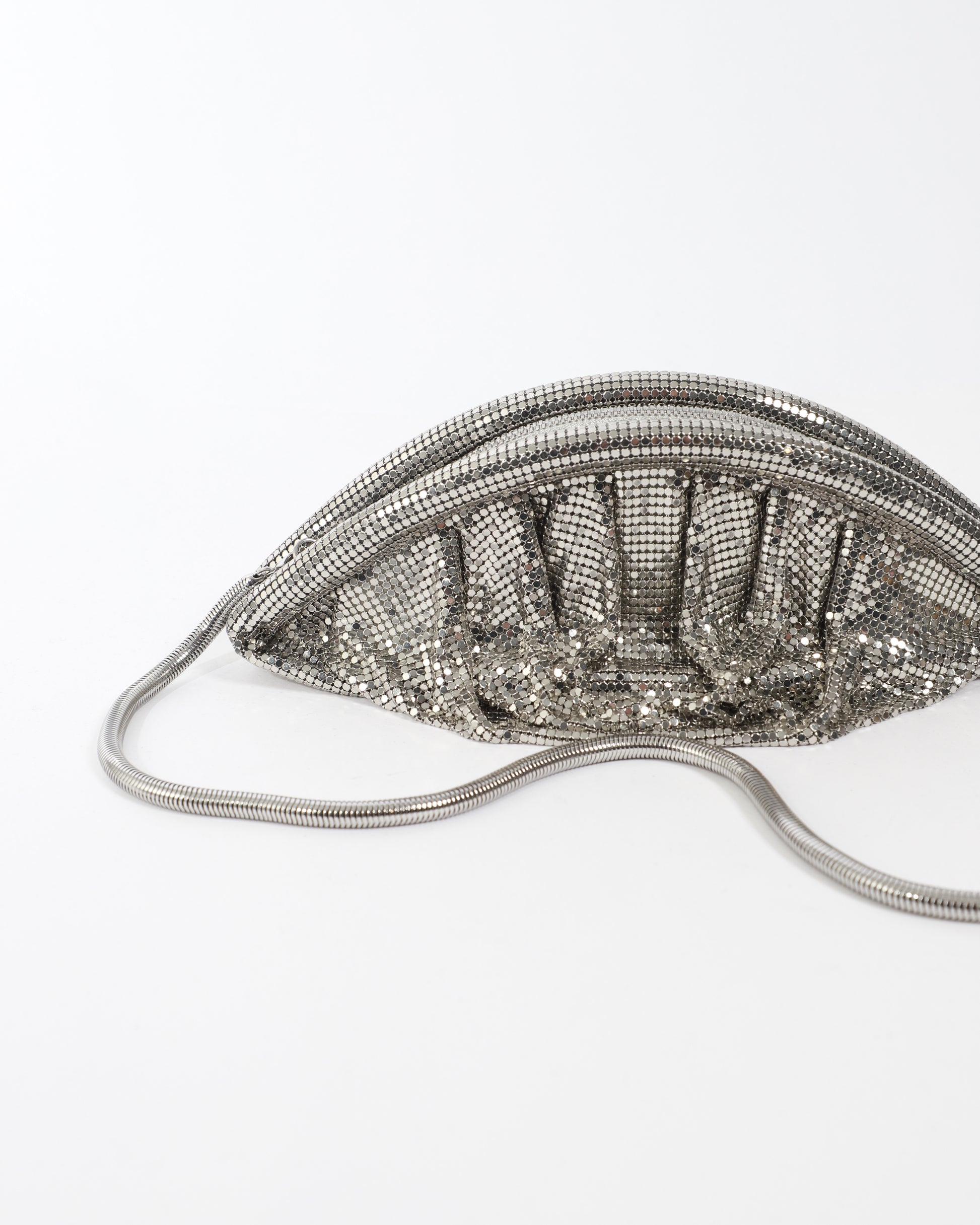 The Chainmail Clutch has an oval shape with a contrast leather lining inside. It has a detachable shoulder strap, therefore versatile, can be worn as clutch or shoulder bag.