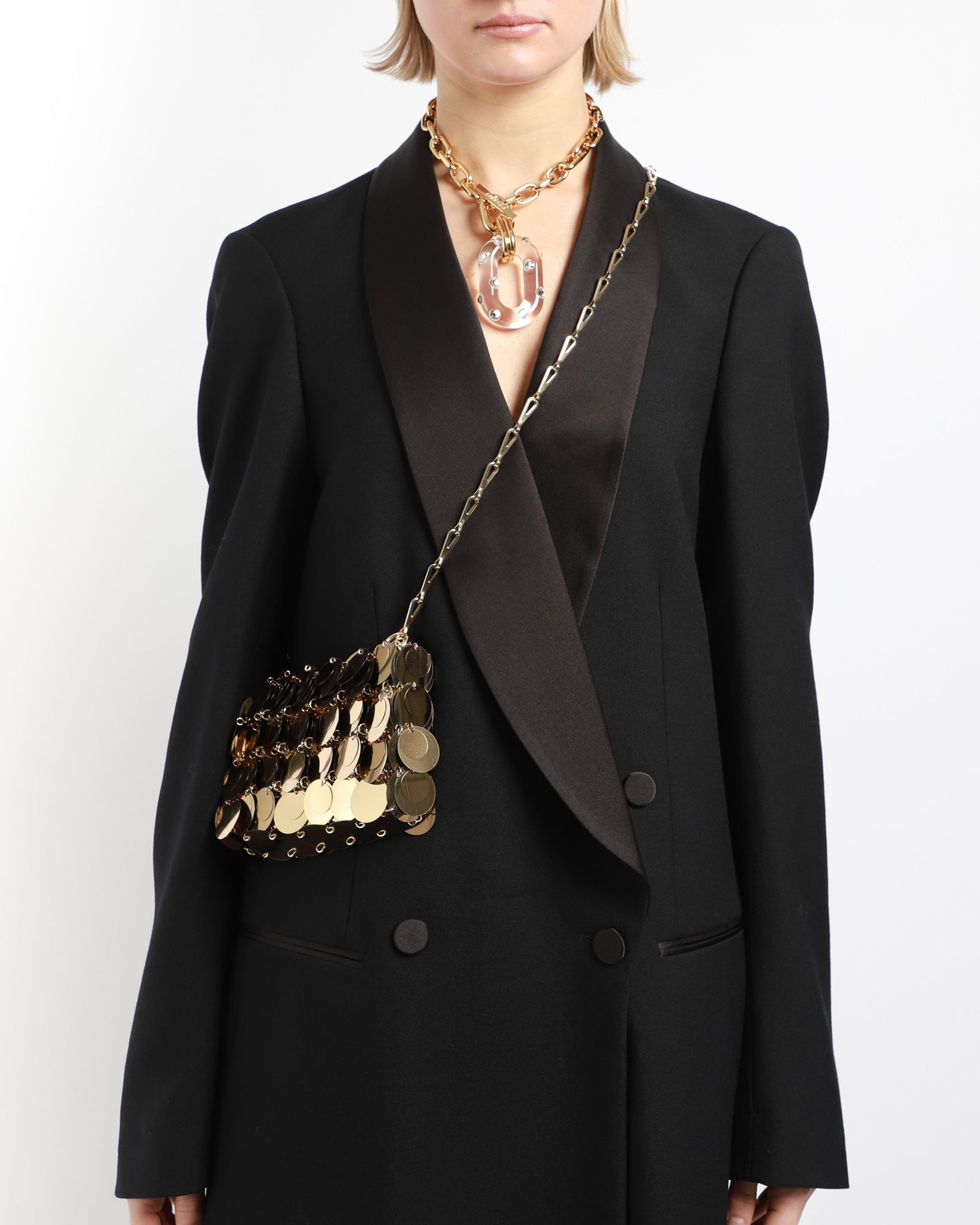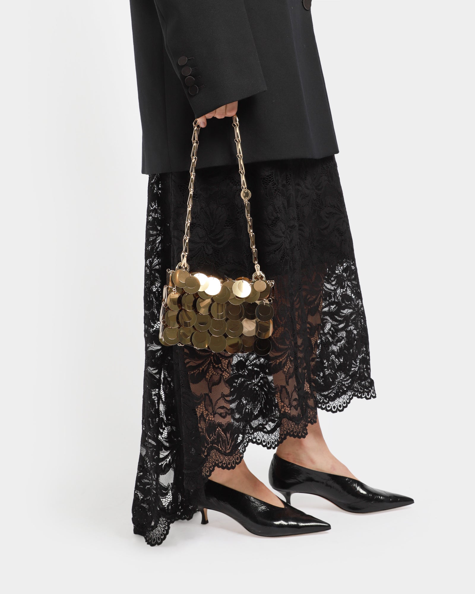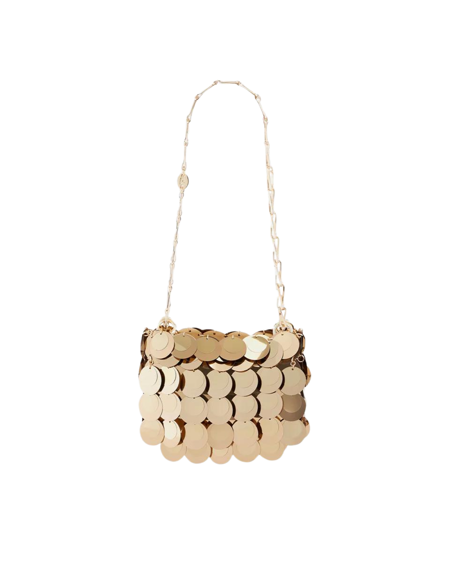 The Sparkle Nano Bag is assembled from gold sparkles discs, with a two-way gold-plated shoulder strap.