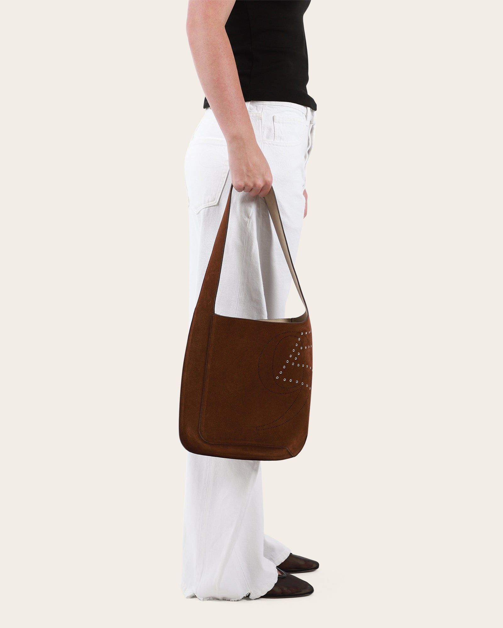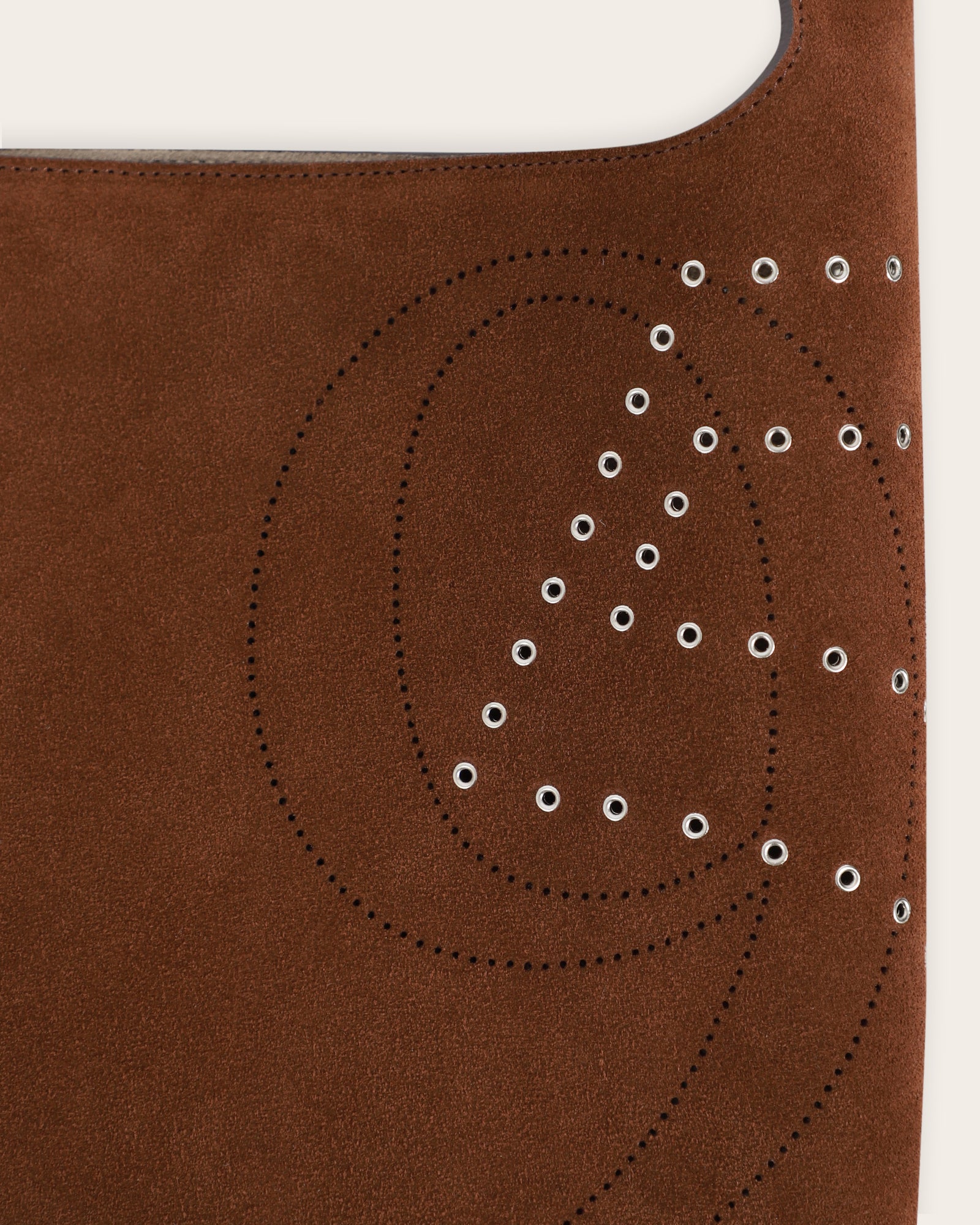 • A unique shoulder bag, featuring a suede leather finish, hand perforated graphics, eyelets studs, bonded suede lining, unfastened opening. Hand made in the UK.