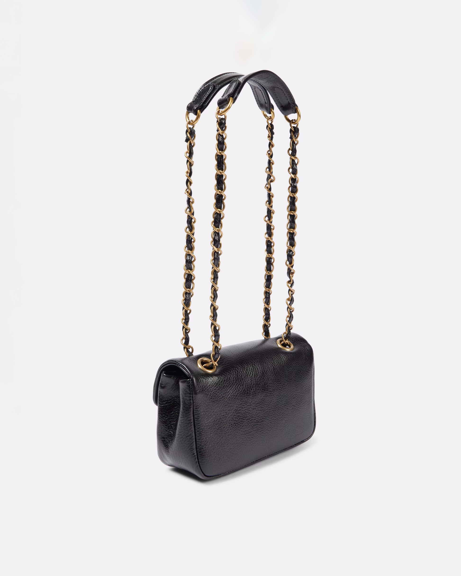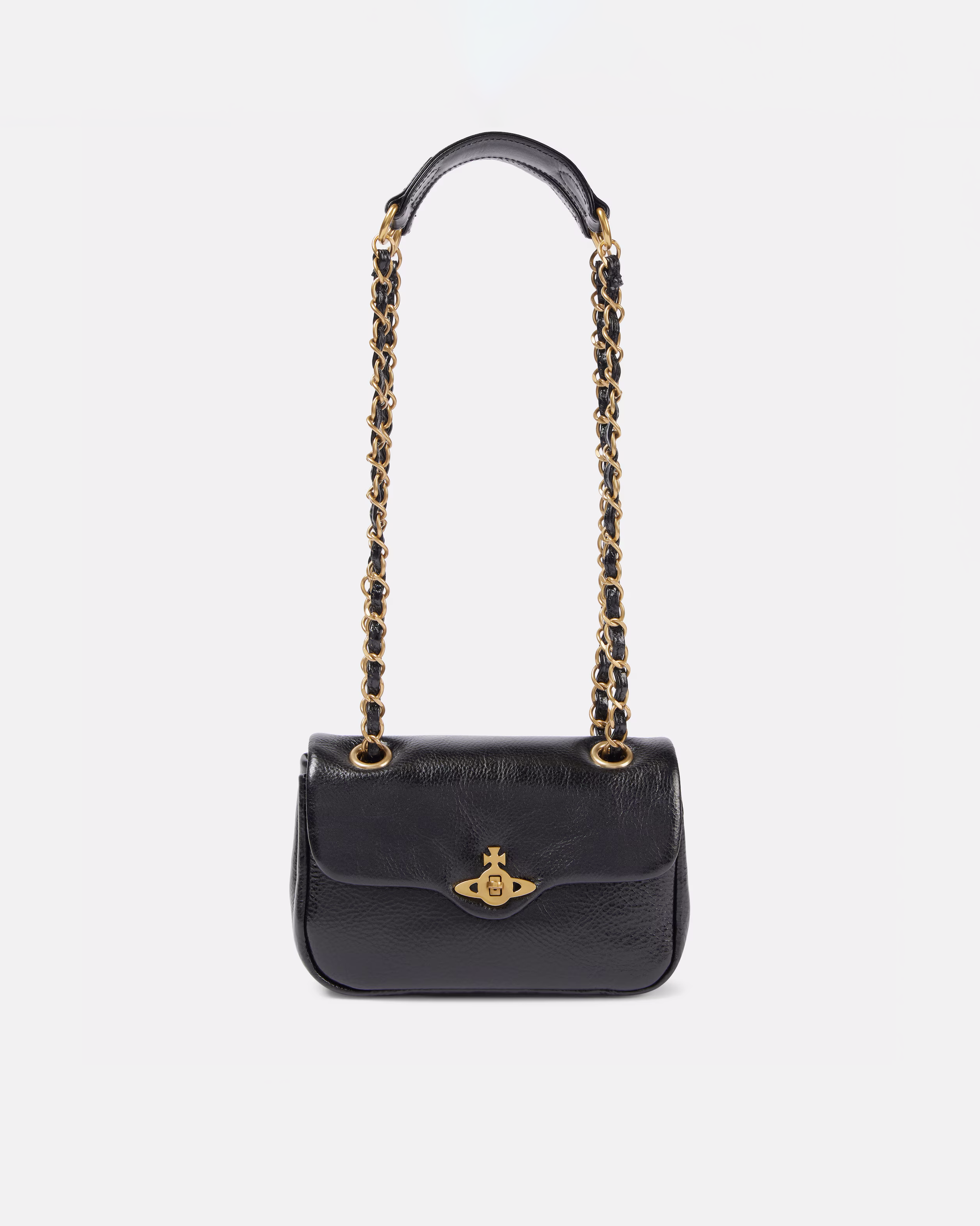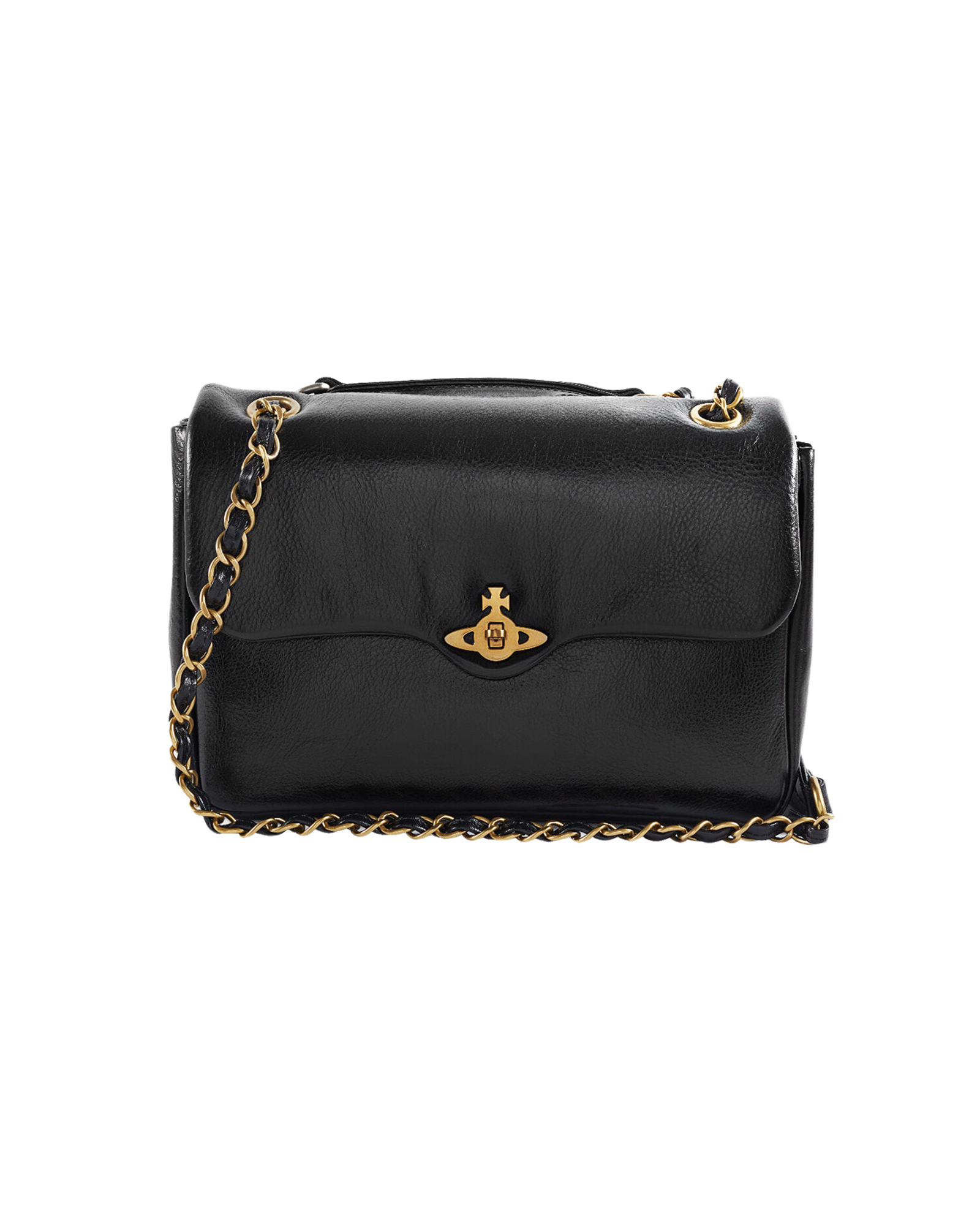 The Anita Chain Shoulder bag features a polished leather design, enhanced with the brands baby orb lock at the front flap, complete with a gold-tone brass finish. The bag can be worn over the shoulder, or crossbody.