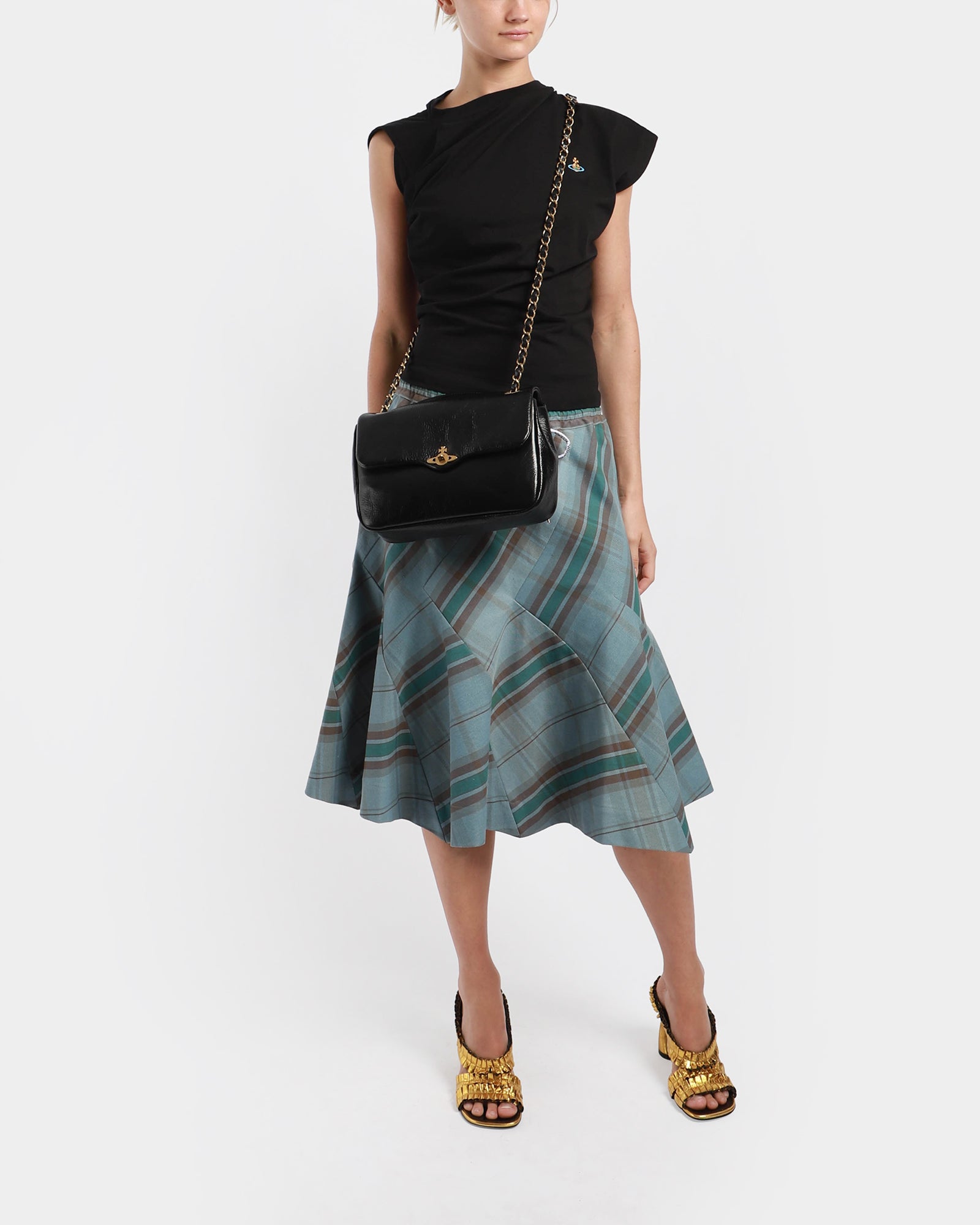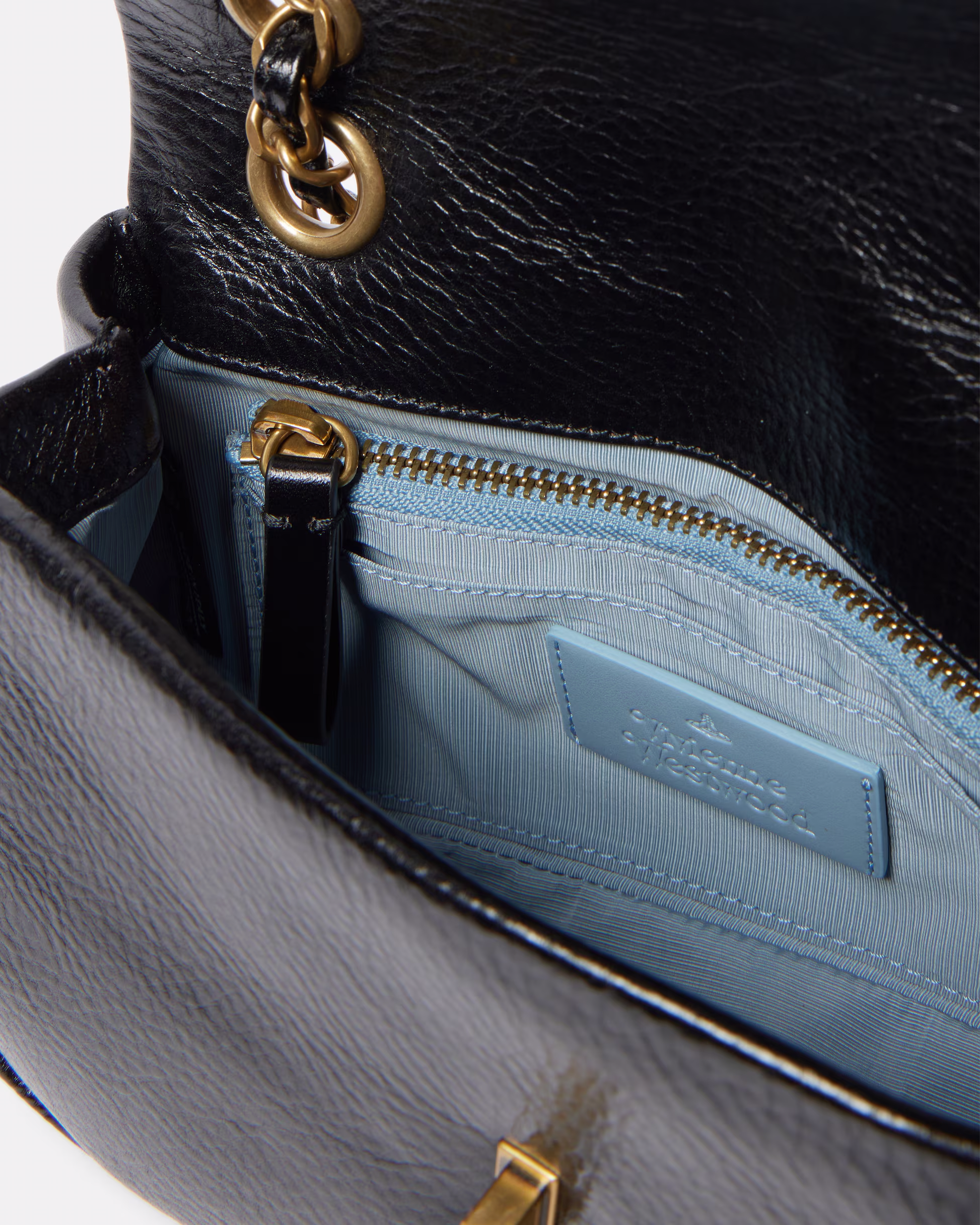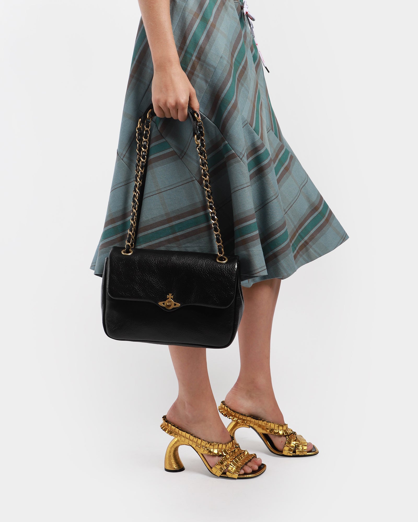 The Anita Chain Shoulder bag features a polished leather design, enhanced with the brands baby orb lock at the front flap, complete with a gold-tone brass finish. The bag can be worn over the shoulder, or crossbody.