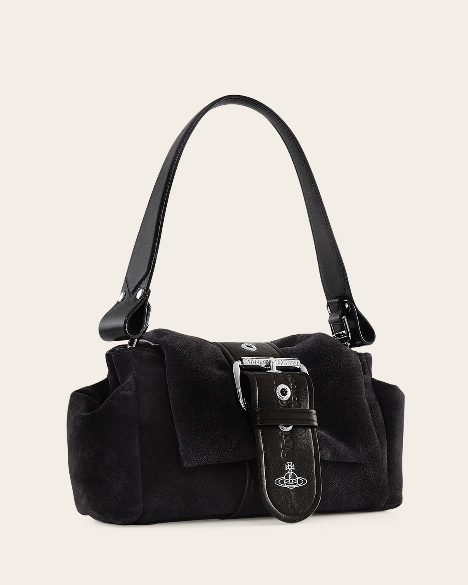 The Hazel Treasure handbag is reimagined in supple suede leather, featuring the house’s iconic archival punk pockets on each side. A sculptural belt strap wraps around the softly structured silhouette, subtly embossed with the signature Orb motif for a distinctive finish.