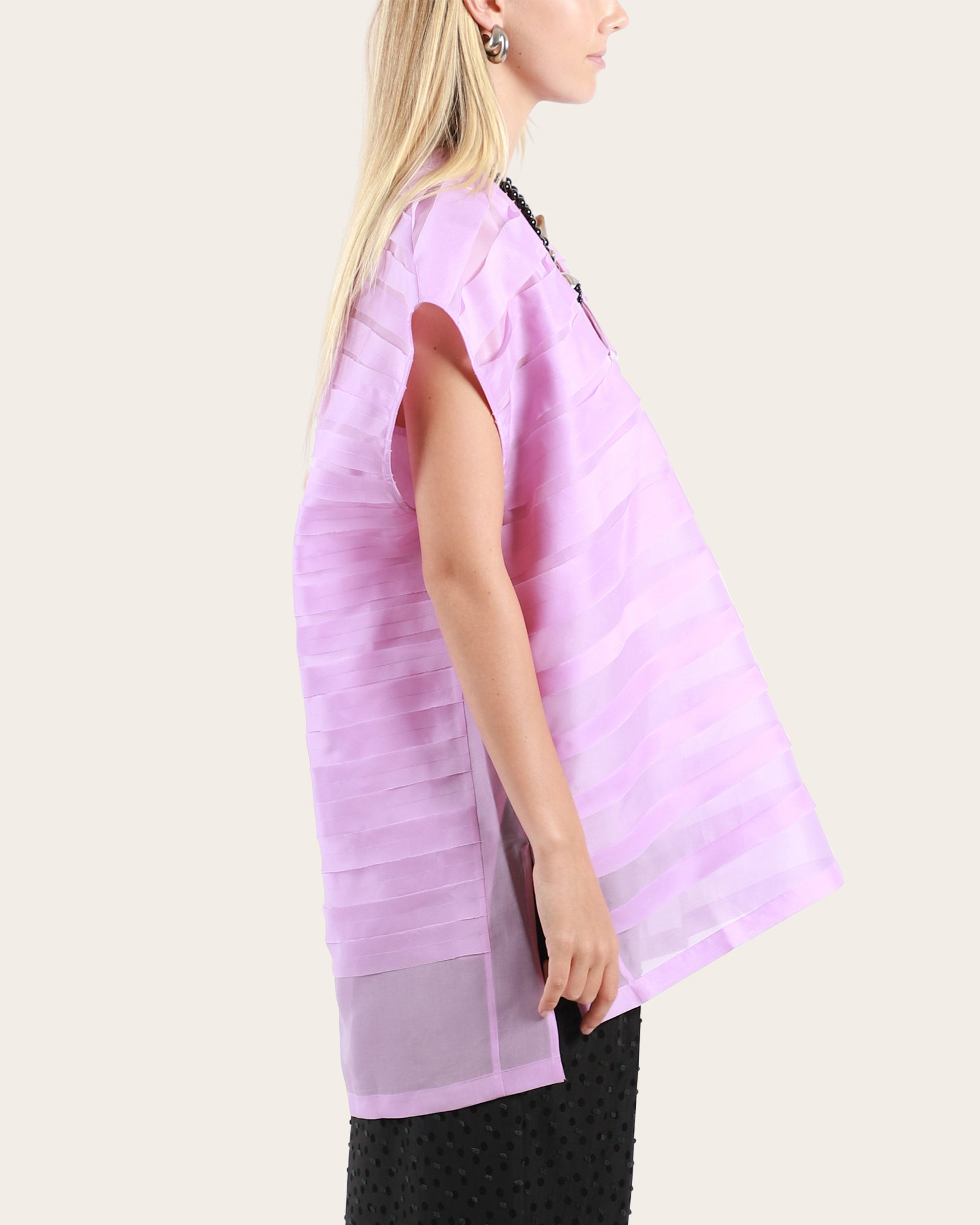 The Tiruso Blouse from silk has a deep V-neck with a handmade cut technique that features frayed edges. Sleeveless design and fully lined.
