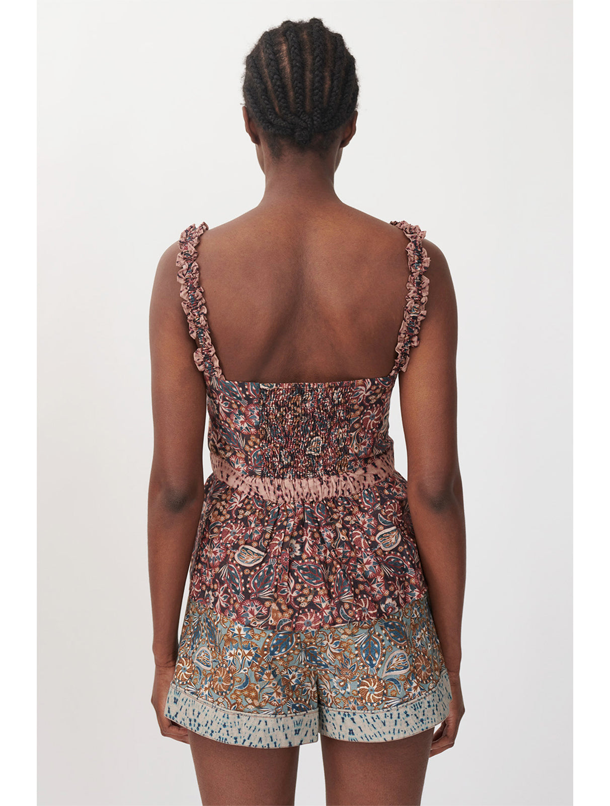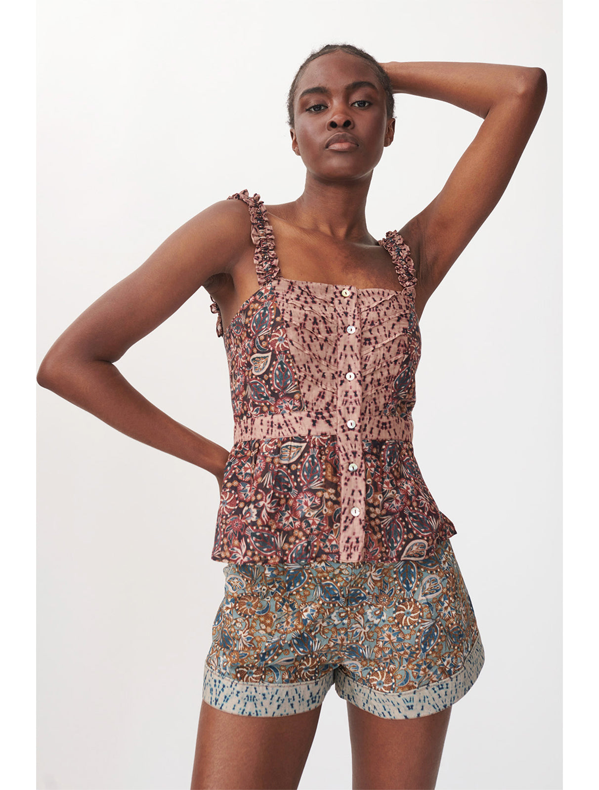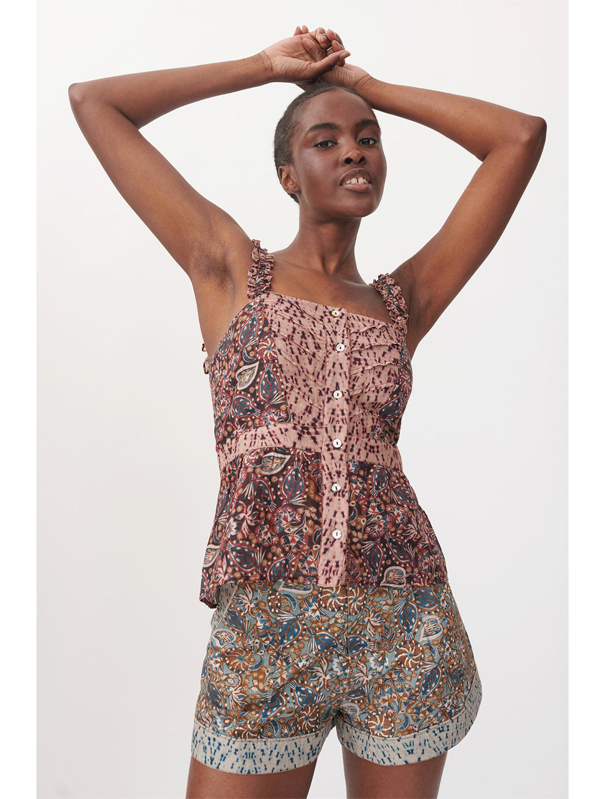 Mini length shorts from Chufy, featuring organic cotton poplin print fabric with contrast print trim, tailored fit, designed to sit high on the waist, pleated front waist for added volume, side pockets, concealed zip and flat hook front to close. Comes with optional matching fabric belt.