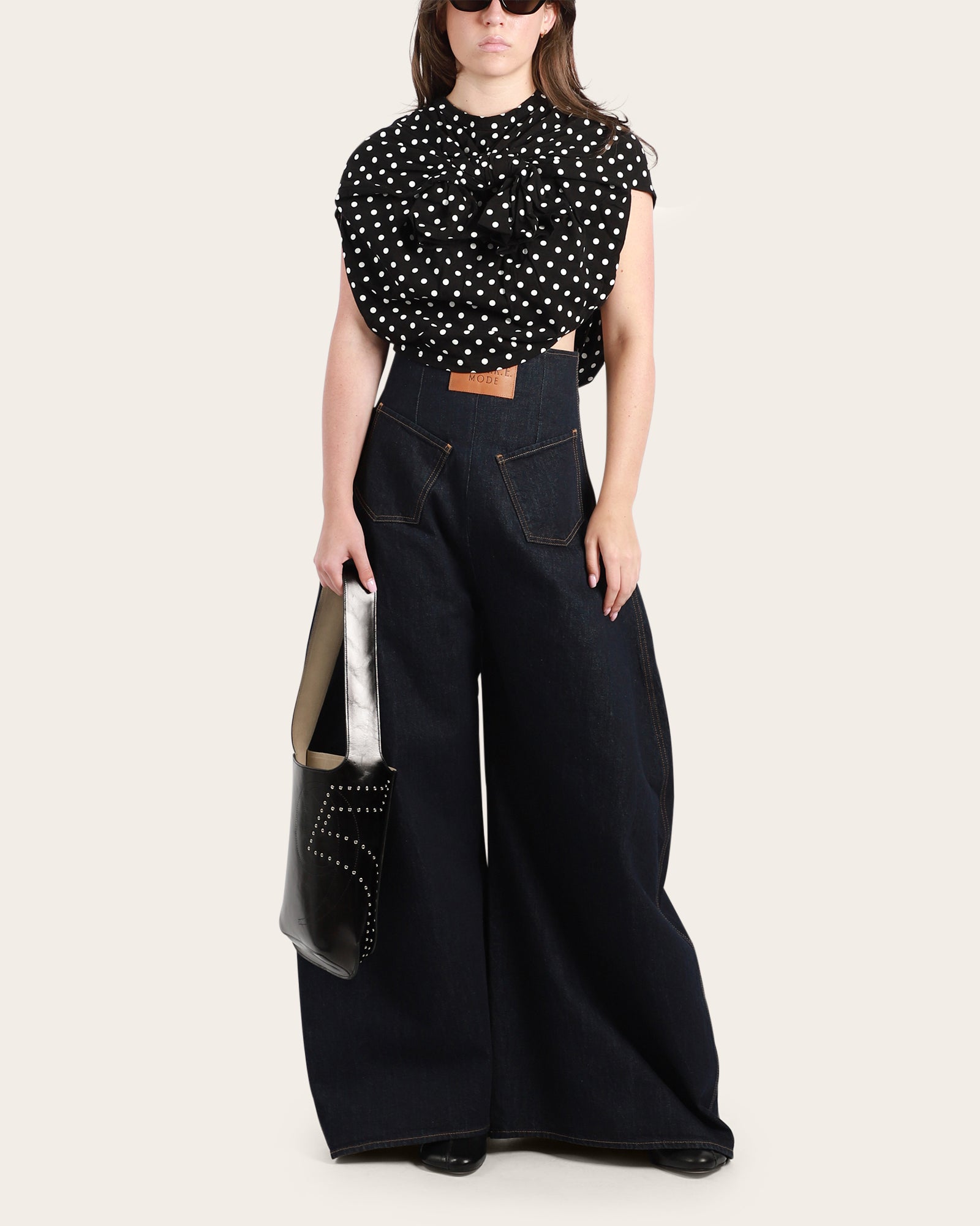 A sculptural statement top cut from fluid black fabric with crisp white polka dots. Designed with a high neckline and soft cap sleeves, it features an artful drape that gathers into an oversized bow detail at the chest, creating volume and movement through the bodice. The silhouette wraps and falls cleanly at the waist, making it ideal for pairing with high-rise denim or tailored separates. A refined yet playful piece that balances graphic impact with considered construction.