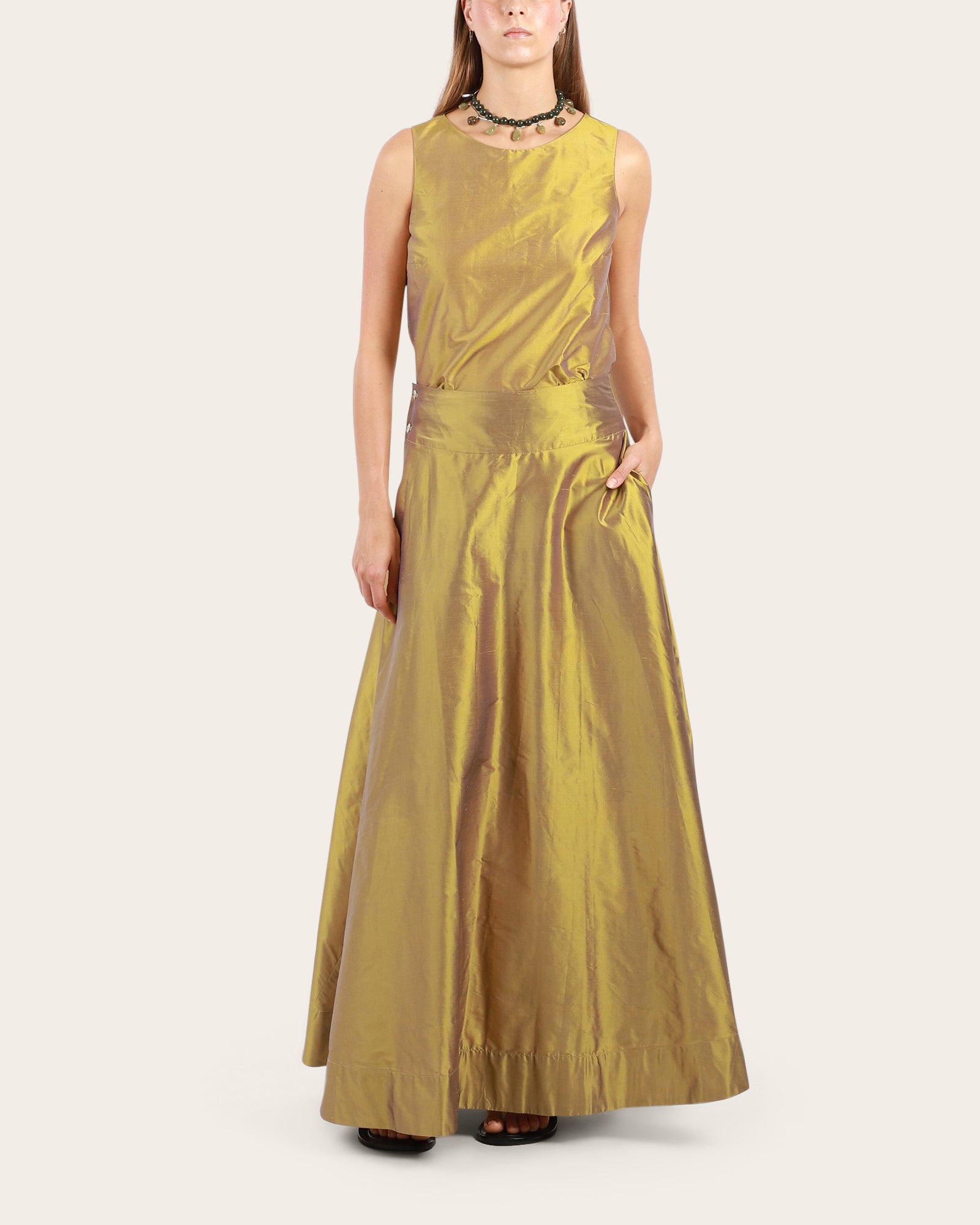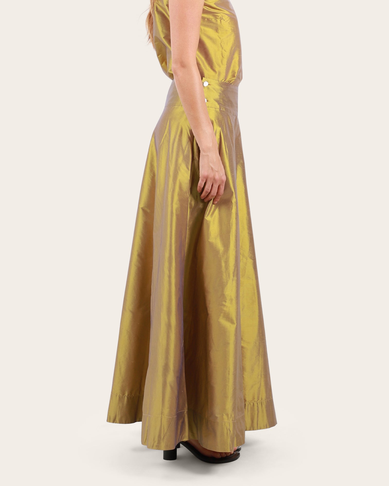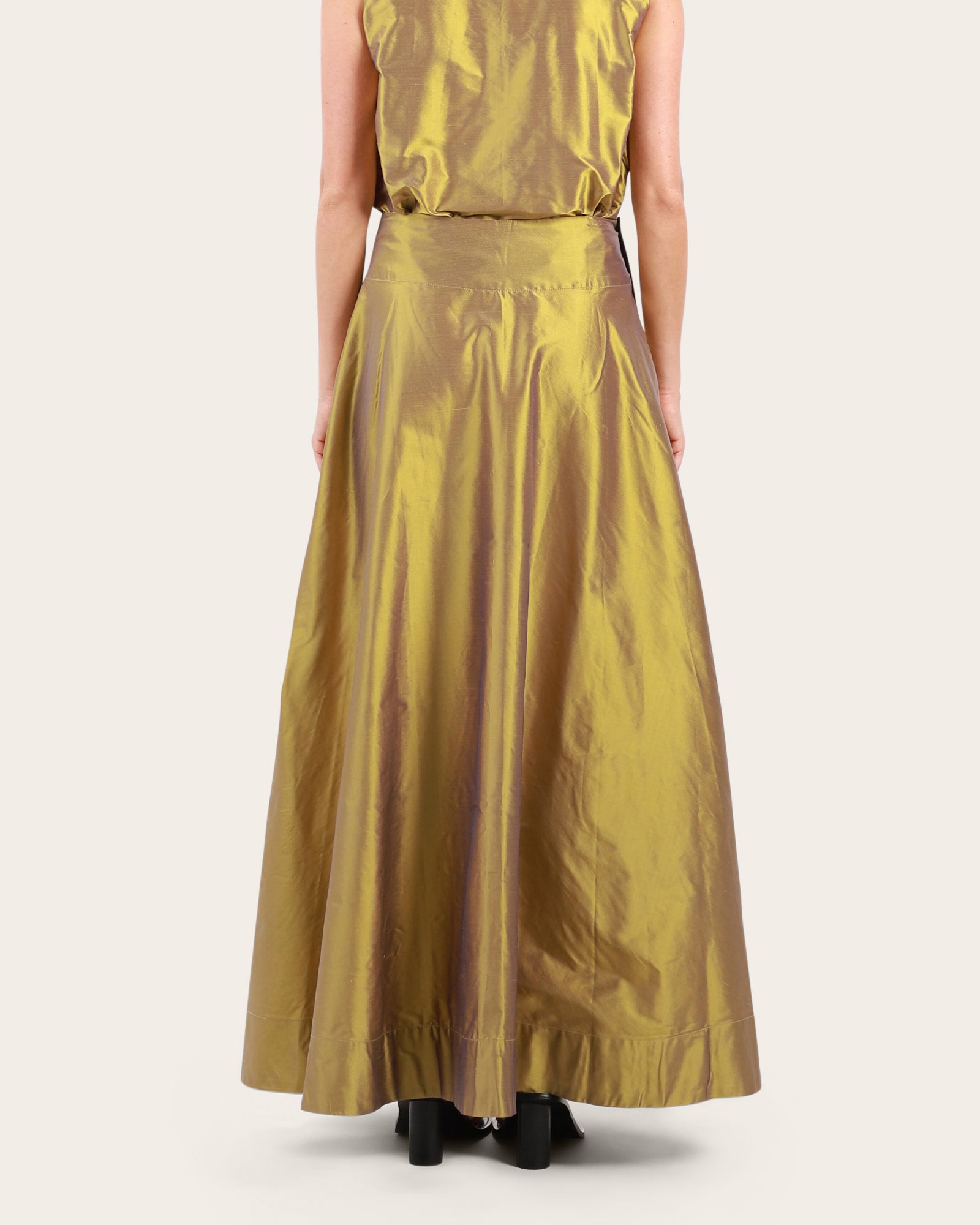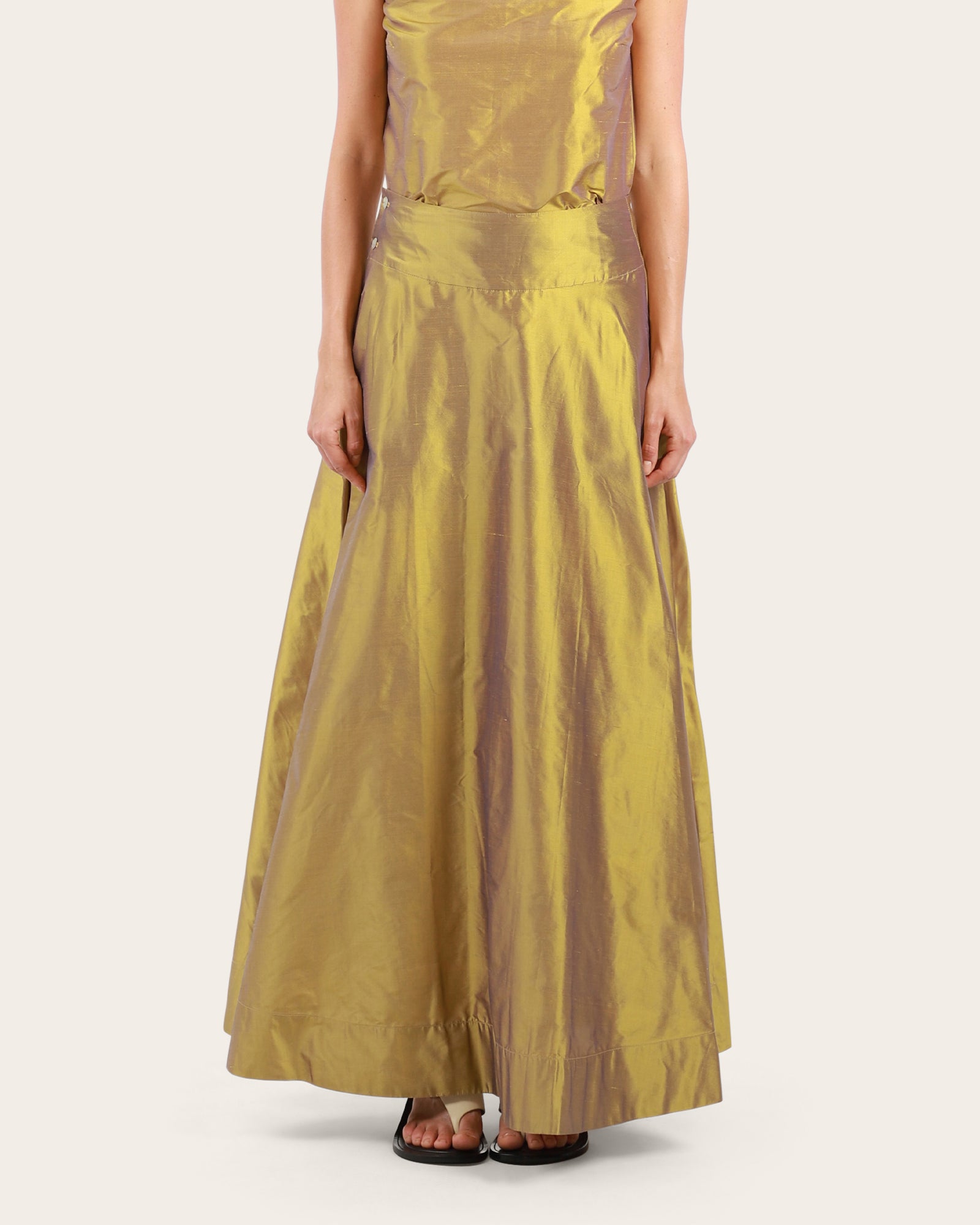 • Crafted from lustrous two-tone silk, this skirt shimmers with an iridescent, liquid-gold glow. The graceful quarter-circle silhouette nods to the timeless elegance of 1950s style. Made in Australia.