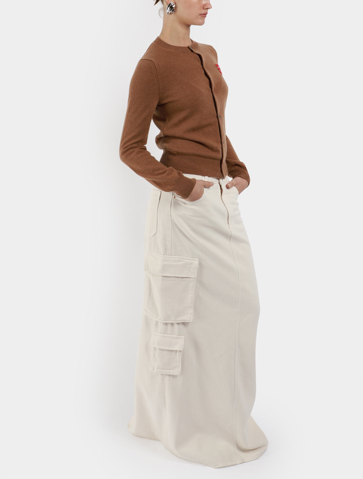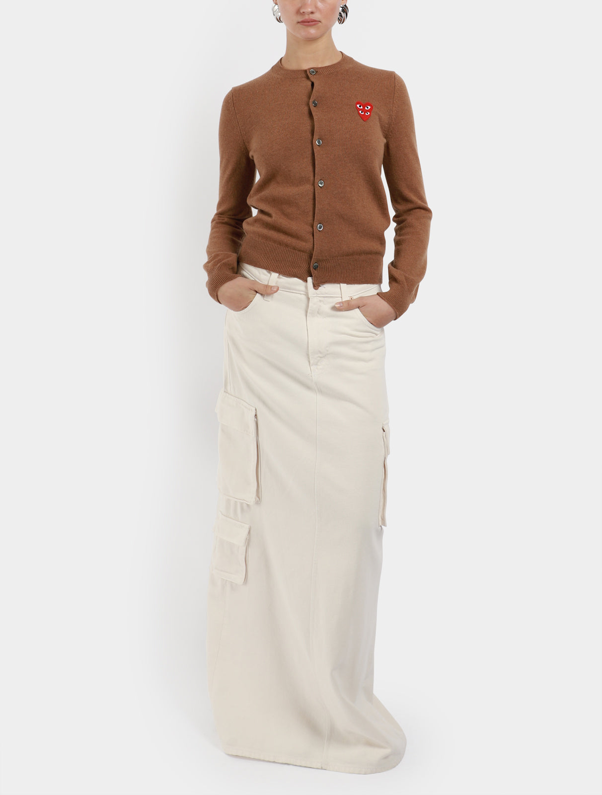 Knit wool cardigan from Comme des Garçons Play, featuring a round neck, long sleeves, button front fastenings, the brand’s iconic almond-eyed red heart doubled and embroidered on left sleeve and a ribbed neck, cuff and hem.