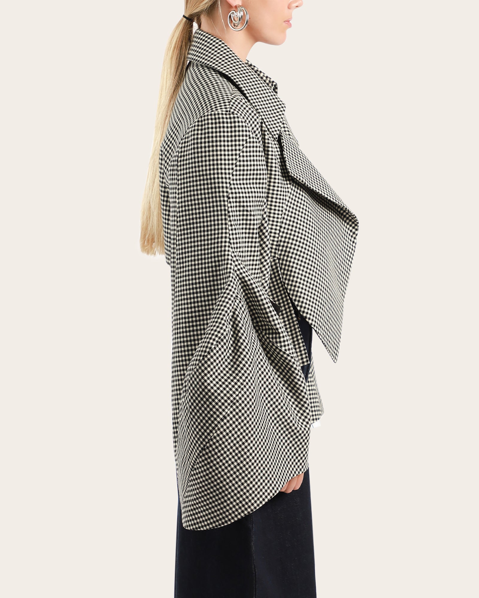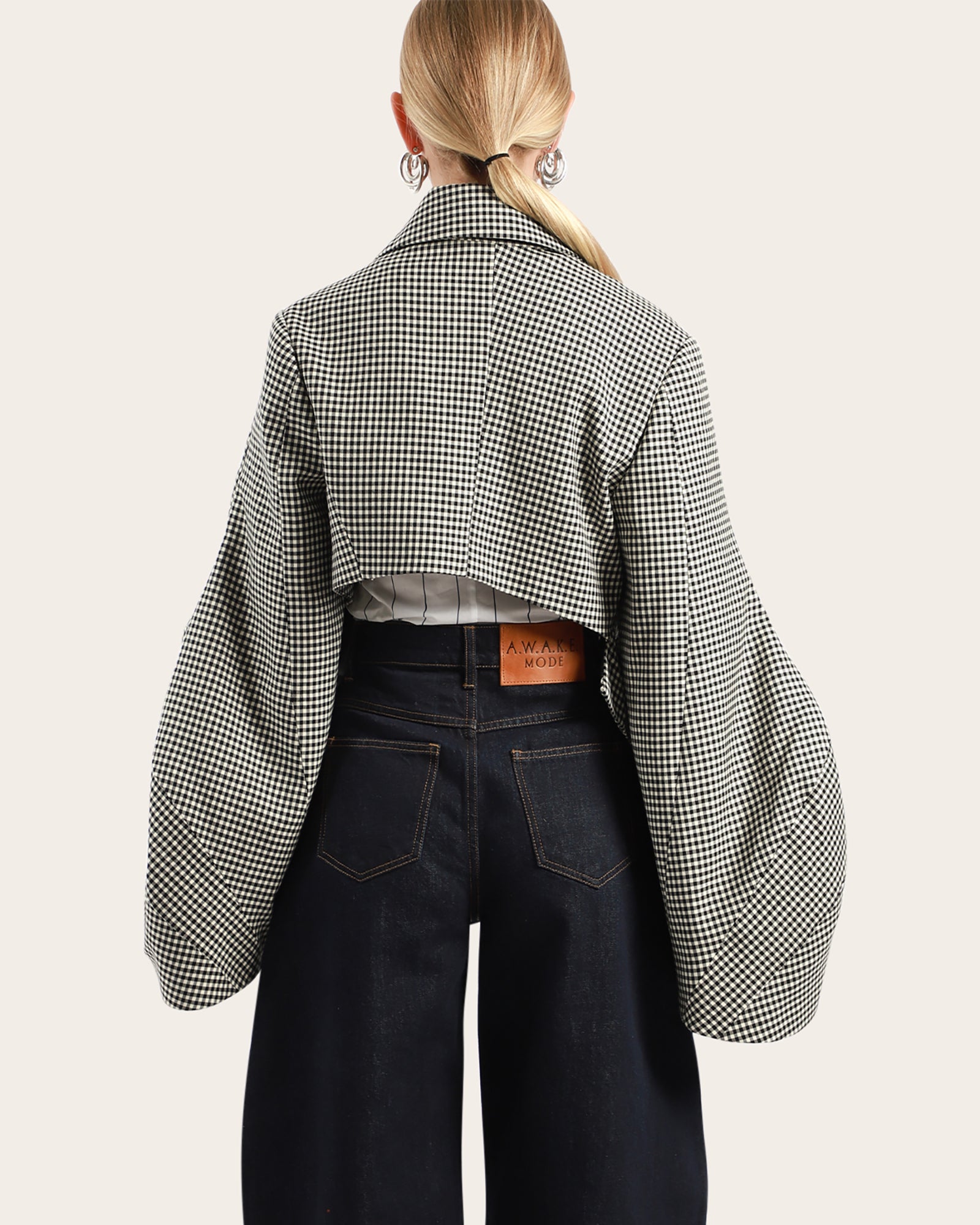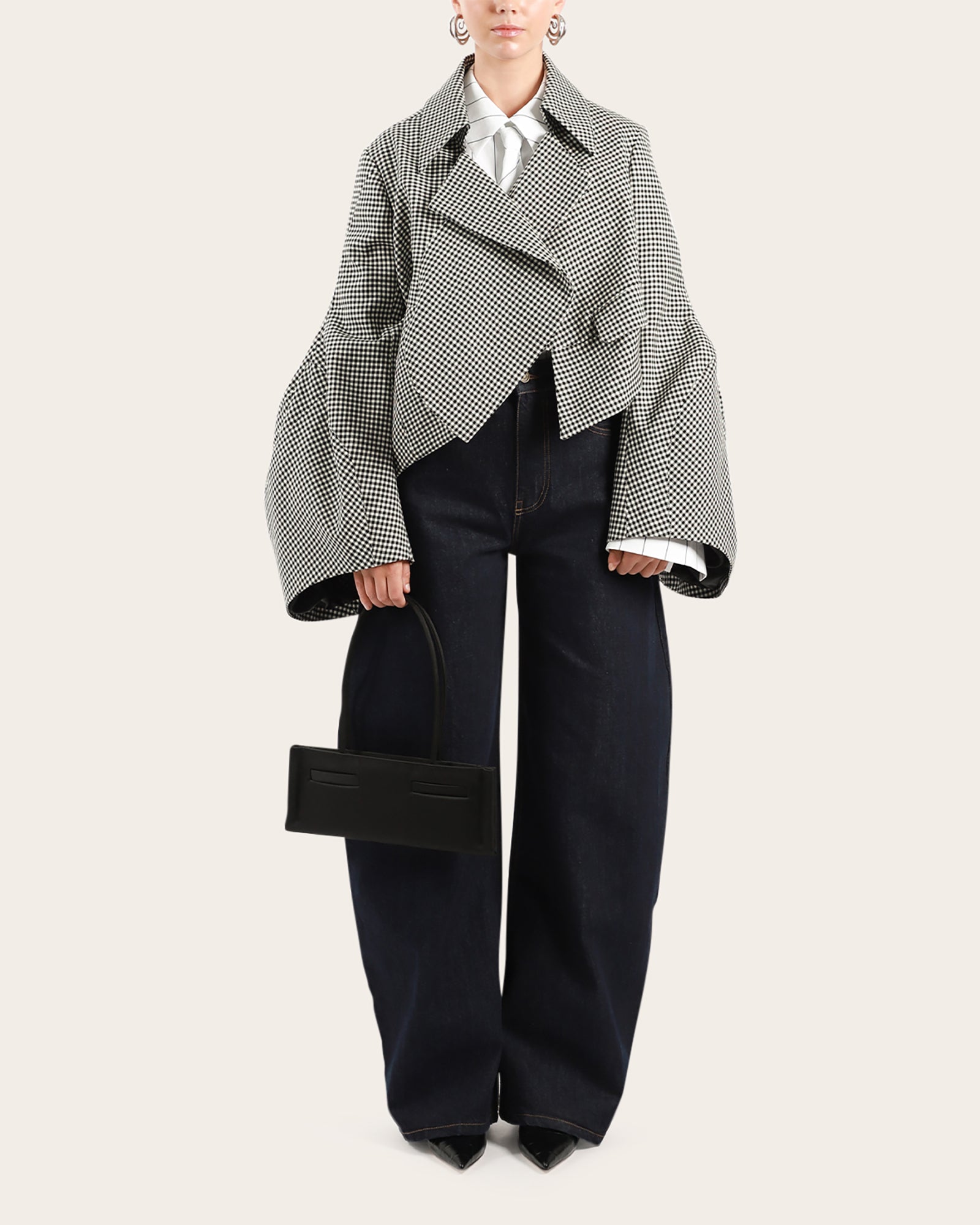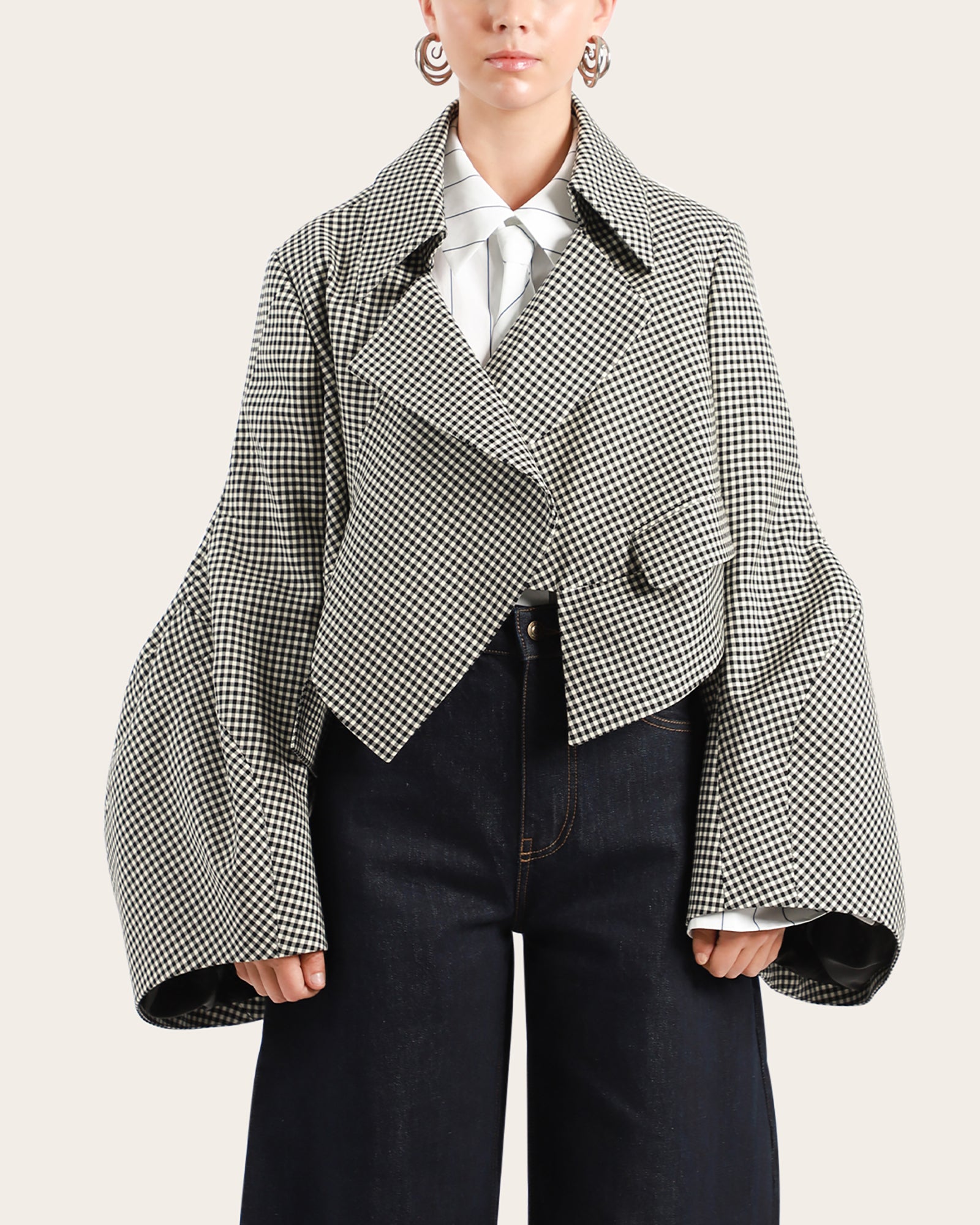 • A cropped jacket featuring notched lapels, long wide puff sleeves, asymmetrical hem, welt pockets and gingham check pattern all over. Perfect to pair with the 3d detail skirt from Comme des Garcons. Made in Japan.