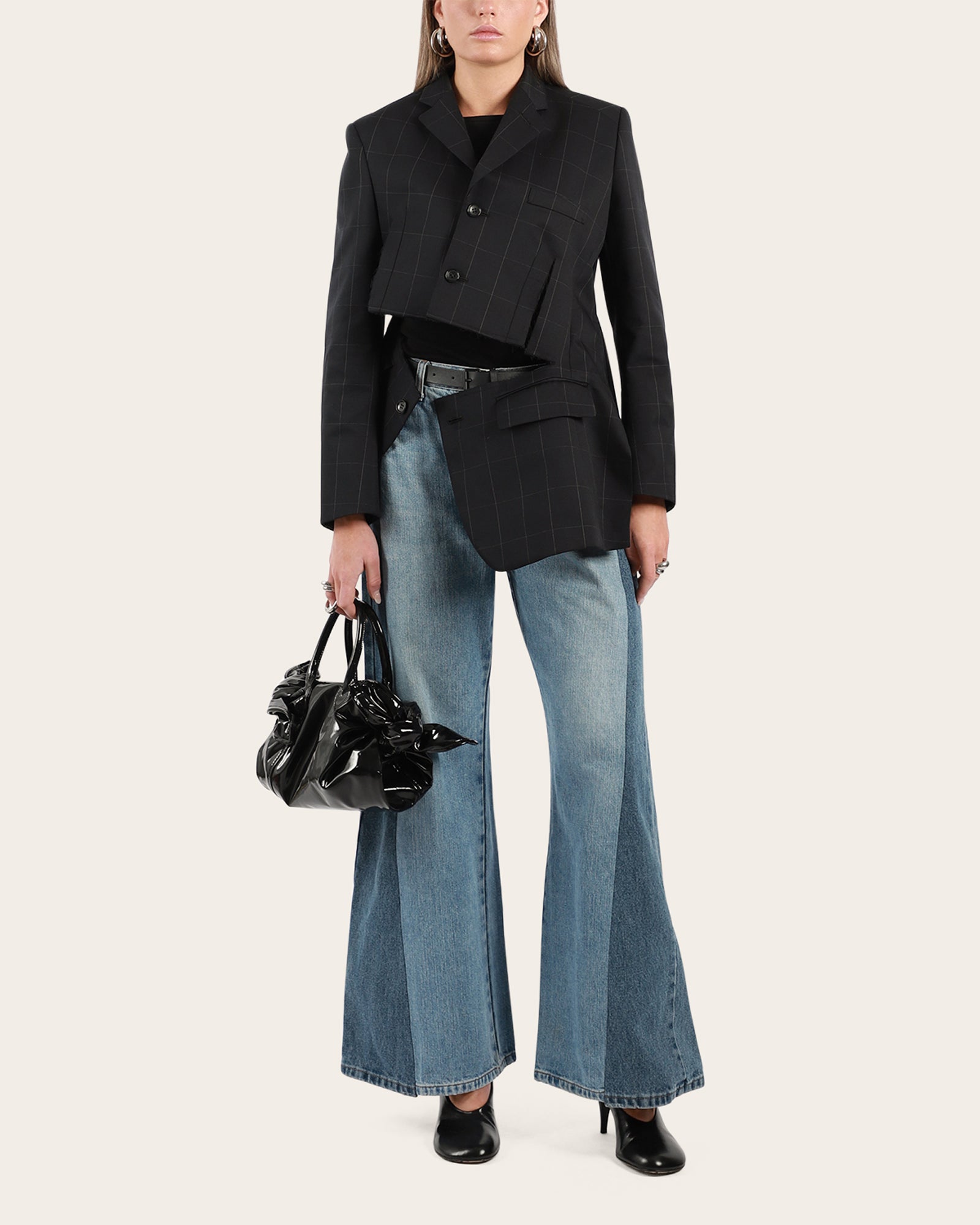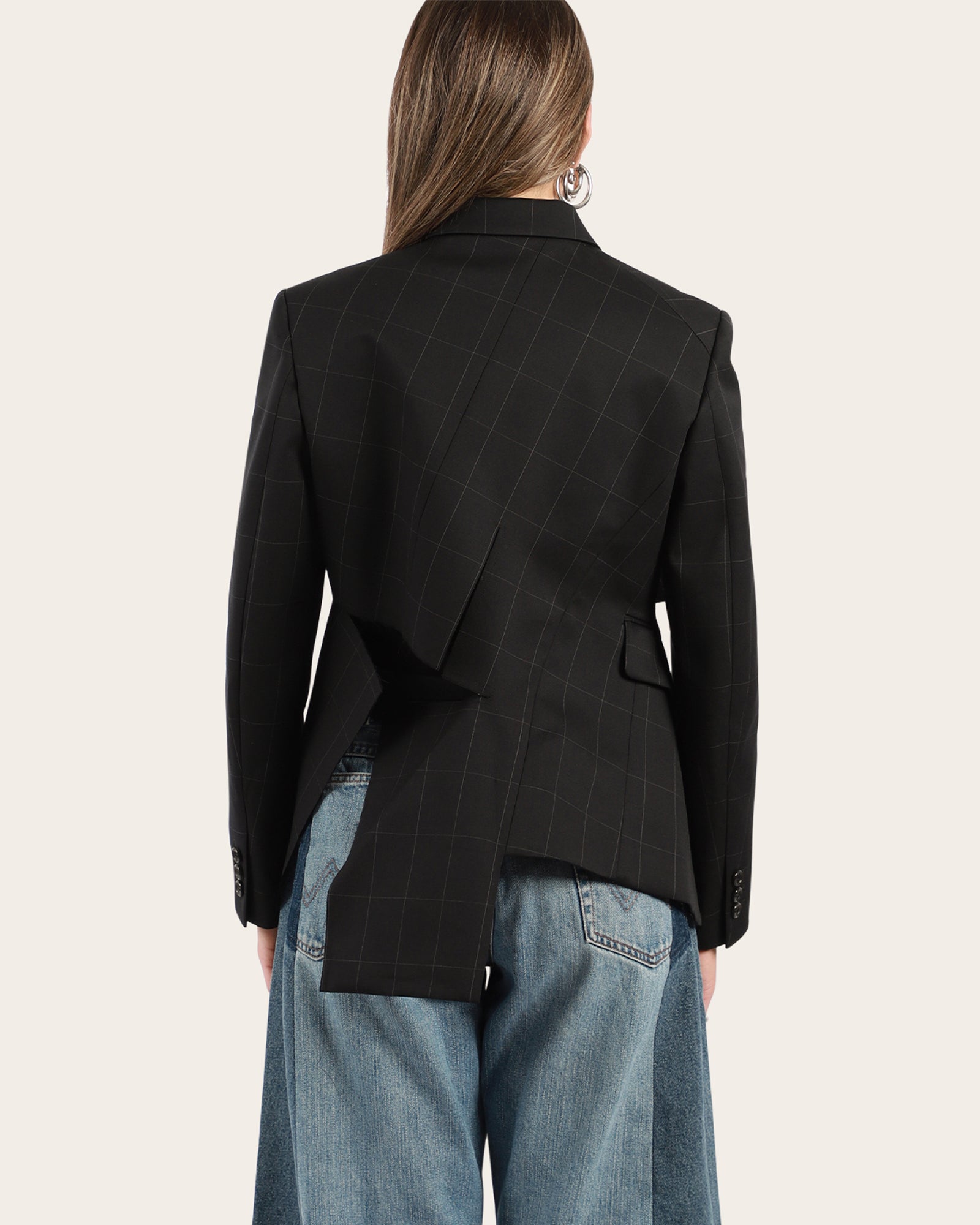 This tailored jacket reimagines classic suiting with a bold, deconstructed silhouette. Crafted in a sleek black check pattern, it features a layered cropped overlay that creates a striking asymmetrical effect. Sharp lapels, structured shoulders, and front button closures bring a touch of traditional tailoring, while the unfinished hem and mismatched lengths add a contemporary, avant-garde edge. A statement piece designed to challenge convention and elevate everyday dressing. Perfect to pair with the matching Voluminous 3D Detail Skirt from Comme Des Garcons. Made in Japan.