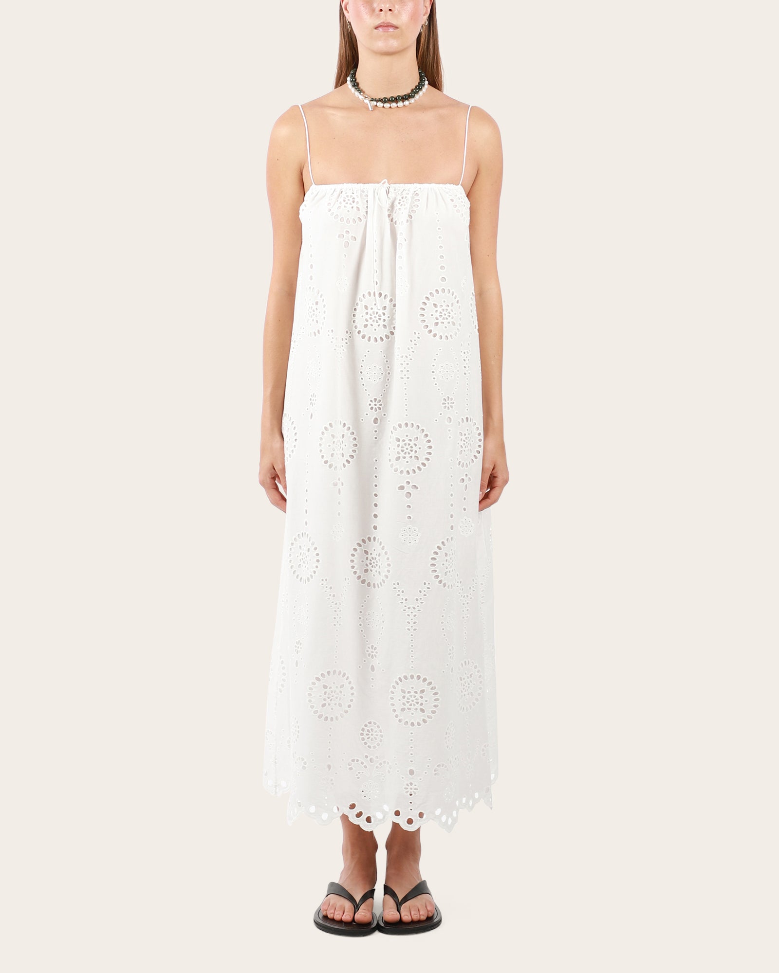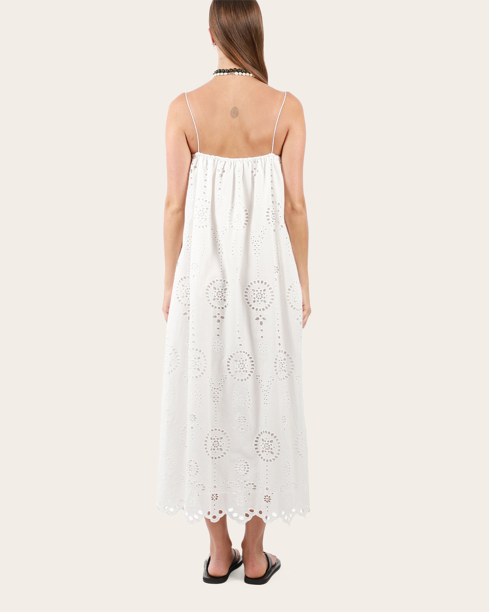 Inspired by vintage charm, the Broderie Cami Midi Dress showcases delicate floral embroidery, slender straps, a softly gathered neckline, and a scalloped hem. Fully lined for comfortable wear, it transitions effortlessly from beachside days to evening drinks.