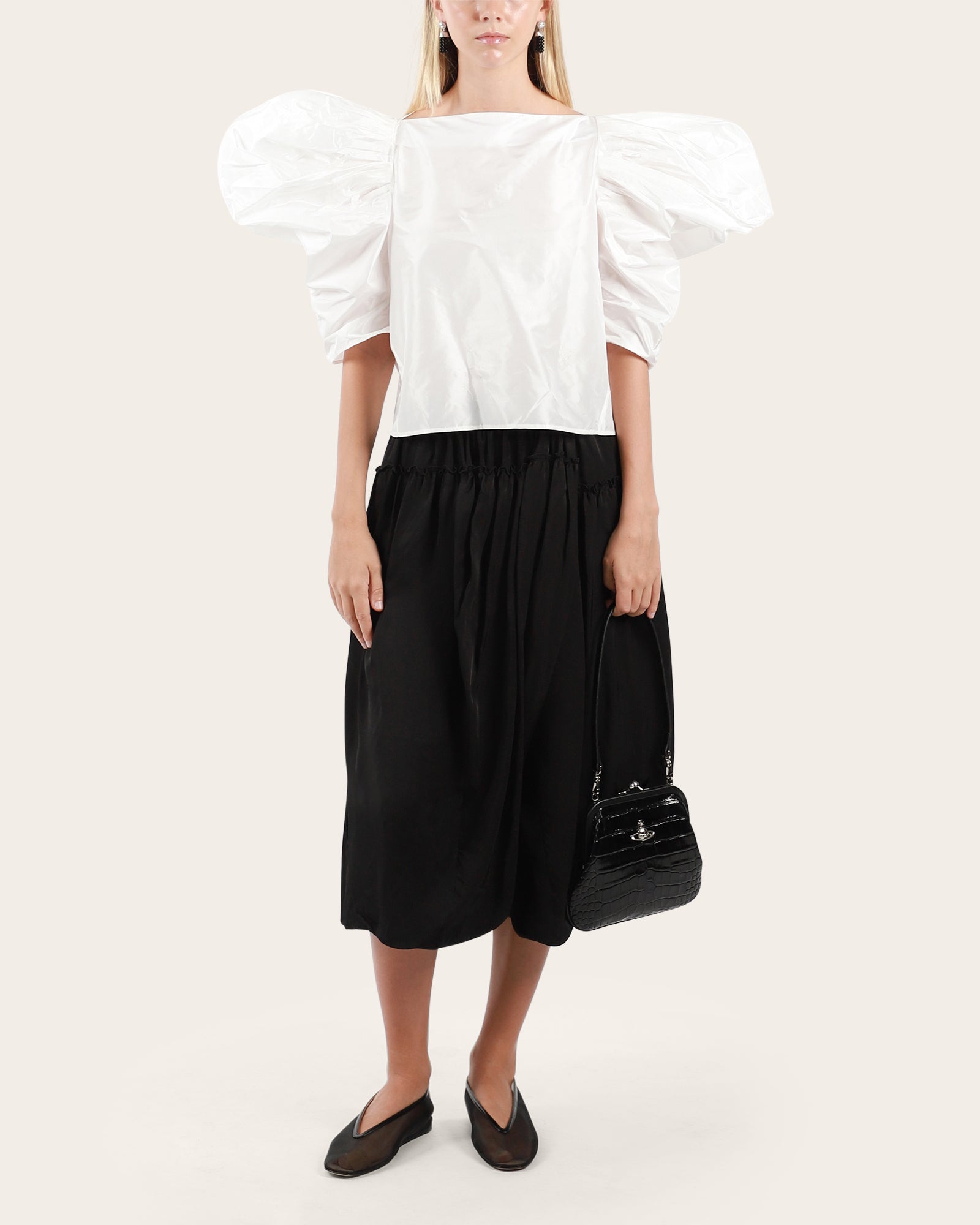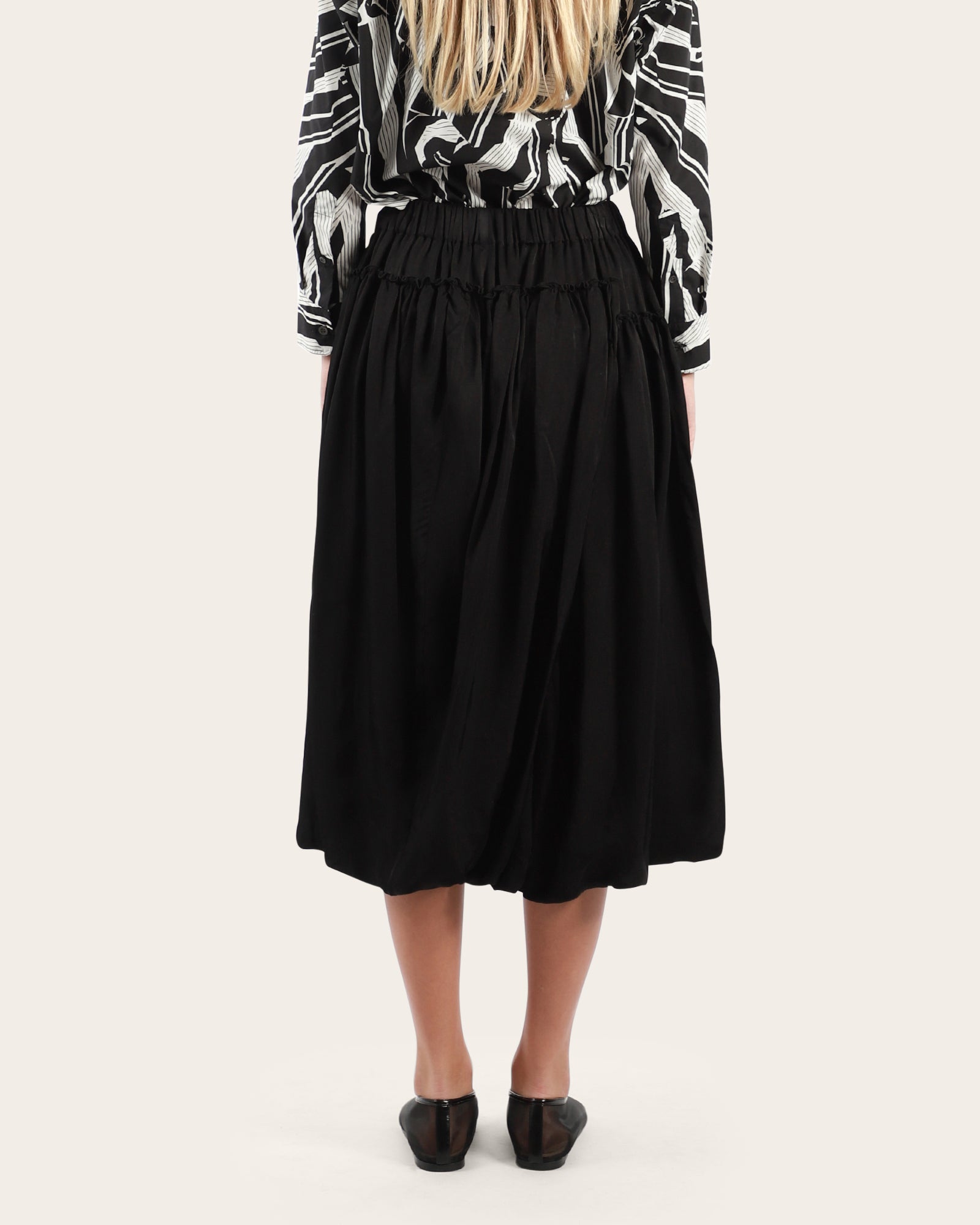 This special piece is carefully designed with attention to shape and details. The mid-length skirt falls just below the knee and features small asymmetric ruffle details for a unique touch. The fully elasticated waistband ensures comfort, while hidden side pockets add practicality.
