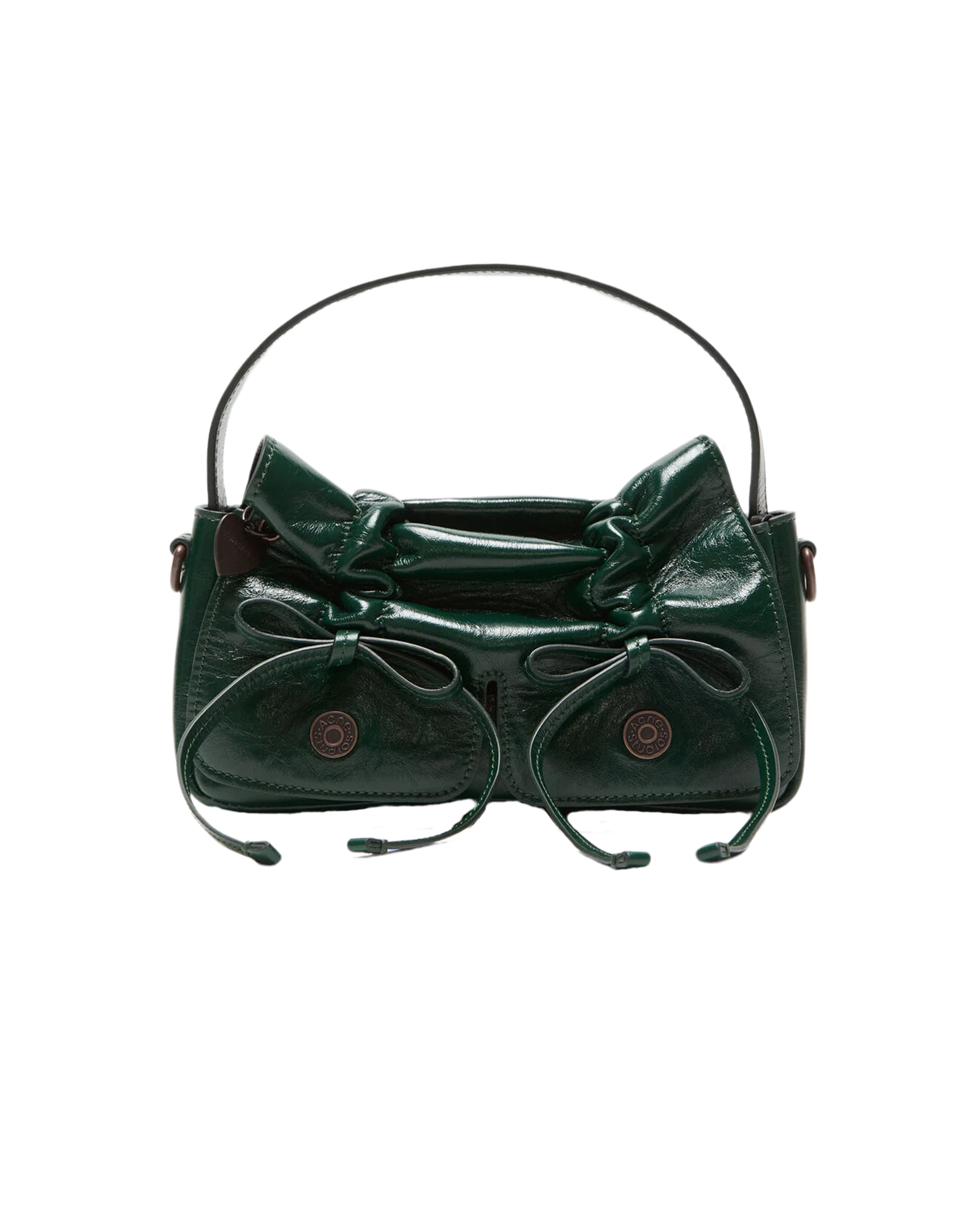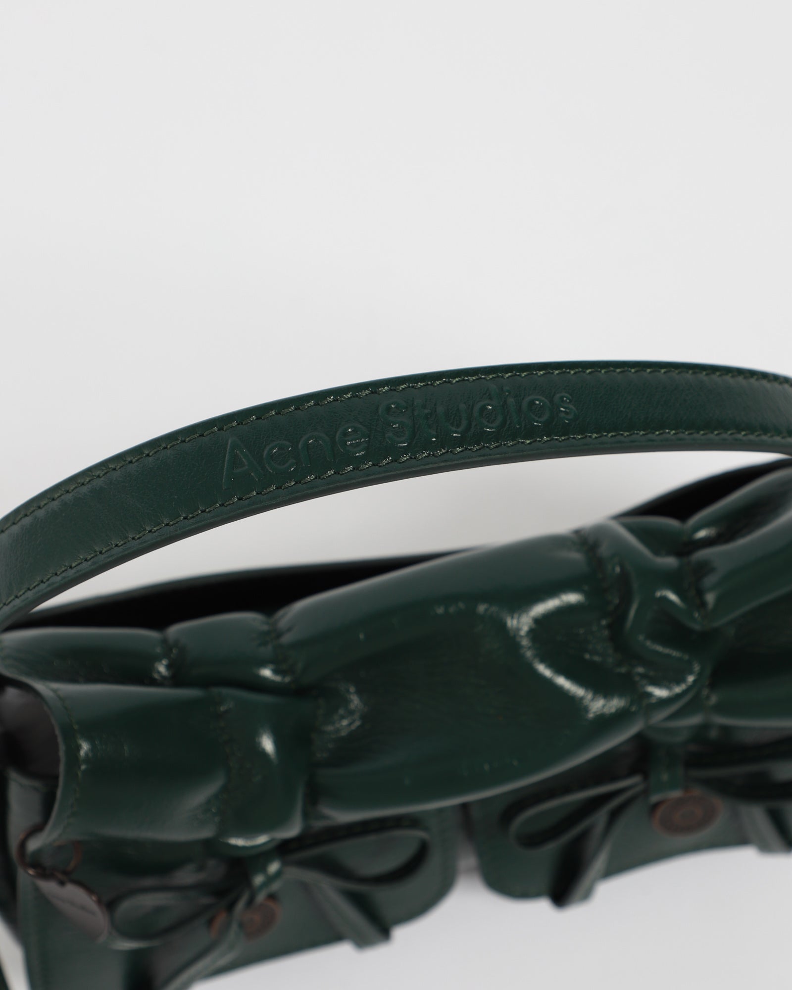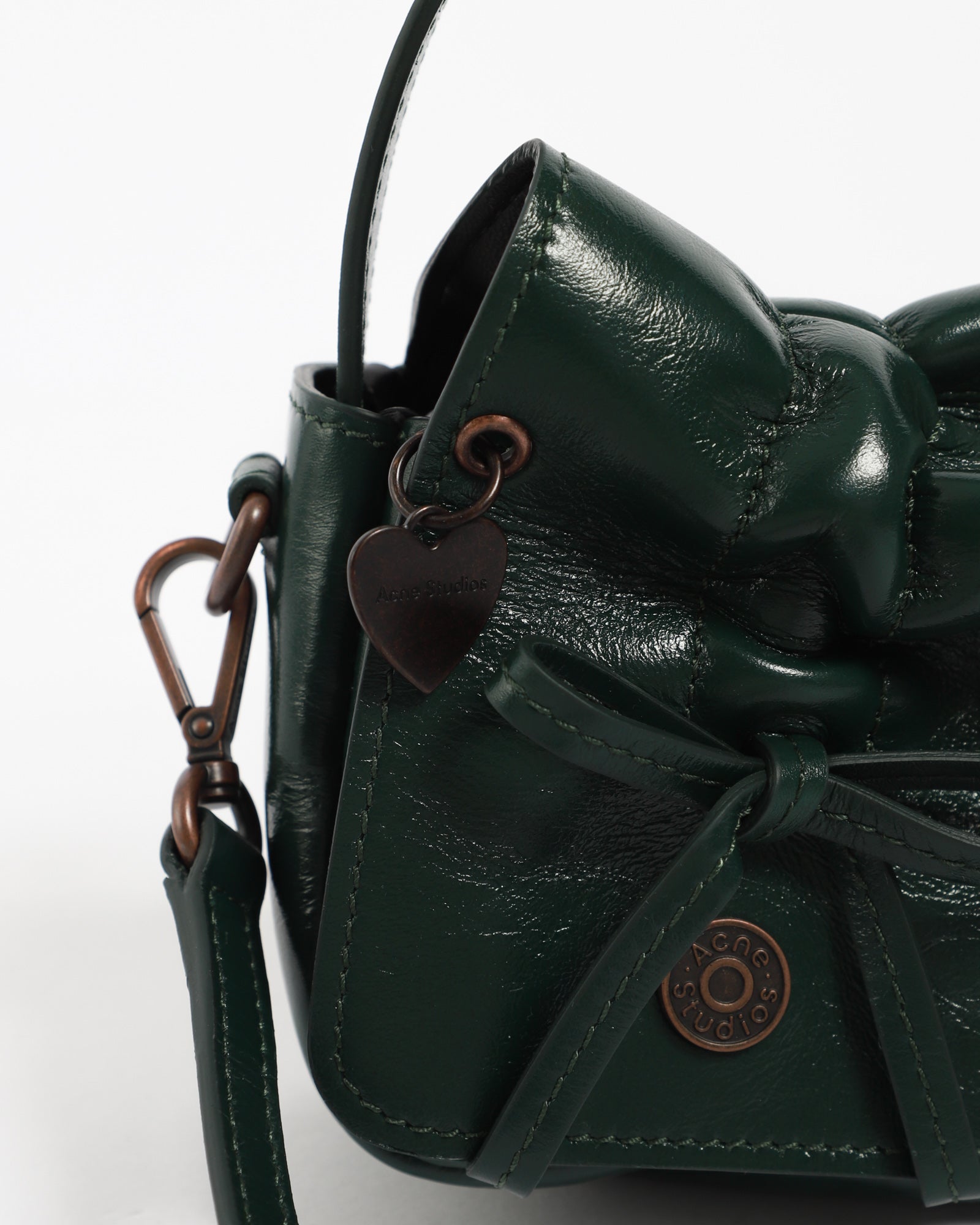 The Multipocket Micro Bag is crafted from leather with a smooth shiny finish and laced knot detailing. The flap pocket has a discreet magnetic closure and a spacious interior with a single compartment and a double card pocket inside. The top handle is embossed with the Acne Studios logo and includes both a top handle and a removable long strap. Made in Italy.