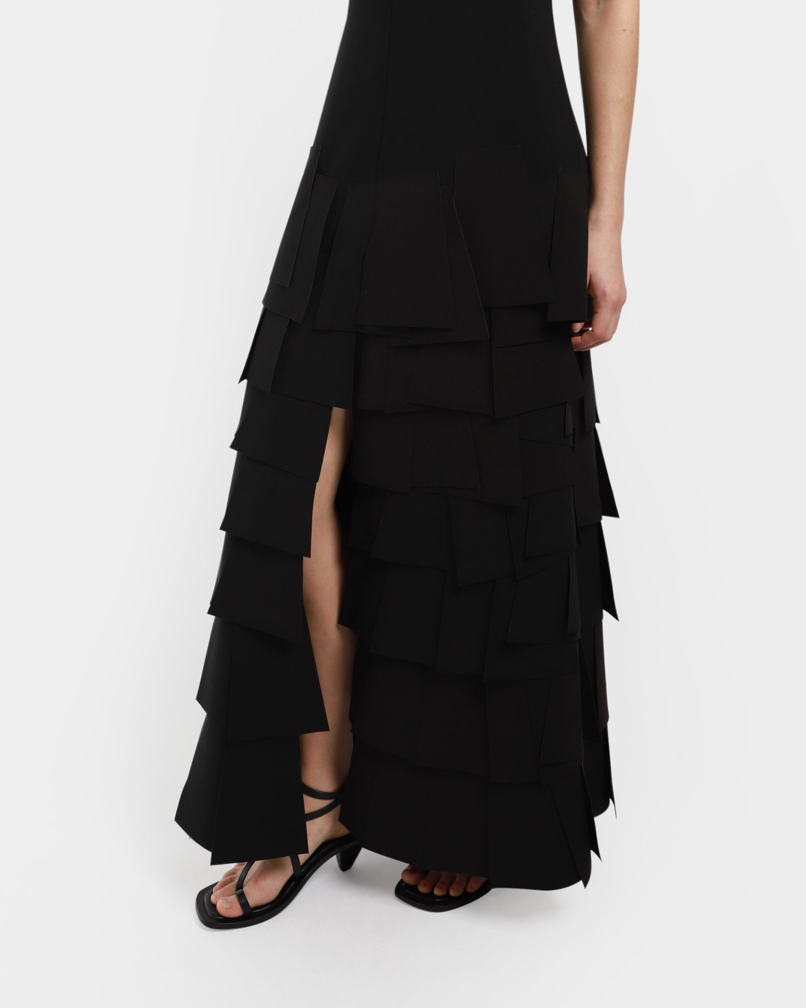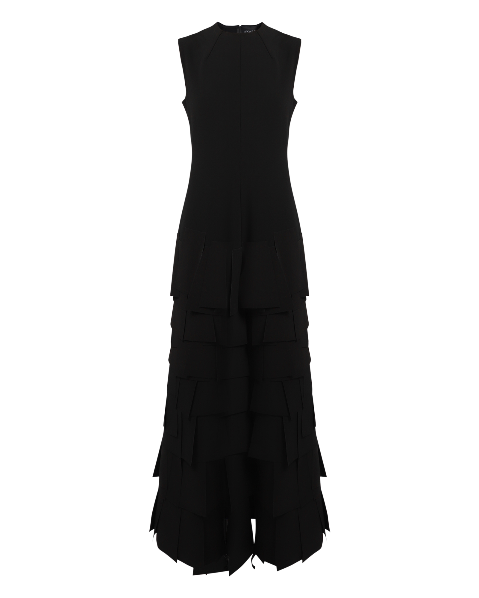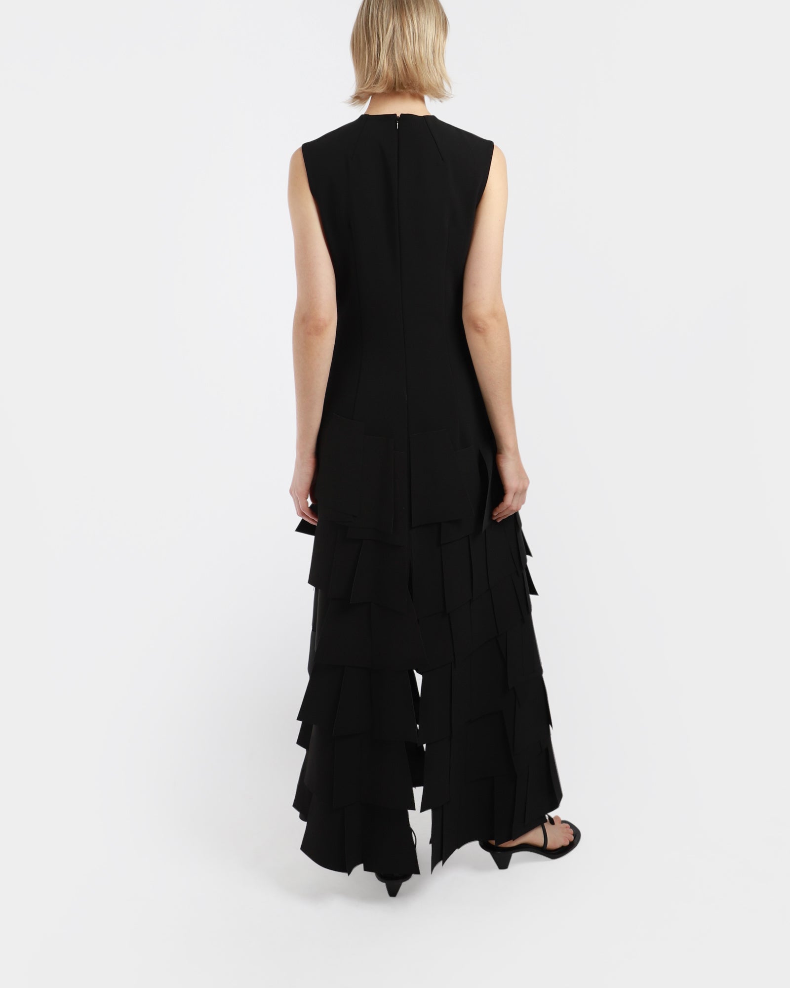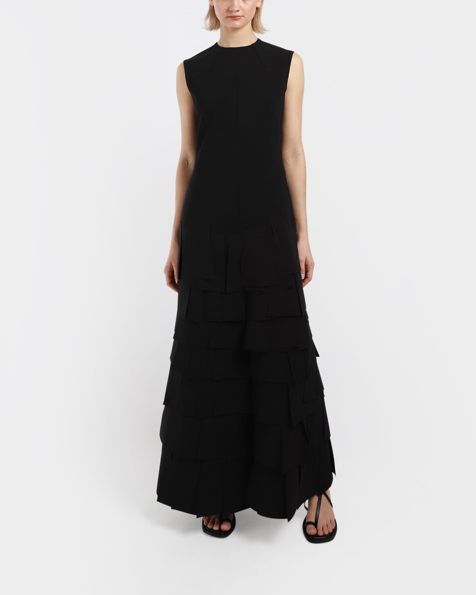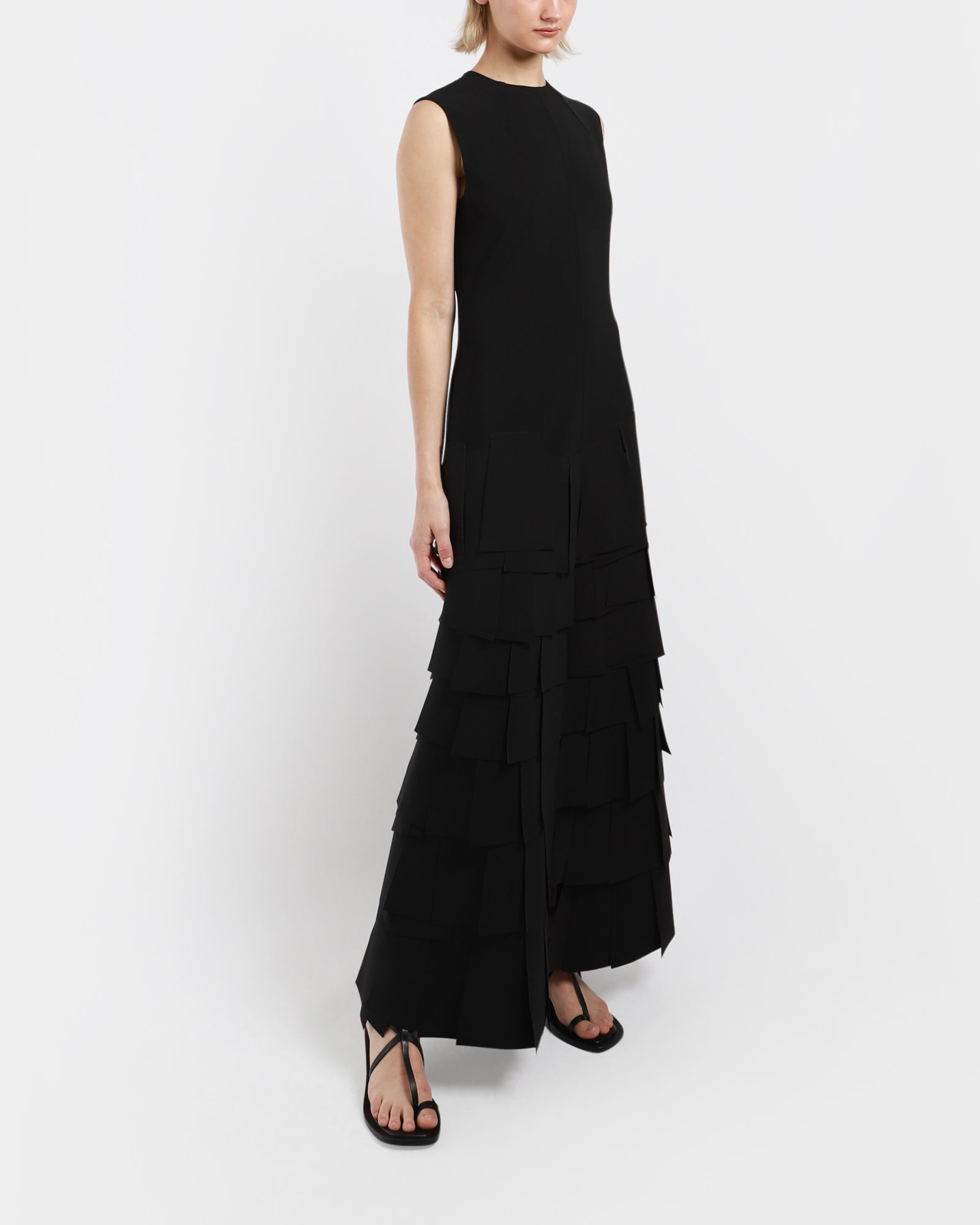 The Laser Cut Sleeveless Dress is a striking heavyweight design featuring large pleats at the skirt. It features a high neckline, a daring front slit and a concealed zip closure at the back. Made in Lithuania.